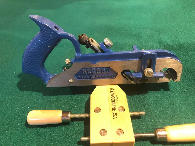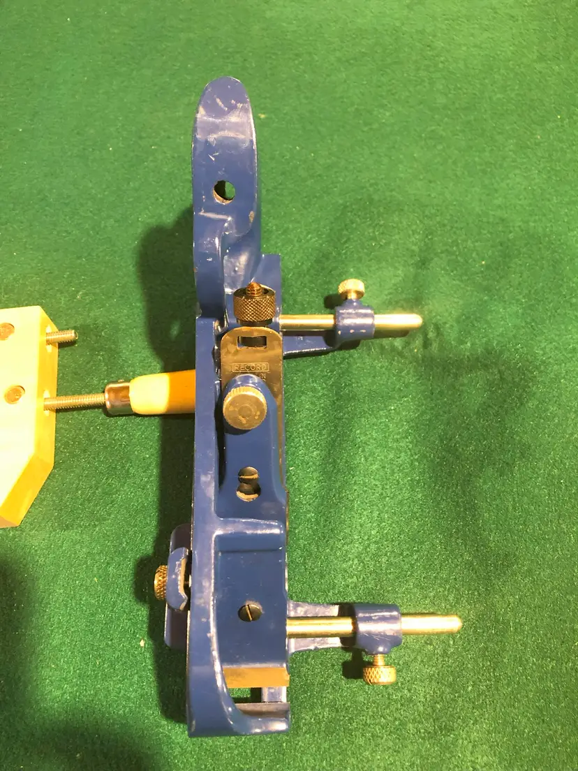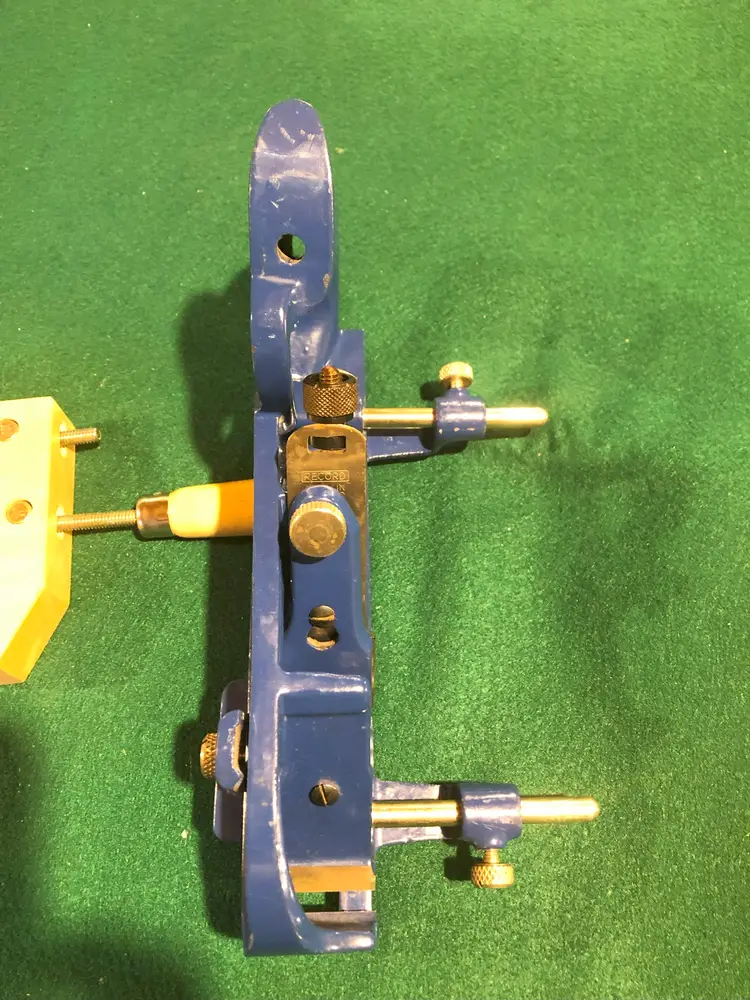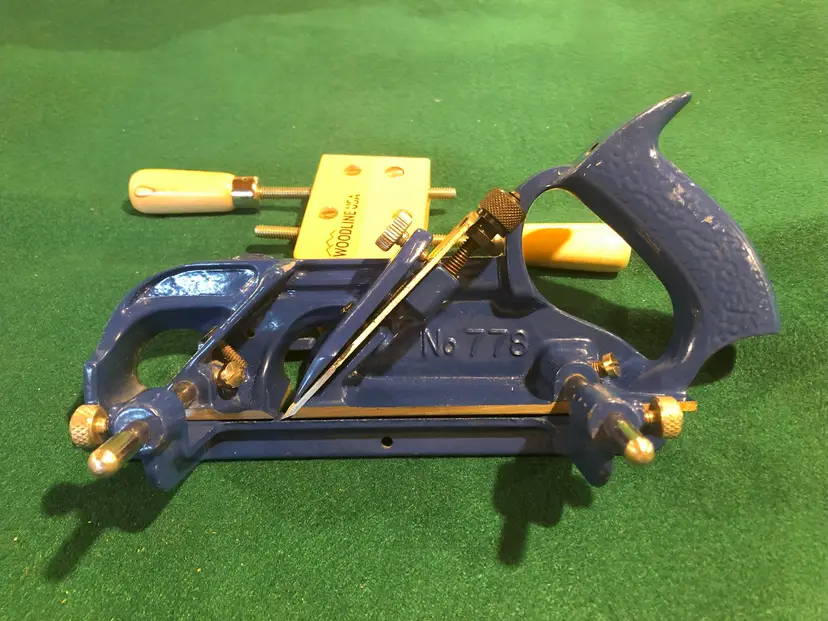 Record’s 778 plane had several differences/improvements from the original 78. First, the fence was mounted on two arms as compared to the original with one arm. This made for improved stability of the fence. In addition, blade adjustment was made with a screw adjuster as compared to the somewhat coarse lever adjuster on the Stanley. Finally, the fence on the 778 was drilled out to accommodate an auxiliary wooden fence as it sometimes advantageous to be able to have a longer fence to register against the workpiece.