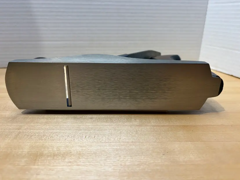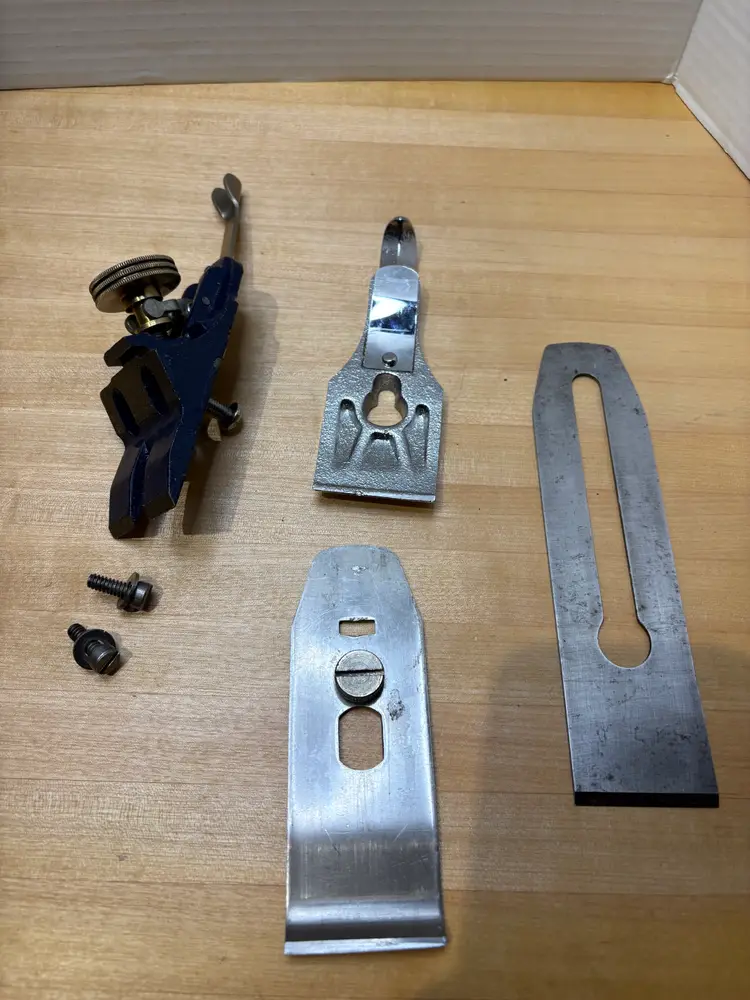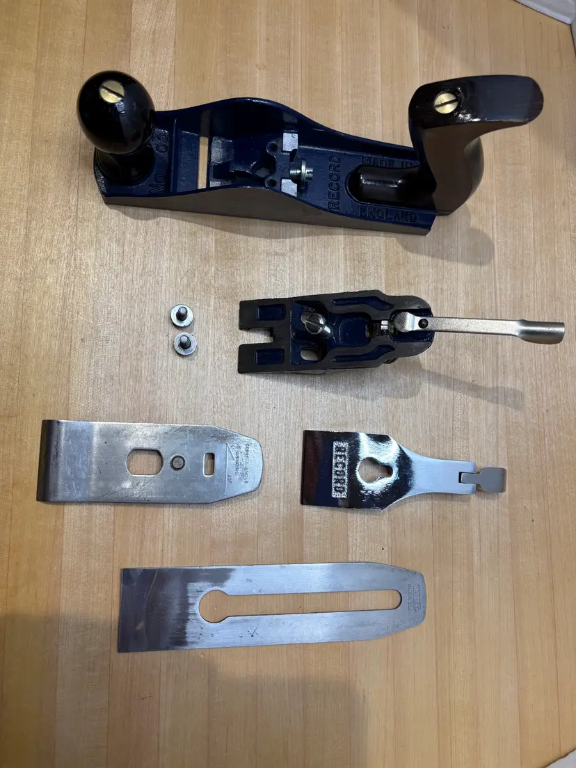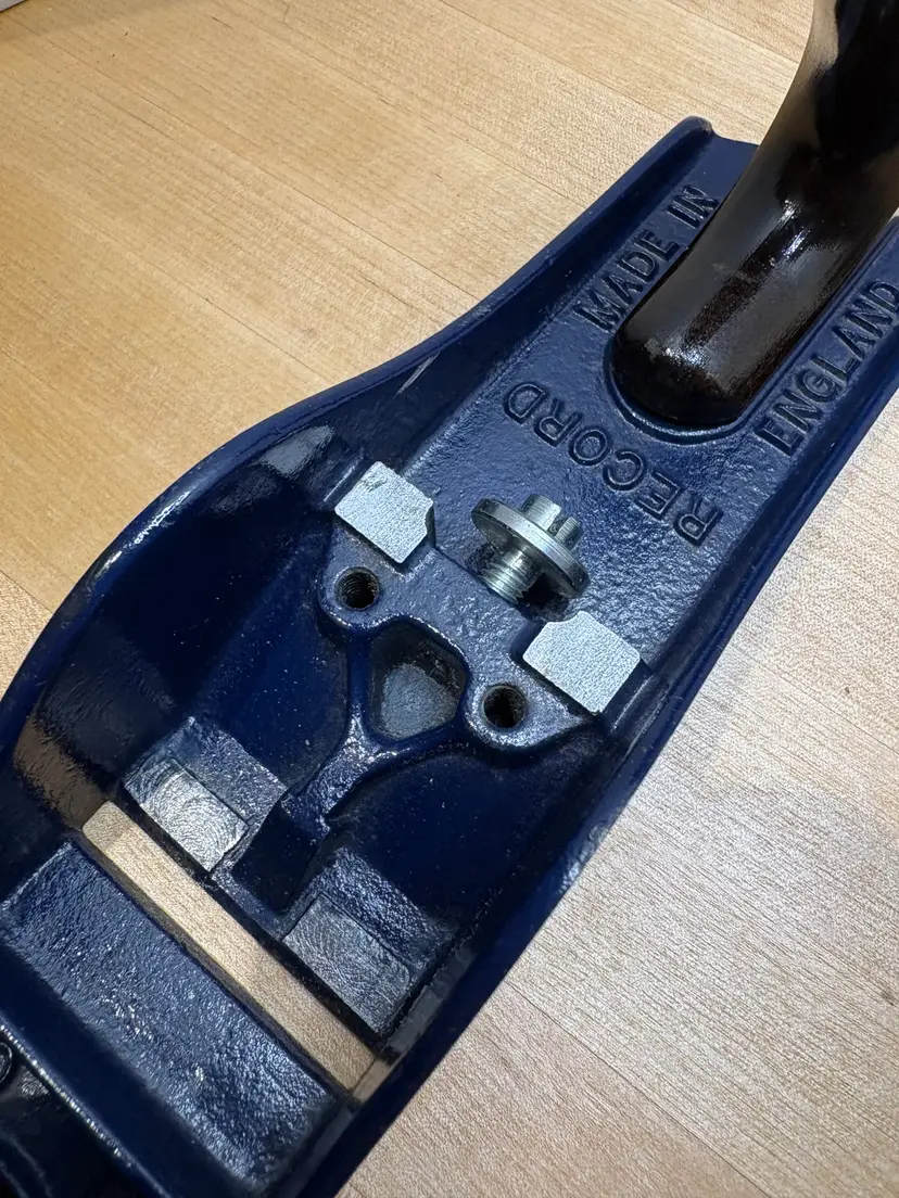 Hardwood tote and knob are excellent. Lever cap is a mirror finish. It came to me without an iron so I gave it a Stanley type 19 (1948-1961) iron that I had on hand. The iron is very close to full length. Has the frog adjuster screw and the frog bed on the body is similar to a Stanley Bailey type 19. It did not need much flattening and it is fully tuned including removing some paint on the body where it meets the frog to assure full metal on metal contact. Paint is excellent overall. Believe its from the late 1980's but I'm not a Record expert.