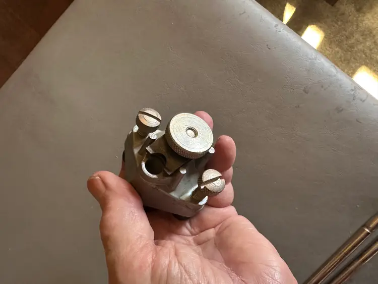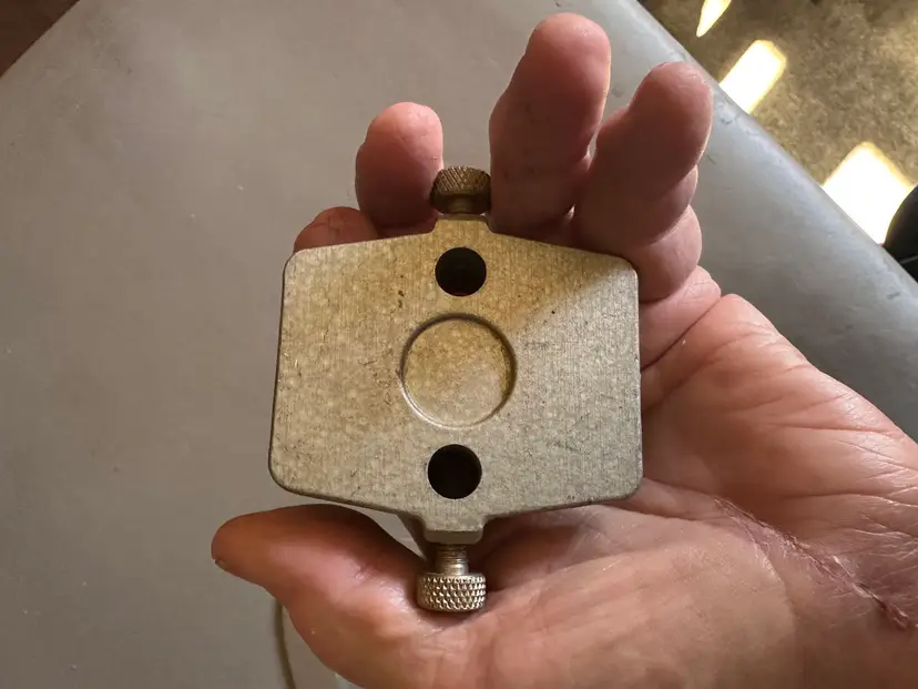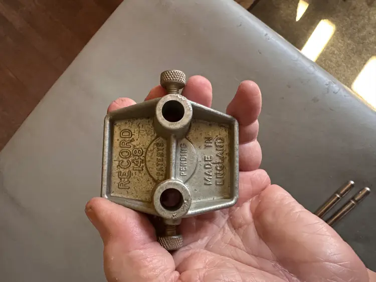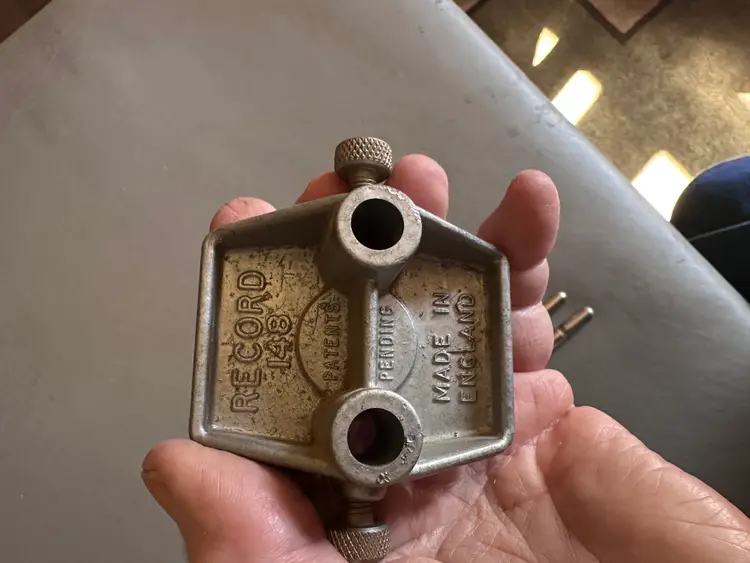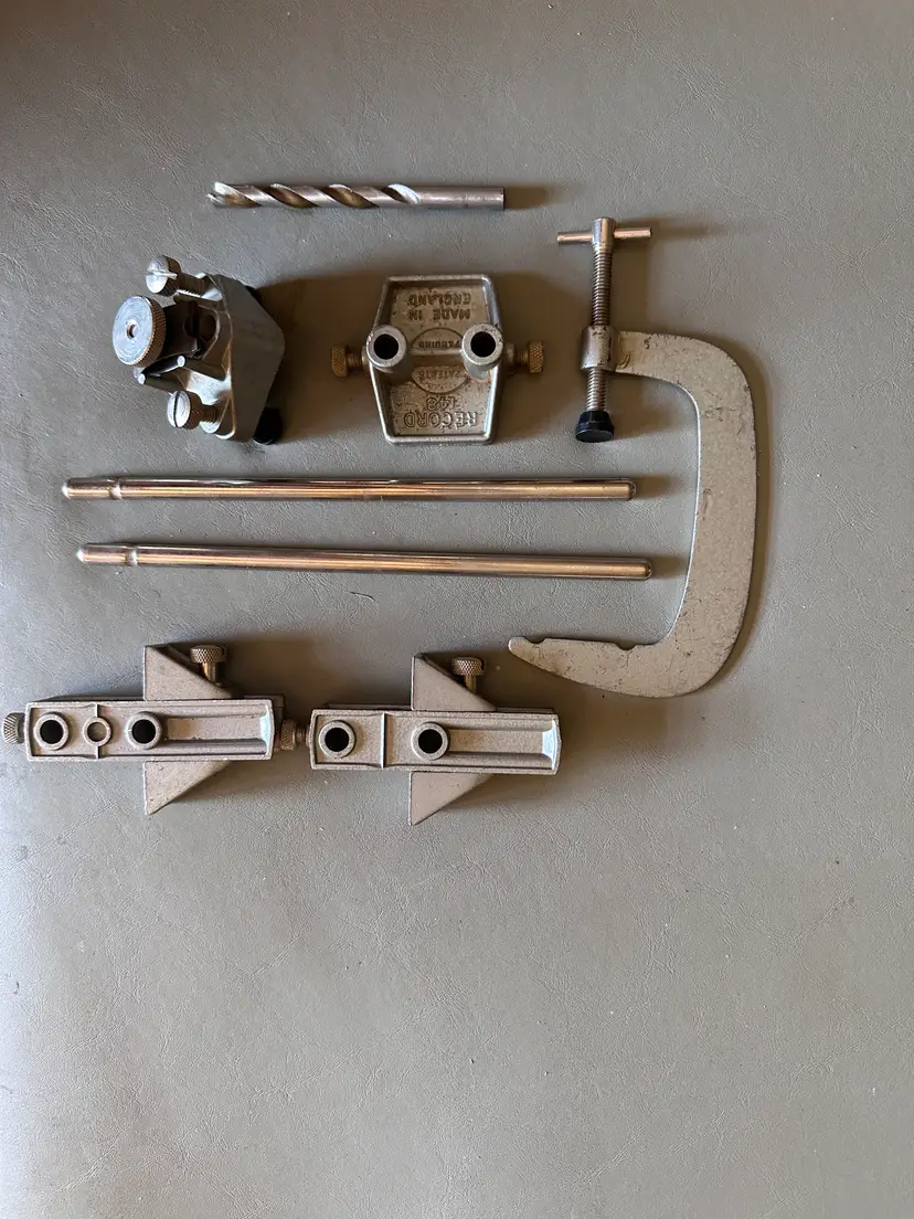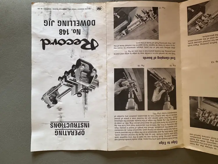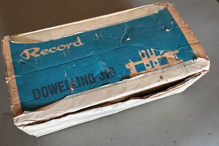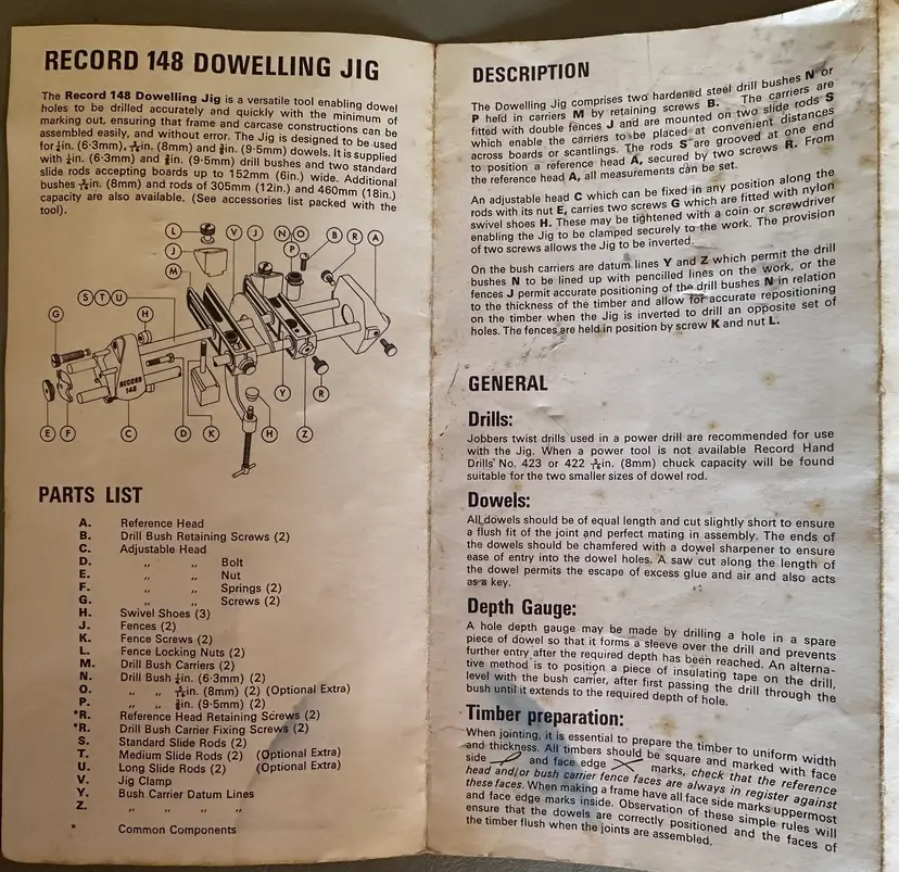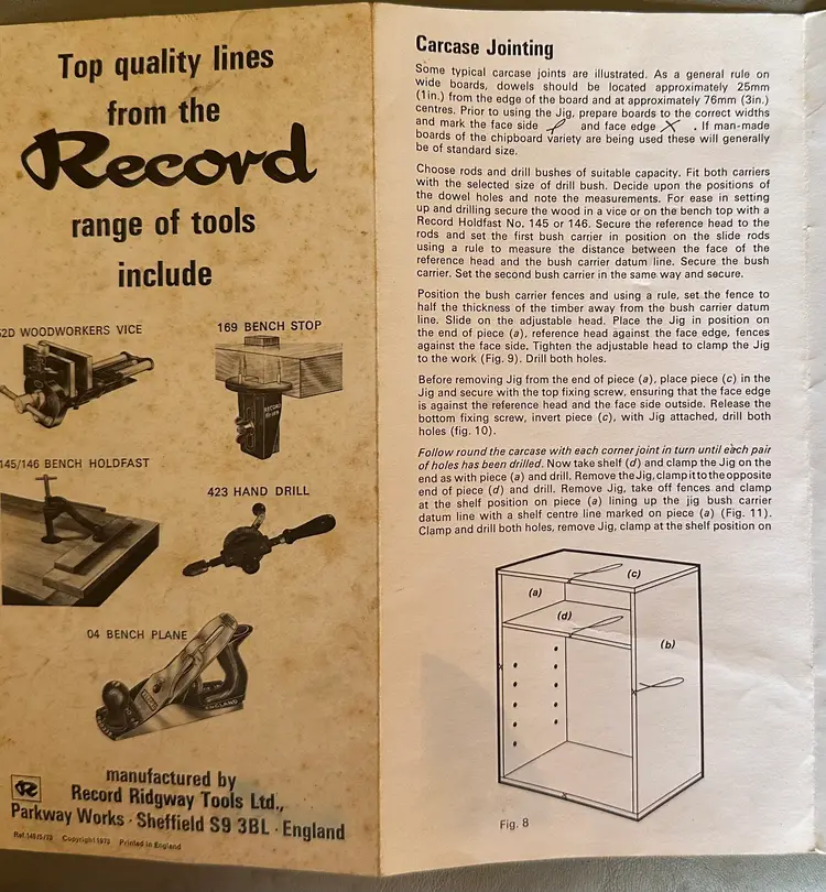 This is a Record No. 148 Doweling Jig, complete, and in immaculate condition except for the original display box, which is somewhat shopworn. It was manufactured in England, probably in the 1950s judging by costs quoted on an included parts order form, which prices parts in pence, each item less than £1 .