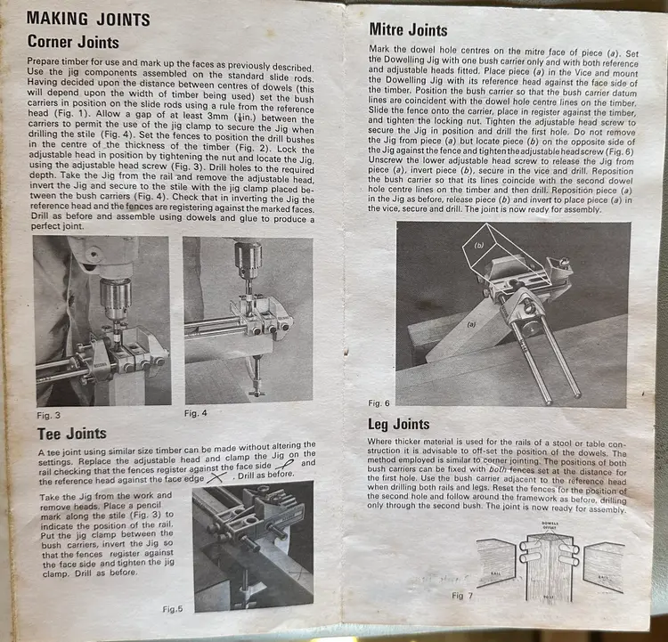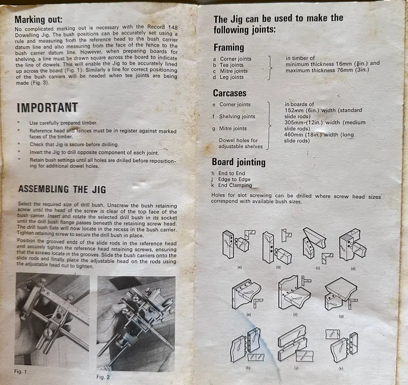This is a precision tool that can be used to assemble a large variety of doweled joints, including four types of Framing joints (Corner joints, Tee joints, Mitre joints and Leg joints), four types of carcase joints, (corner joints shelving joints, Mitre joints, Dowel holes for adjustable shelves) and Board jointing (End to End, Edge to Edge and End Clamping). Read the complete instructions in the attached images for more details.