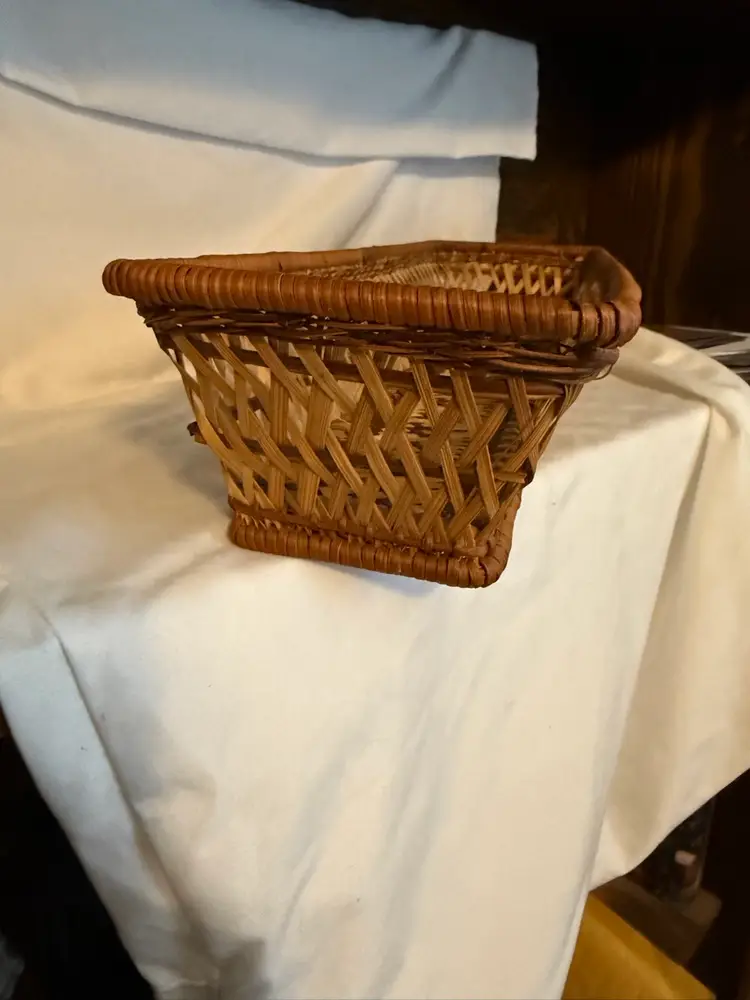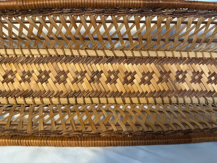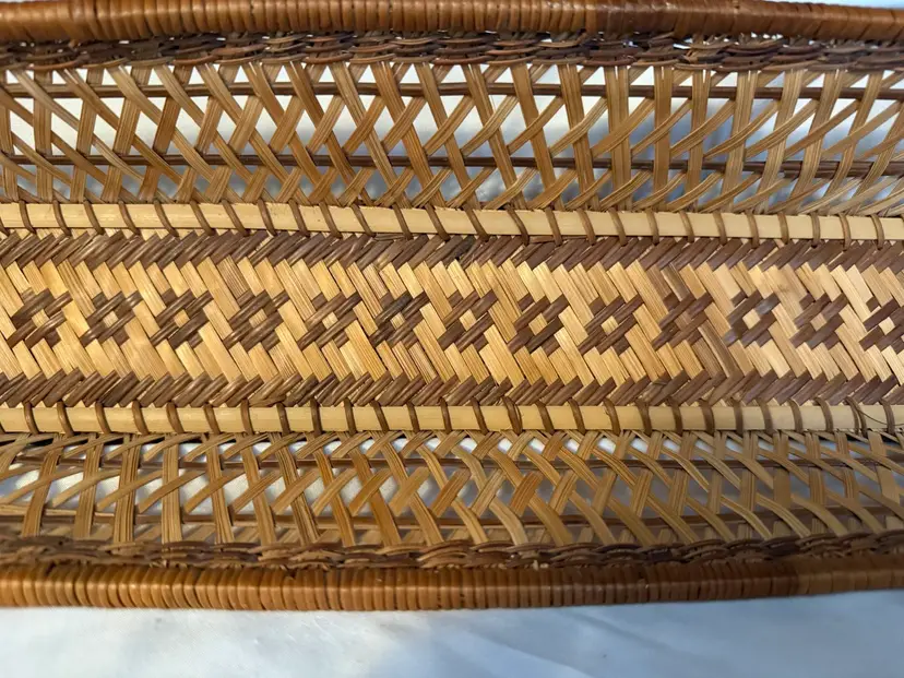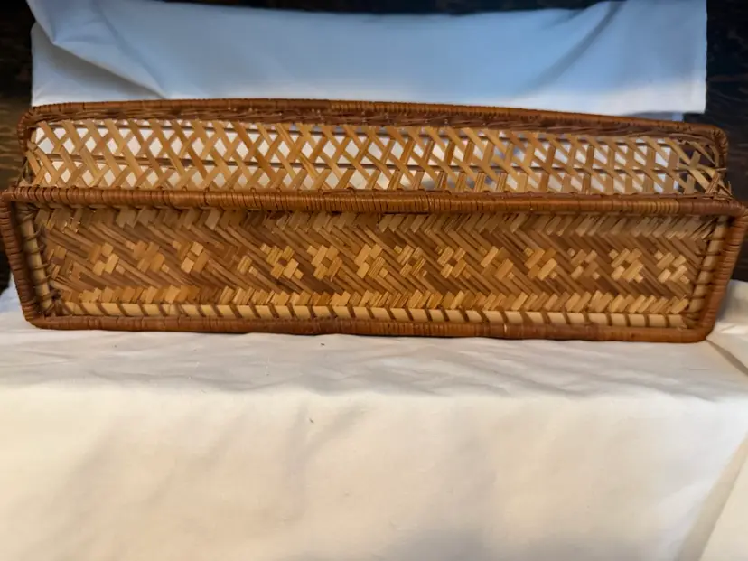 Pretty rectangular basket with unique woven design. Perfect as a bread or roll basket! Measures about 17 1/2 inches long and 3 inches high.
