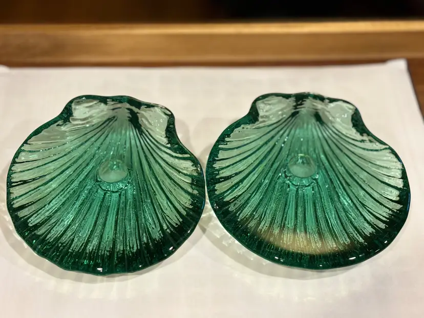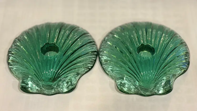 Beautiful set of 2 sea green recycled glass candle holders/ paperweights. No chips or cracks. Approximately 4 1/2” diameter.