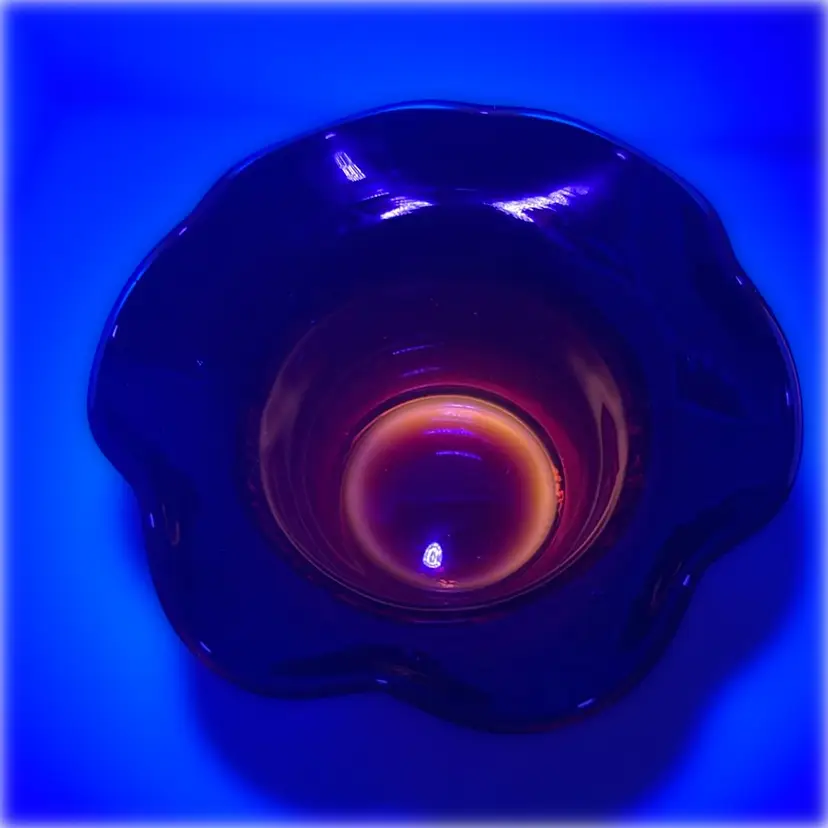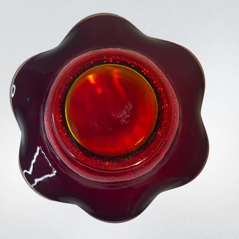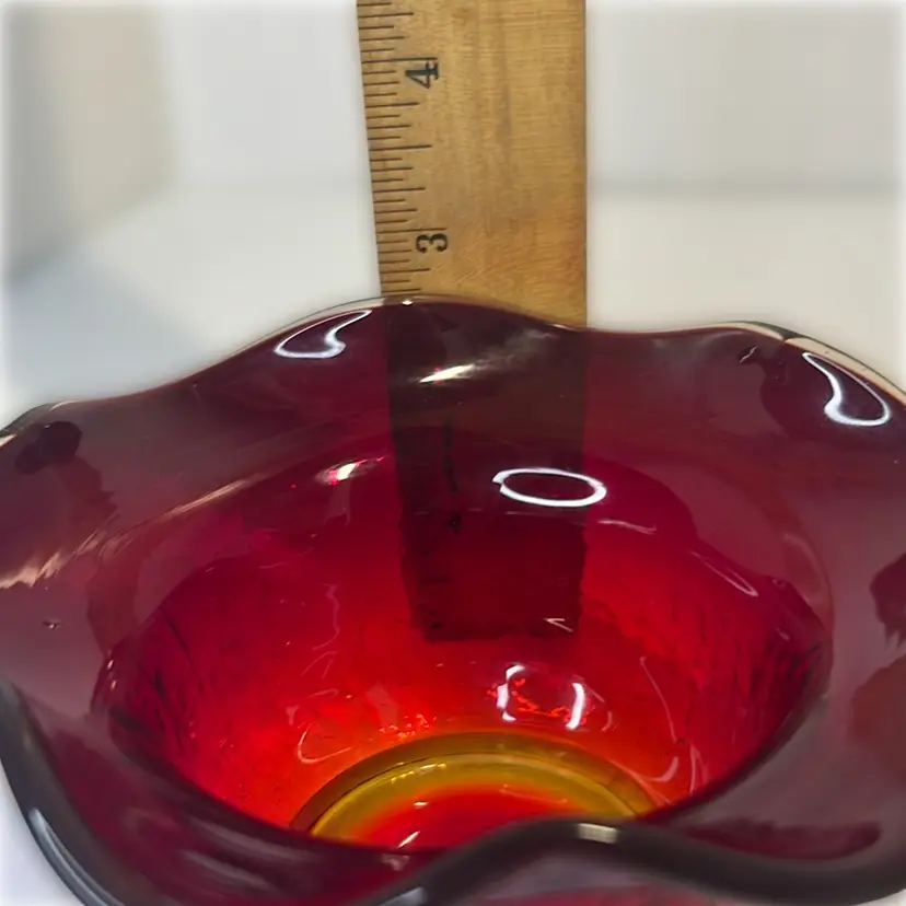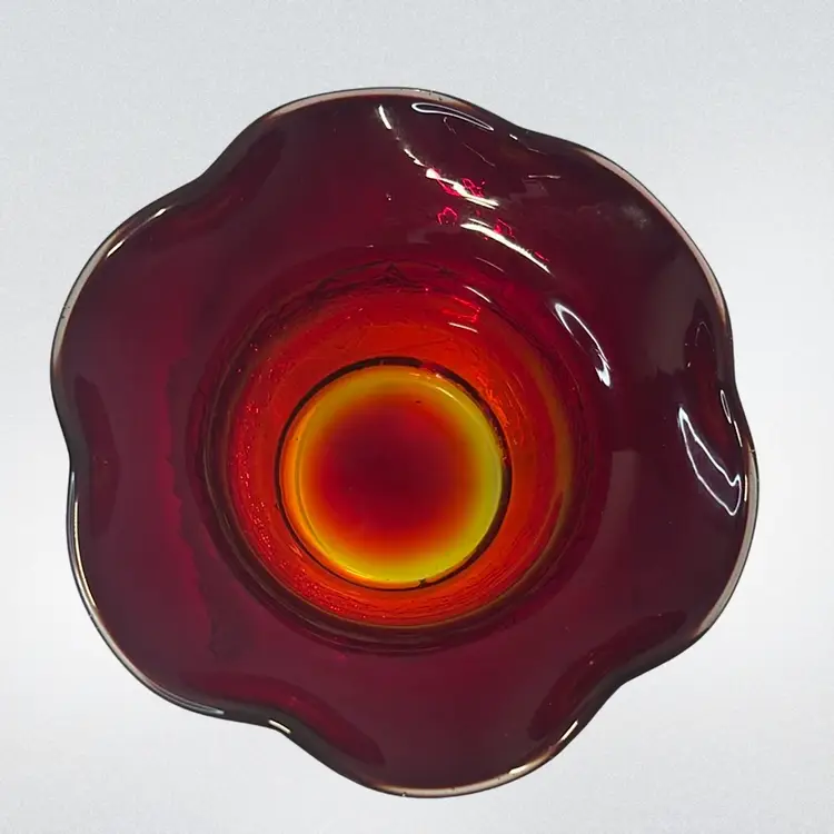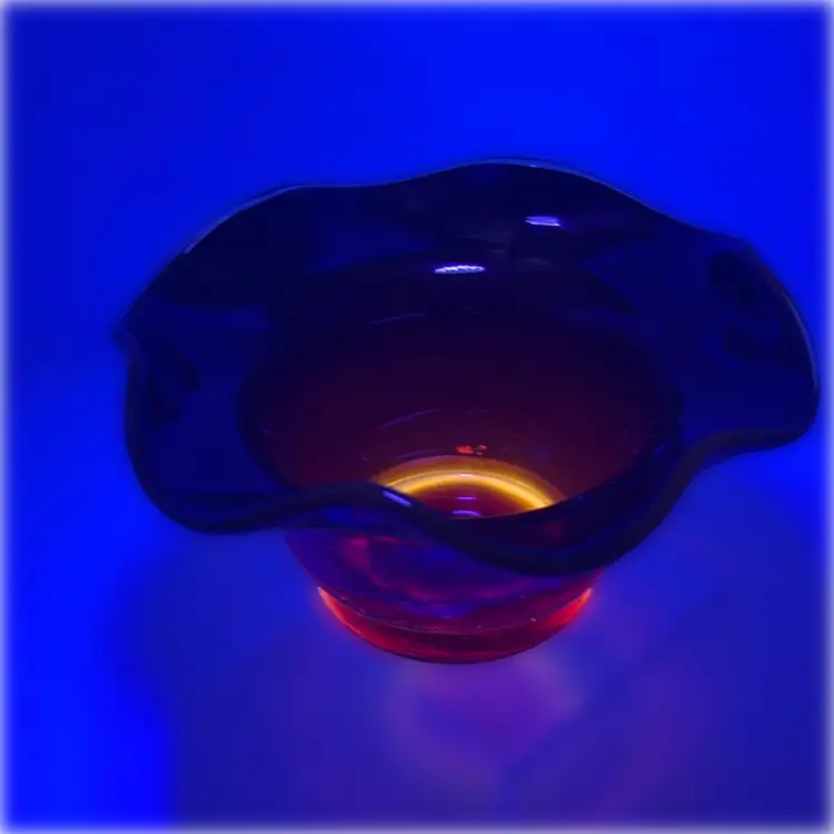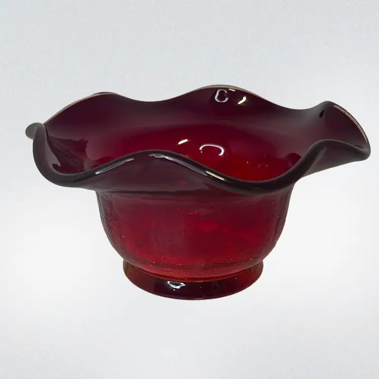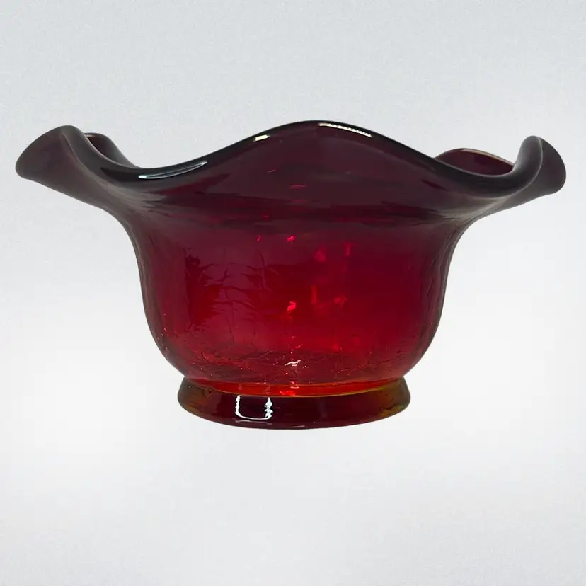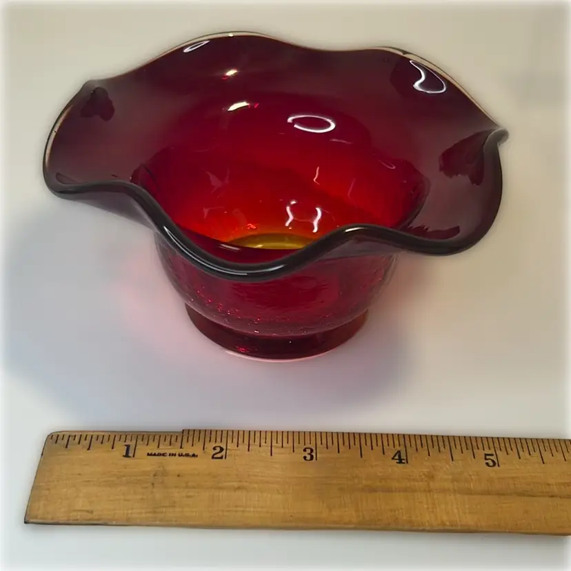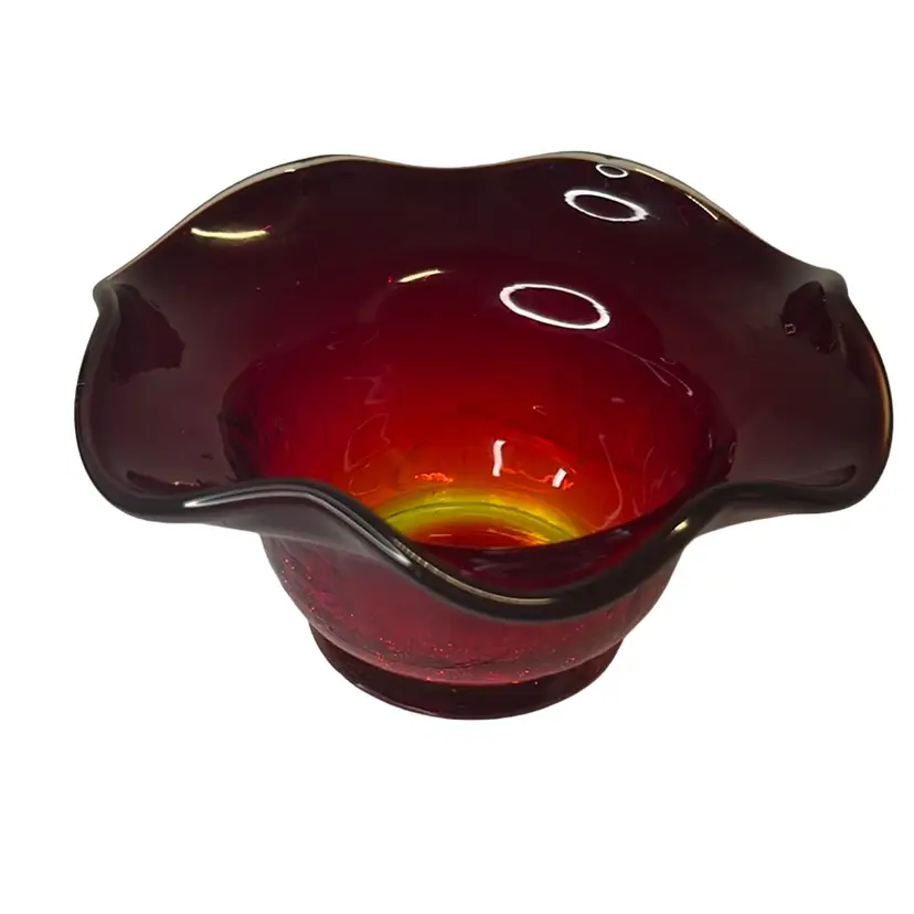 This red amberina ruffled edge bowl has a yellow base that glows. Gorgeous crackle glass. Possibly Kanawha.