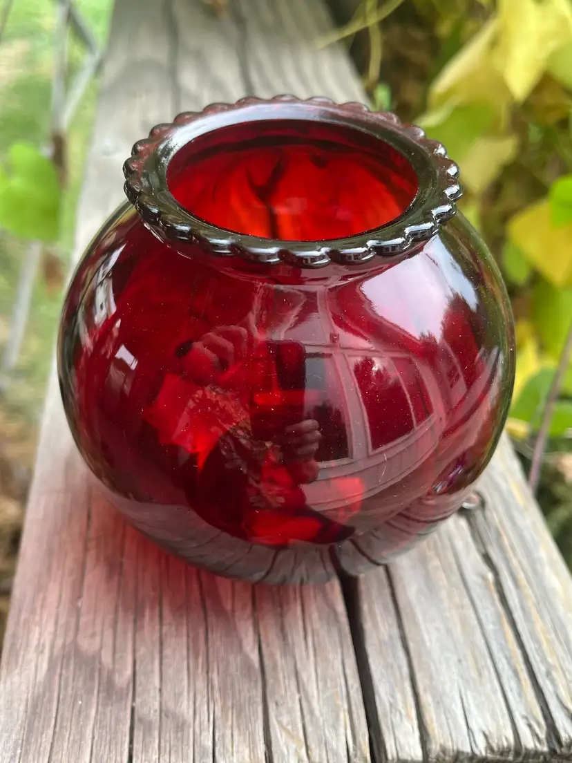 A vintage red glass Anchor Hocking Ball Vase. A beautiful rich red. There are so many ways to use this besides display or floral vase. Approximately 3 3/4 inches tall and 3 3/4 inches wide. Free of any nics and such.