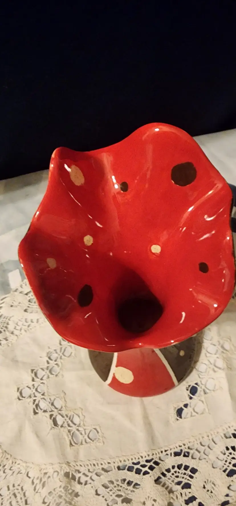This unique vase features a striking red and black swirl design with playful polka dots. It's in excellent condition with no chips or cracks. Perfect for adding a pop of color to any room. Artist signed on bottom. 7.5 inches tall and 4 inches wide.