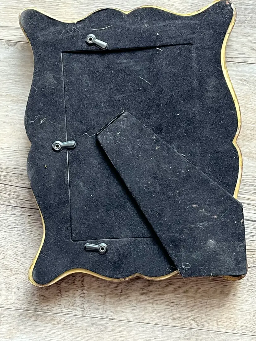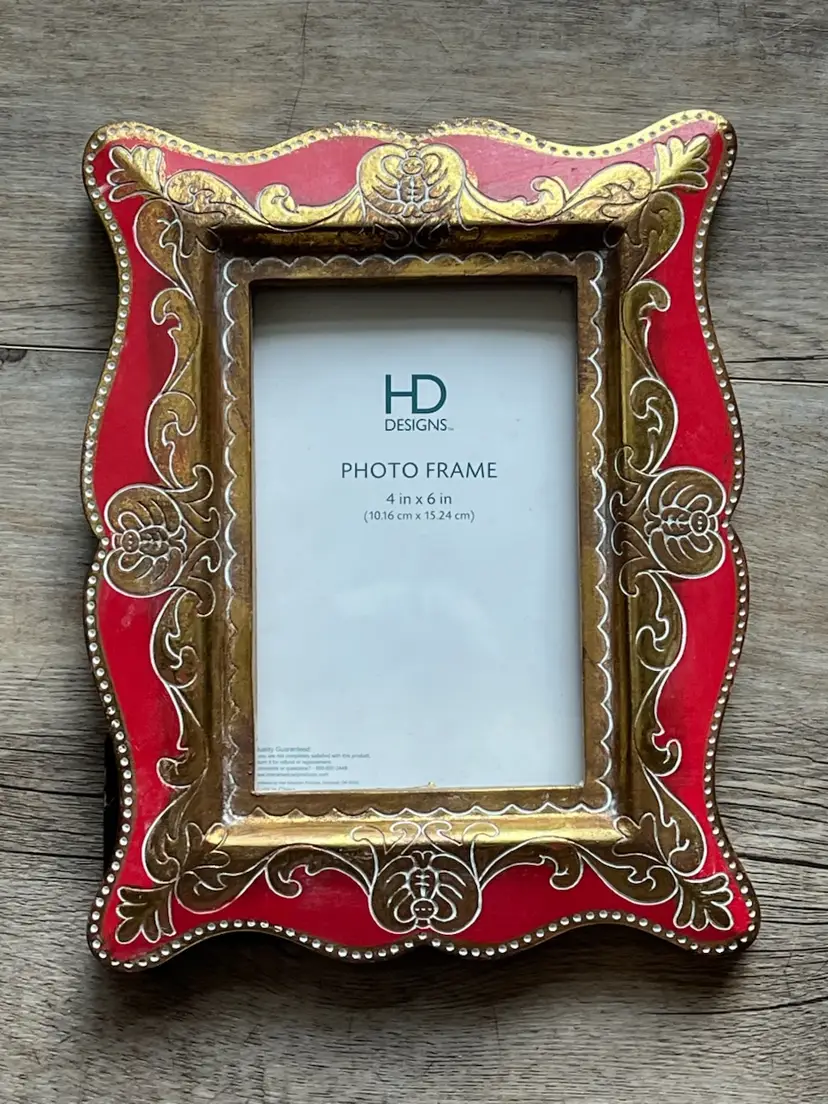 A red and gold HD Design photo frame. The frame size is approximately 9 inches tall and 7 1/4 inches wide. Fits a 4" x 6" photo. I think it is made of resin. It looks like a very high end photo frame.