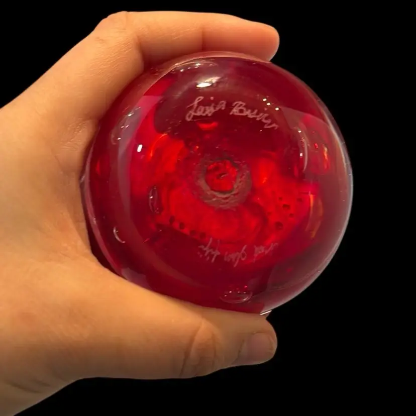 Red And Orange Galaxy Swirl Hot Glass Fiji Paper Weight signed by artist at bottom