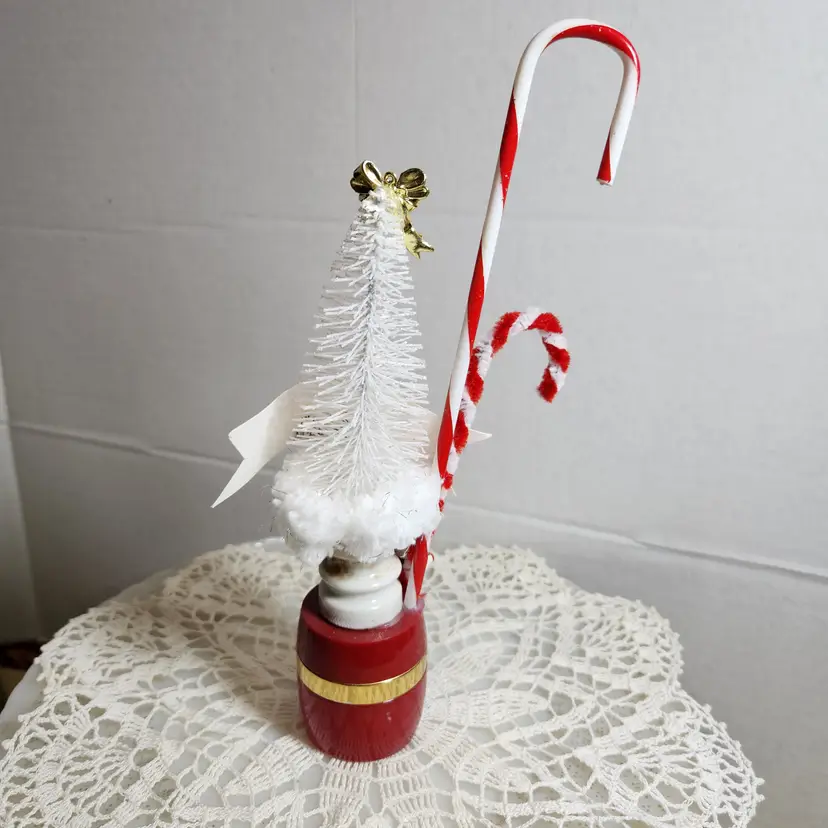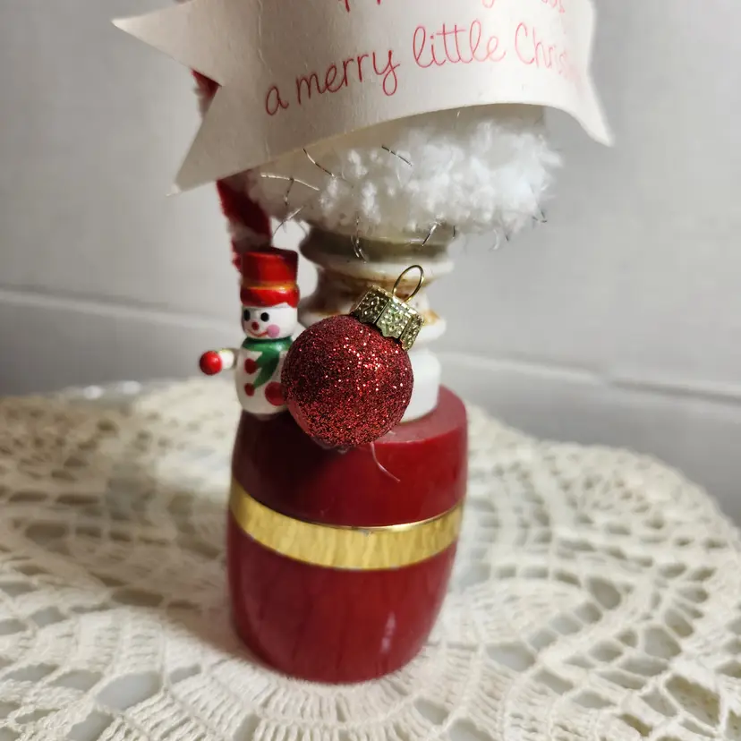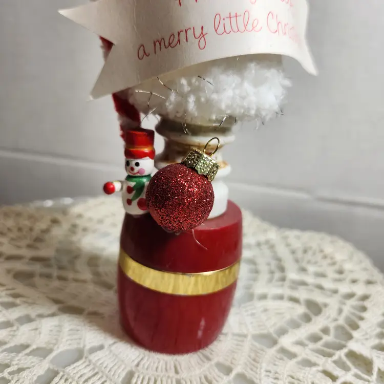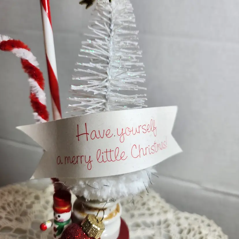 Sitting on a vintage Avon jar this simple assemblage is a spot of cheerfulness to brighten up a corner. Candy canes and a white tree with the message "Have yourself a Merry little Christmas"