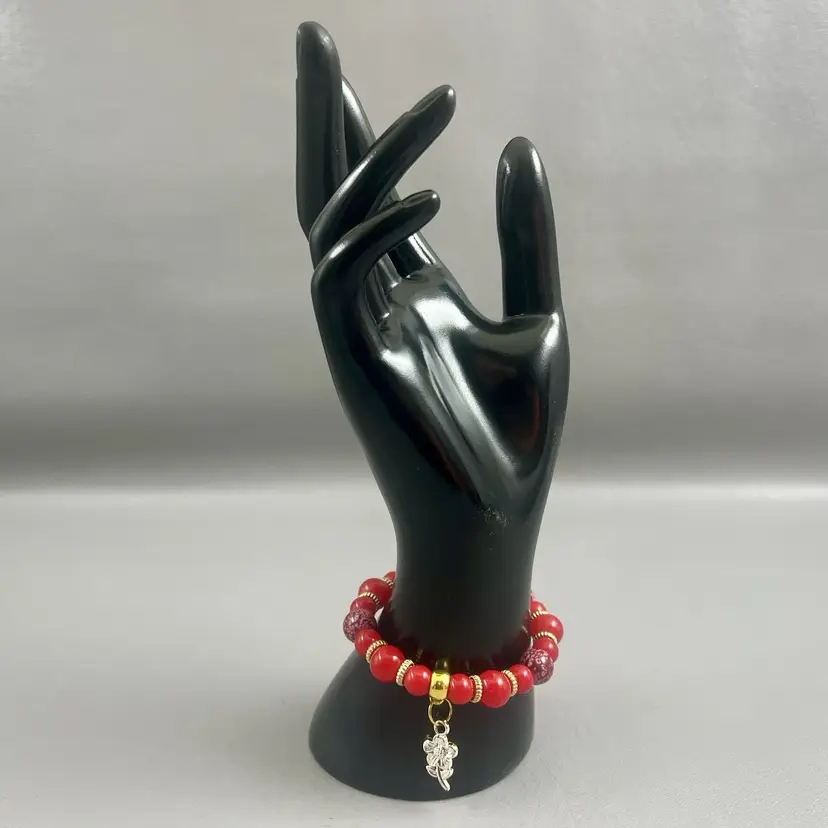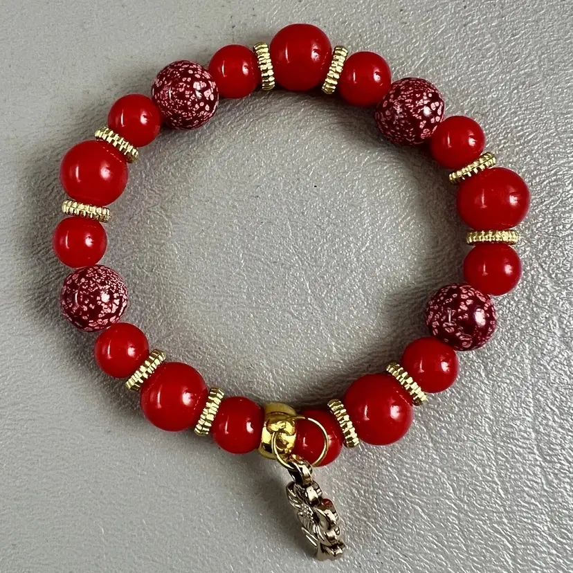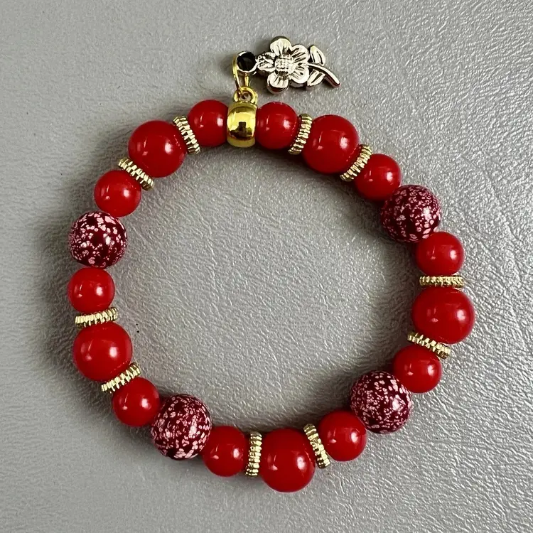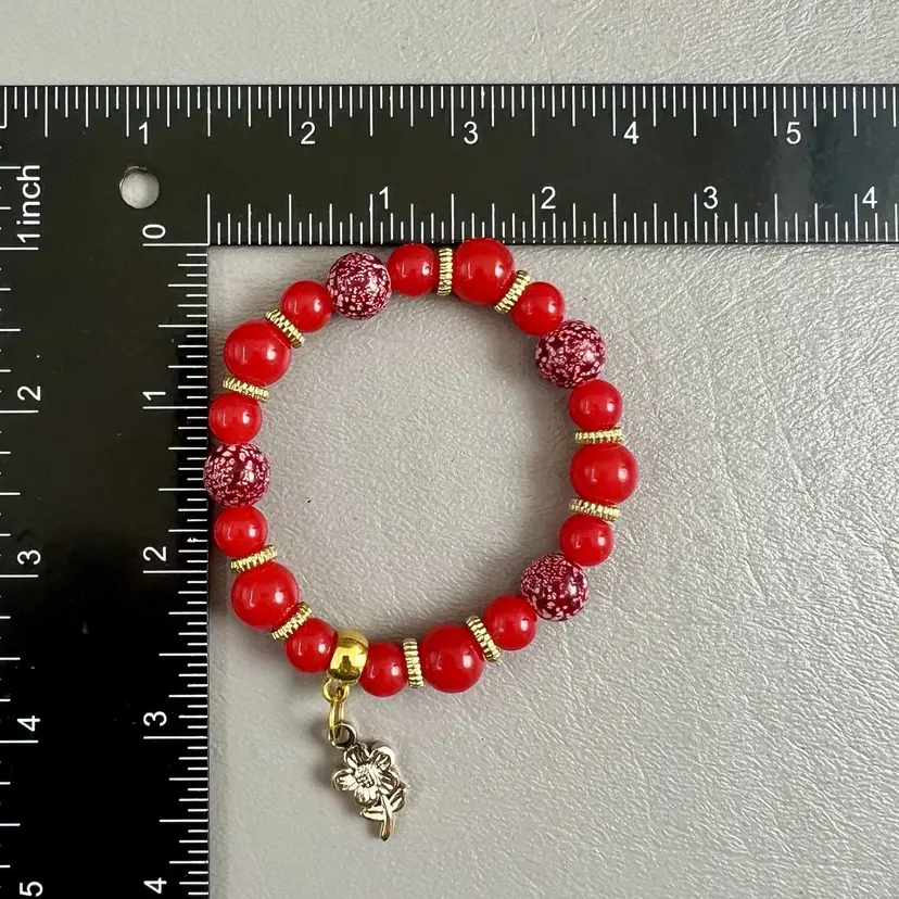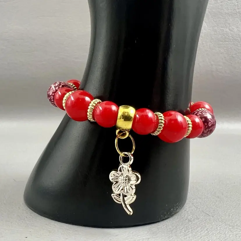 Red Beads Gold Tone Stretch Bracelet Silver Tone Daisy Charm 2.5"