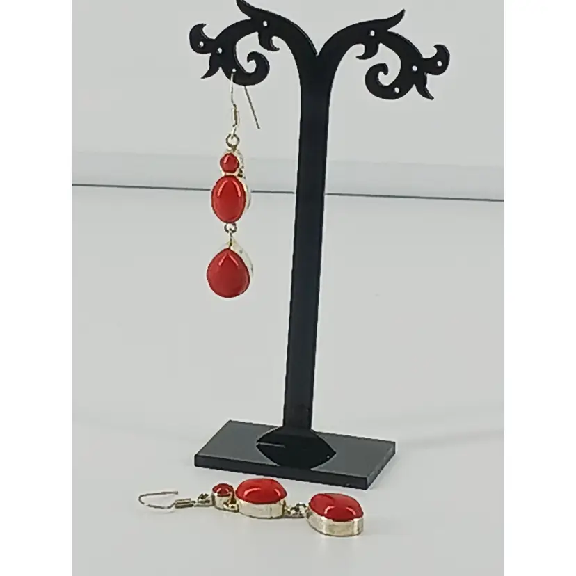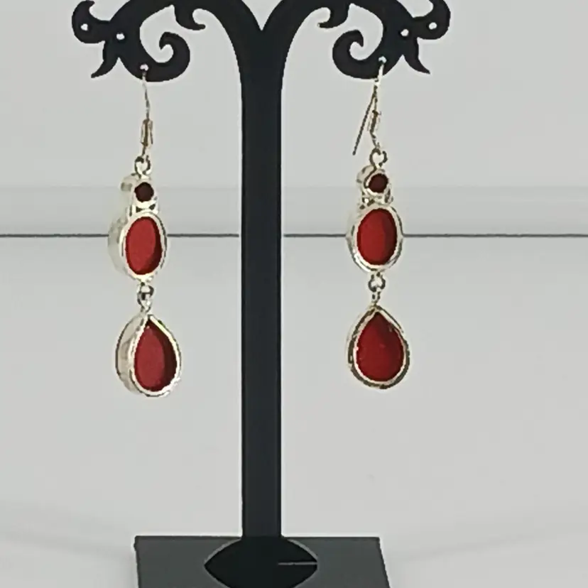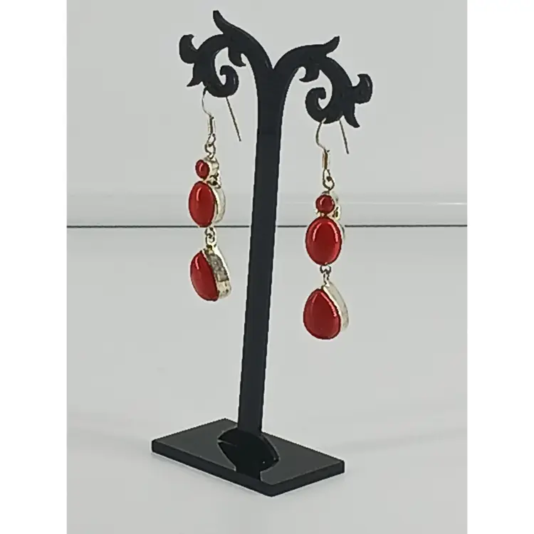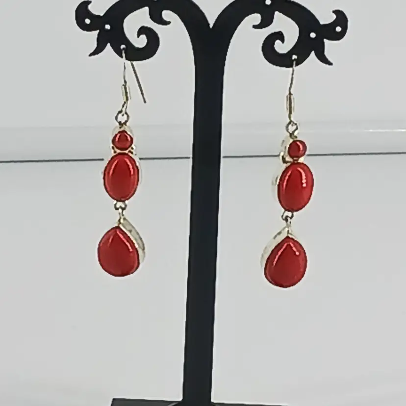EM2784 – Red Coral in three shapes: round that measures 3/16 inches, oval that measures 1/2x 3/8 inches and drop that measures 5/8 x 7/16 inches are mounted with Sterling Silver and dangle a total of 1 7/8 inches from Sterling Silver earring wires.