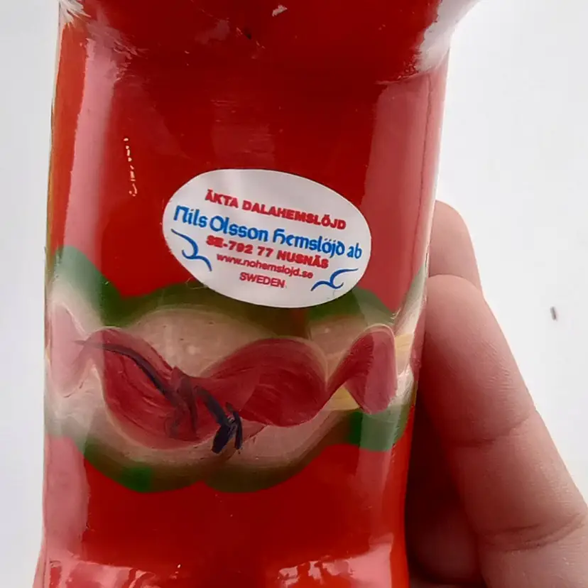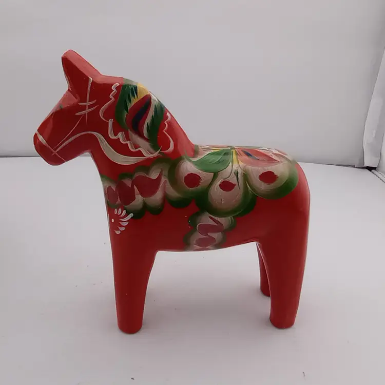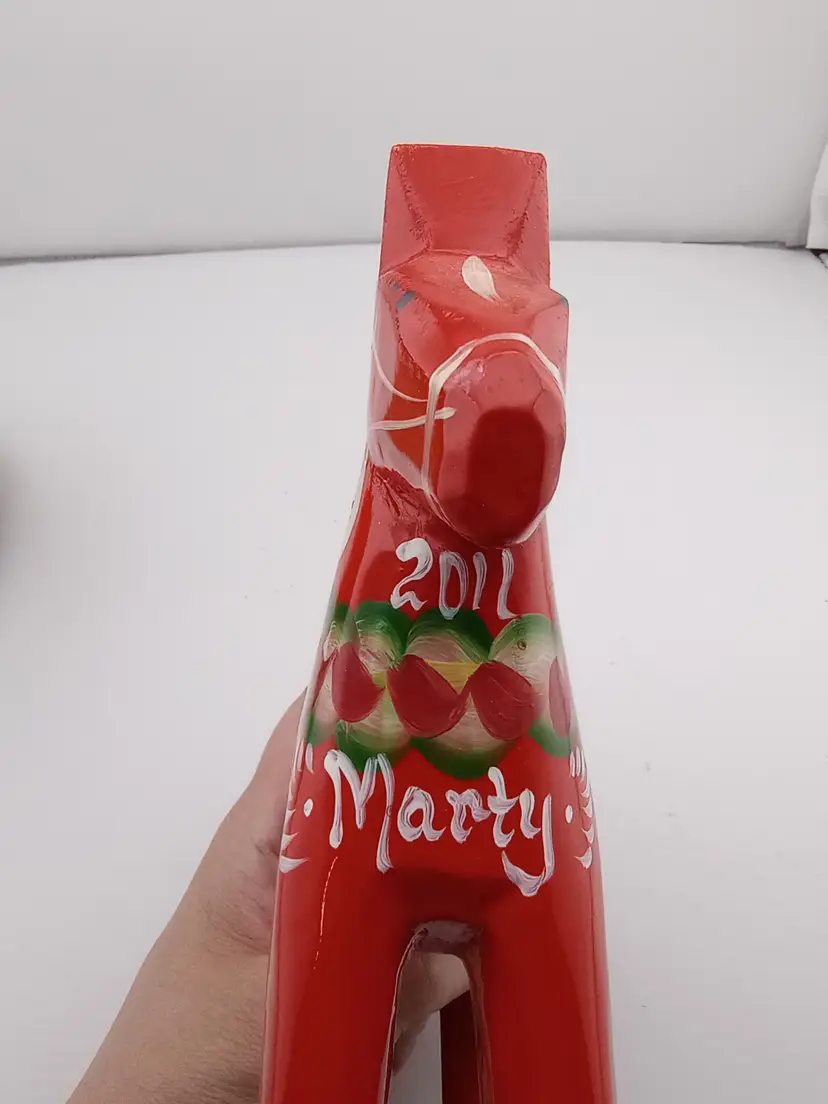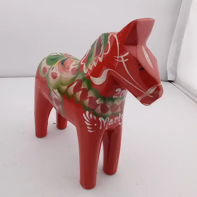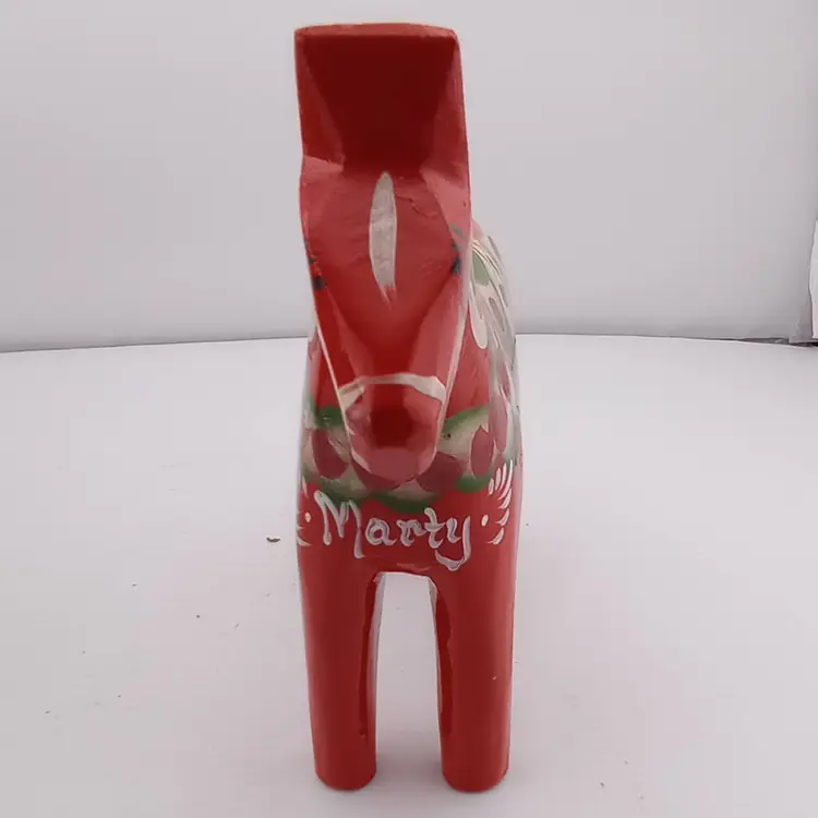 This is a great handpainted Nils Olsson dala horse from Sweden. It has no noted flaws. It is 6" tall and personalized for "Marty" in "2011".