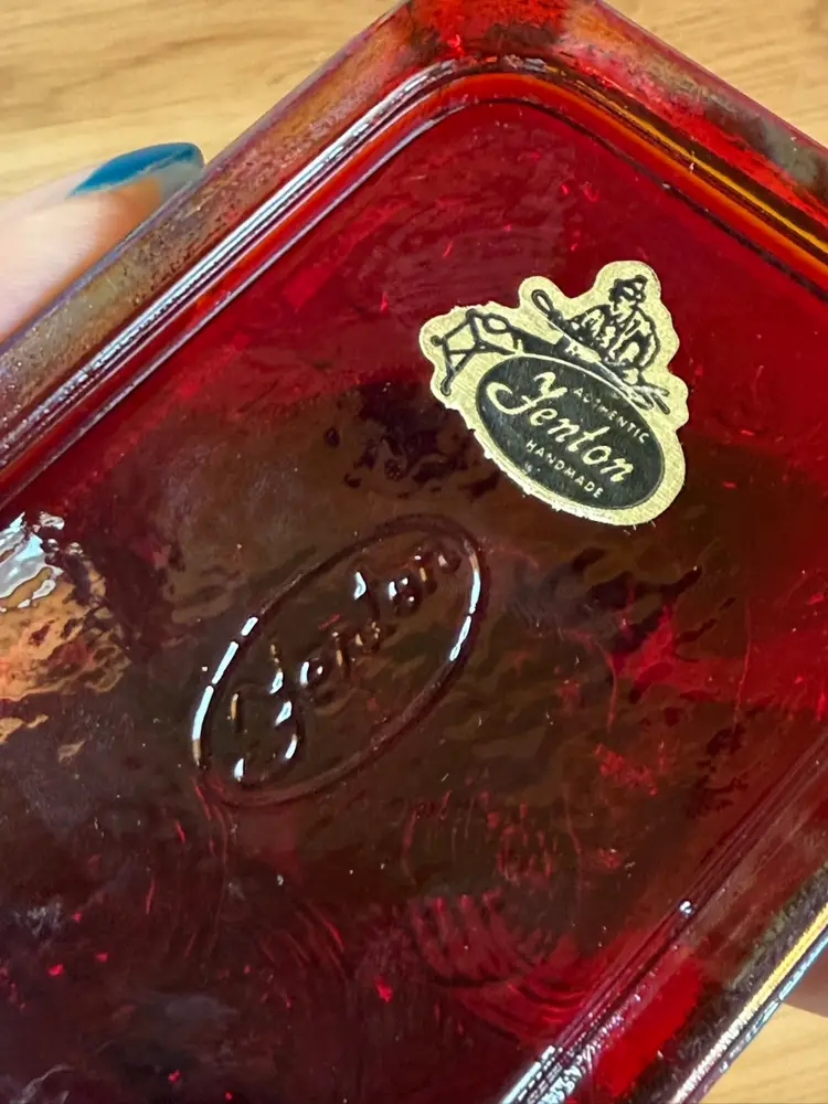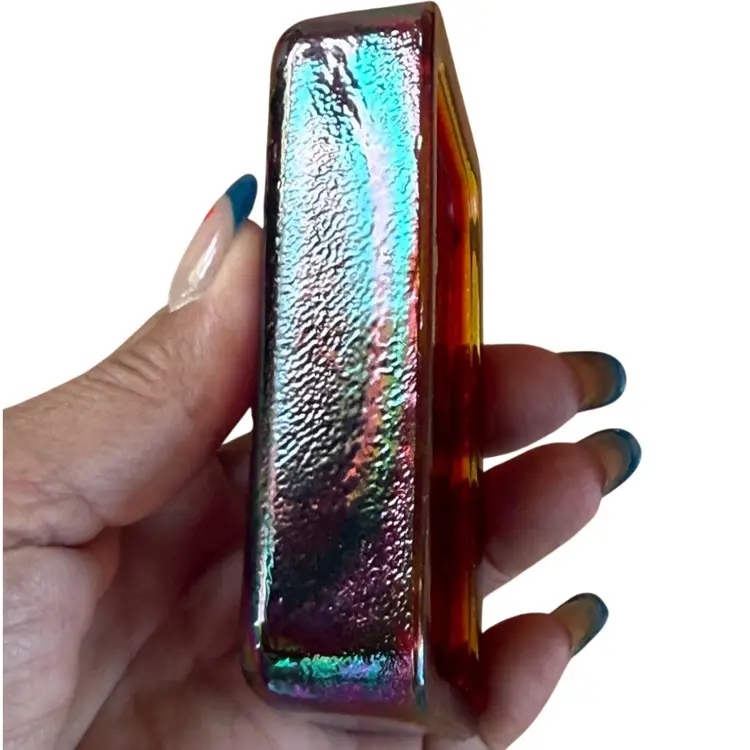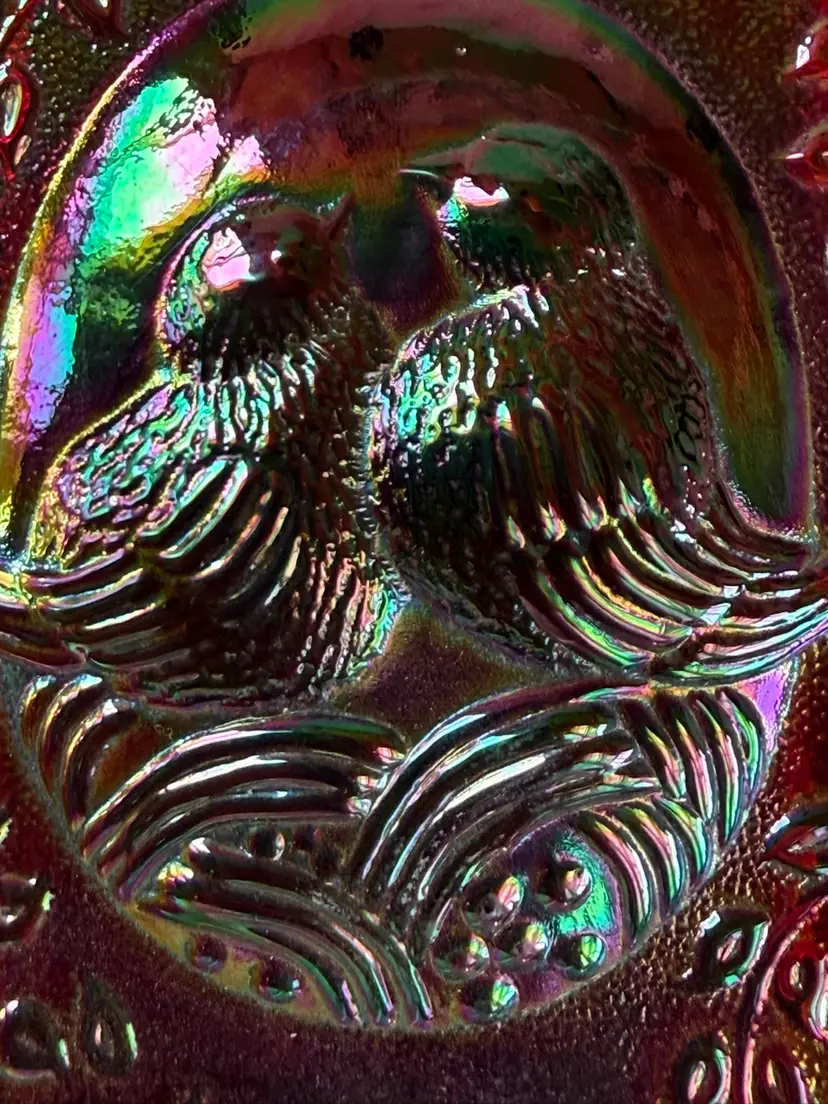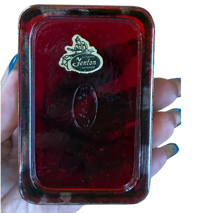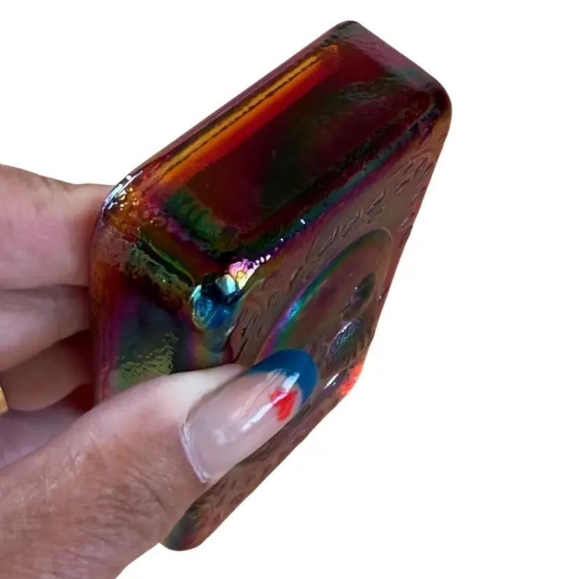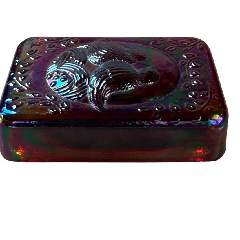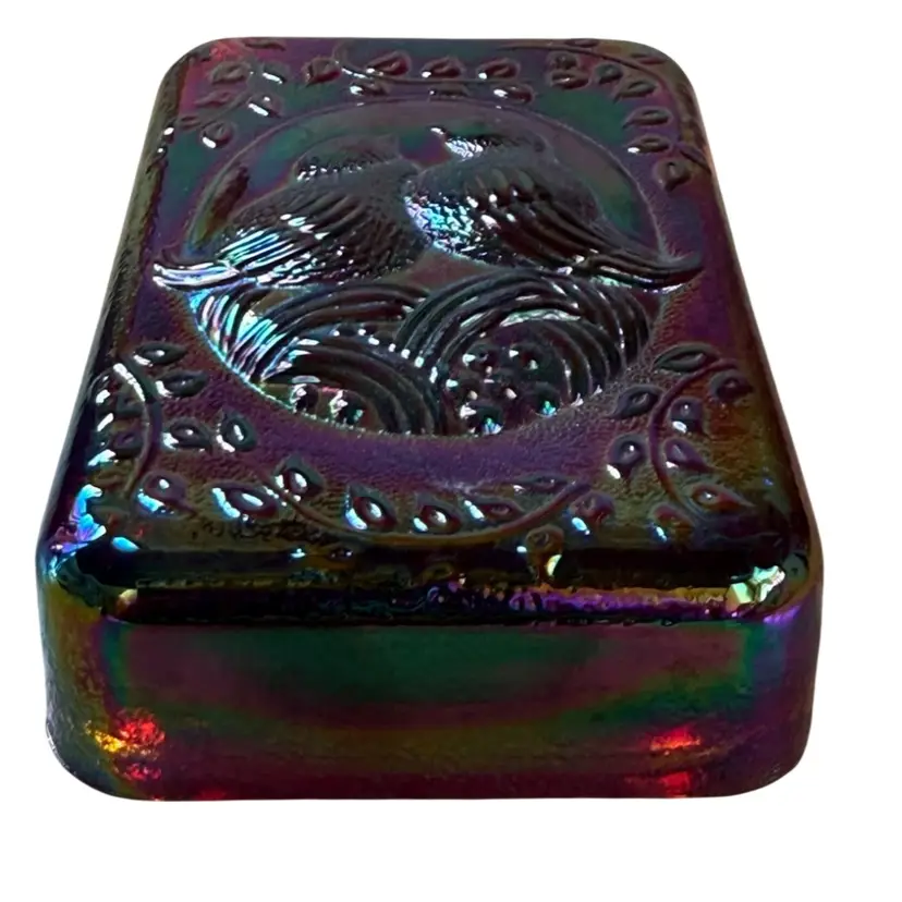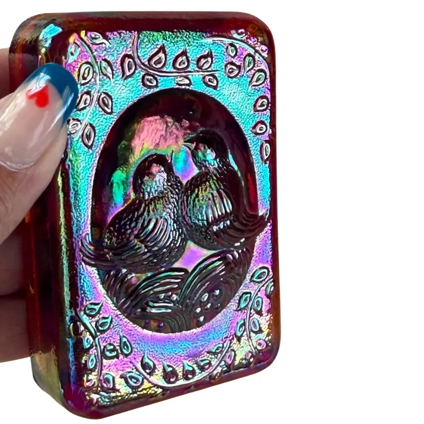 Fenton glass with sticker in a rectangular paperweight that has a lovebirds design. It is red Carnival Glass. It has great iridescence. It measures about 4" x 2 5/8" x 1 1/8. No chips, cracks, dings,or repairs. This will make a great addition to a desk, bird collection, or Fenton Glass collection. Beautiful piece of glass!!