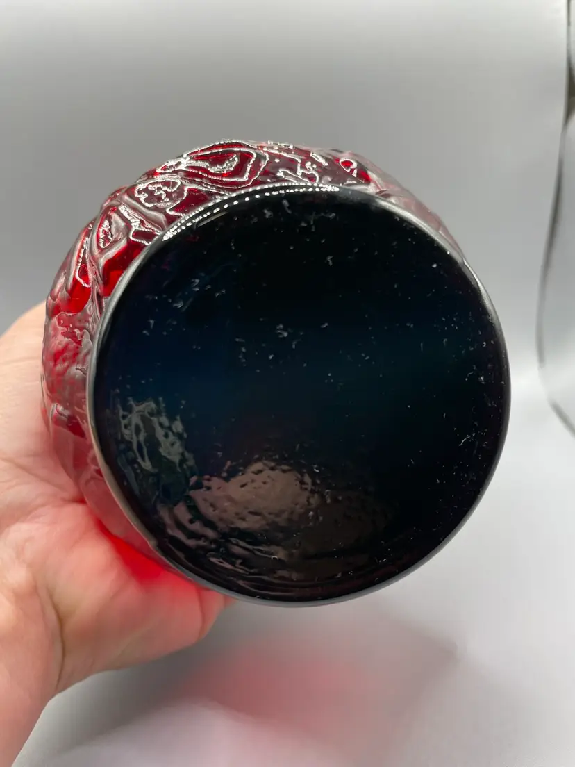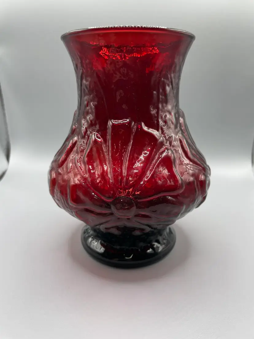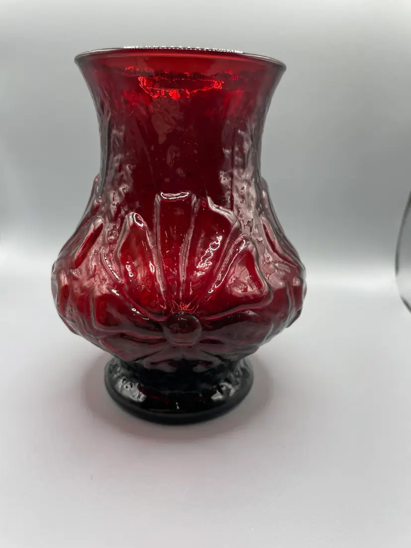 This red glass vase is Anchor Hocking and the pattern is really pretty. It measures 6” inches tall.