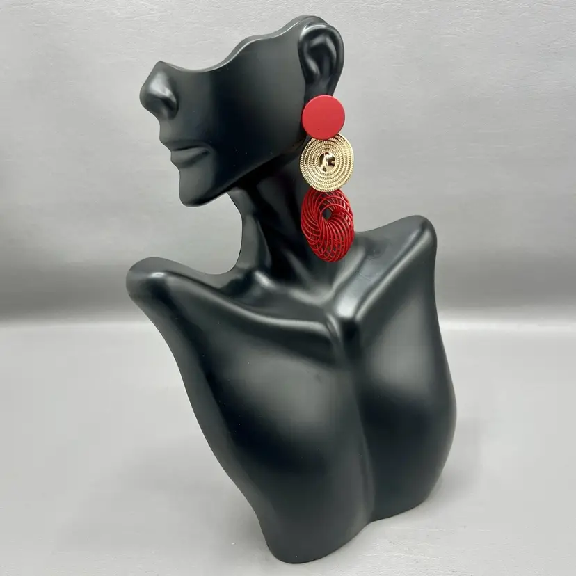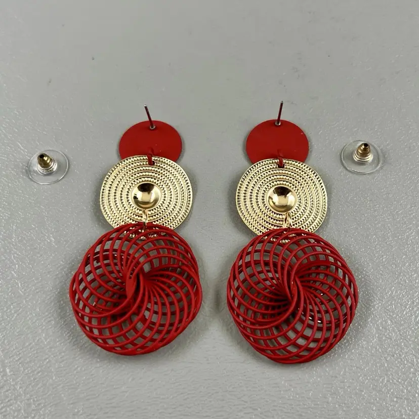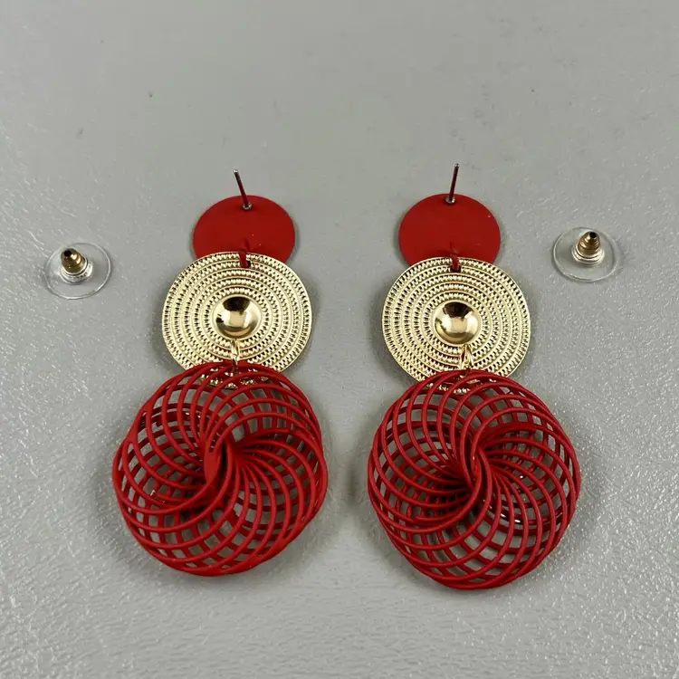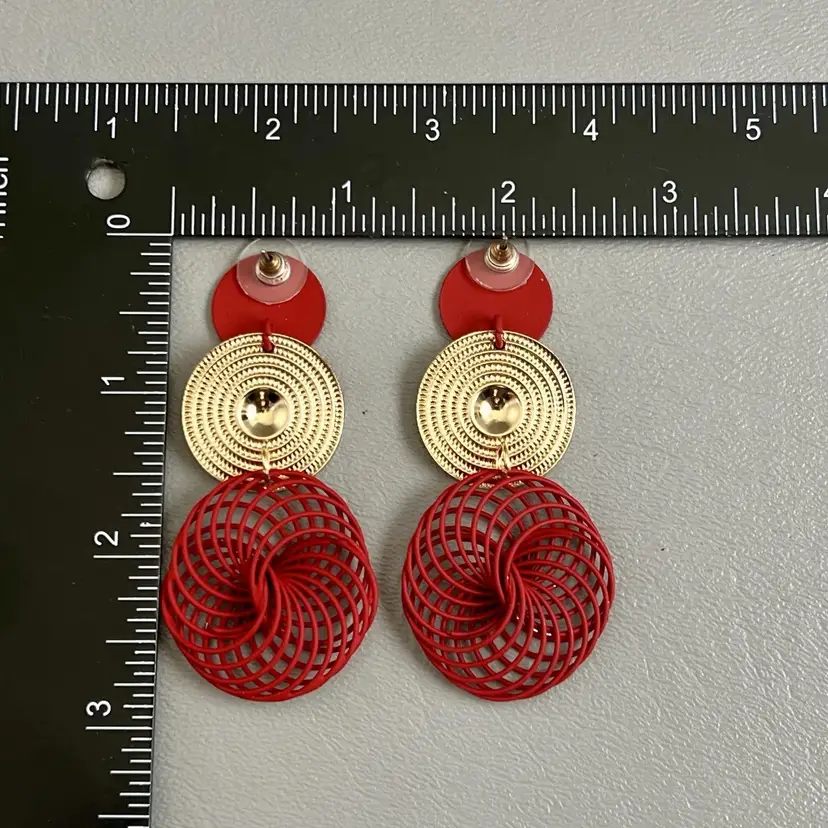 Red Gold Statement Dangle Earrings Large Disc Spiral Retro Bold Fashion 2.75" Multi-tiered Retro Boho Costume Jewelry Fashion