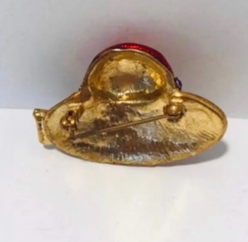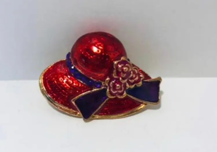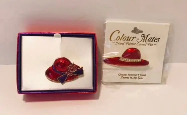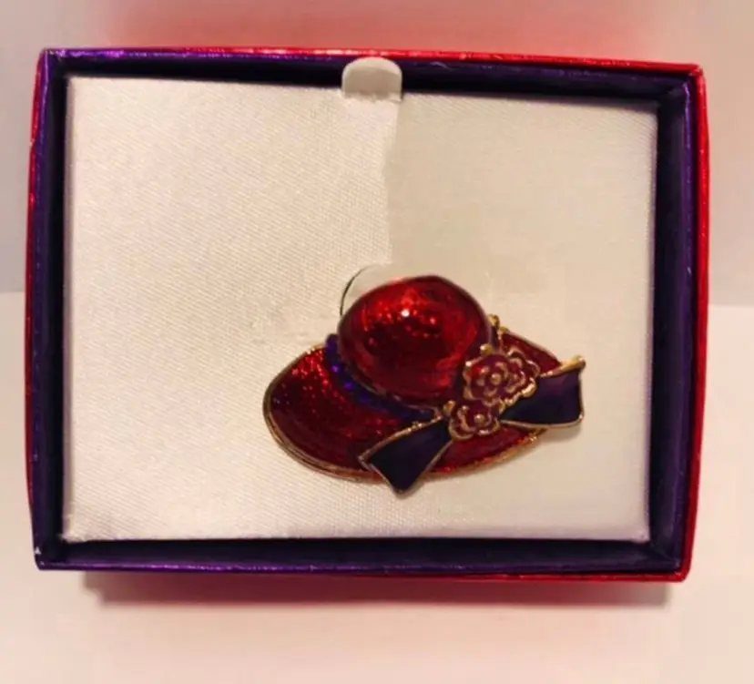This is a lot of 2 Red Hat Society inspired pins One is purple and red in a purple and red box and is about 1.5” x 1”, very little if any use Colour Mates hand painted enamel pin, genuine European crystal layered in 18 kt gold is about 2” x 1”. This is new in package. Shipped in a poly mailer in bubble wrap Thank you for stopping by :)