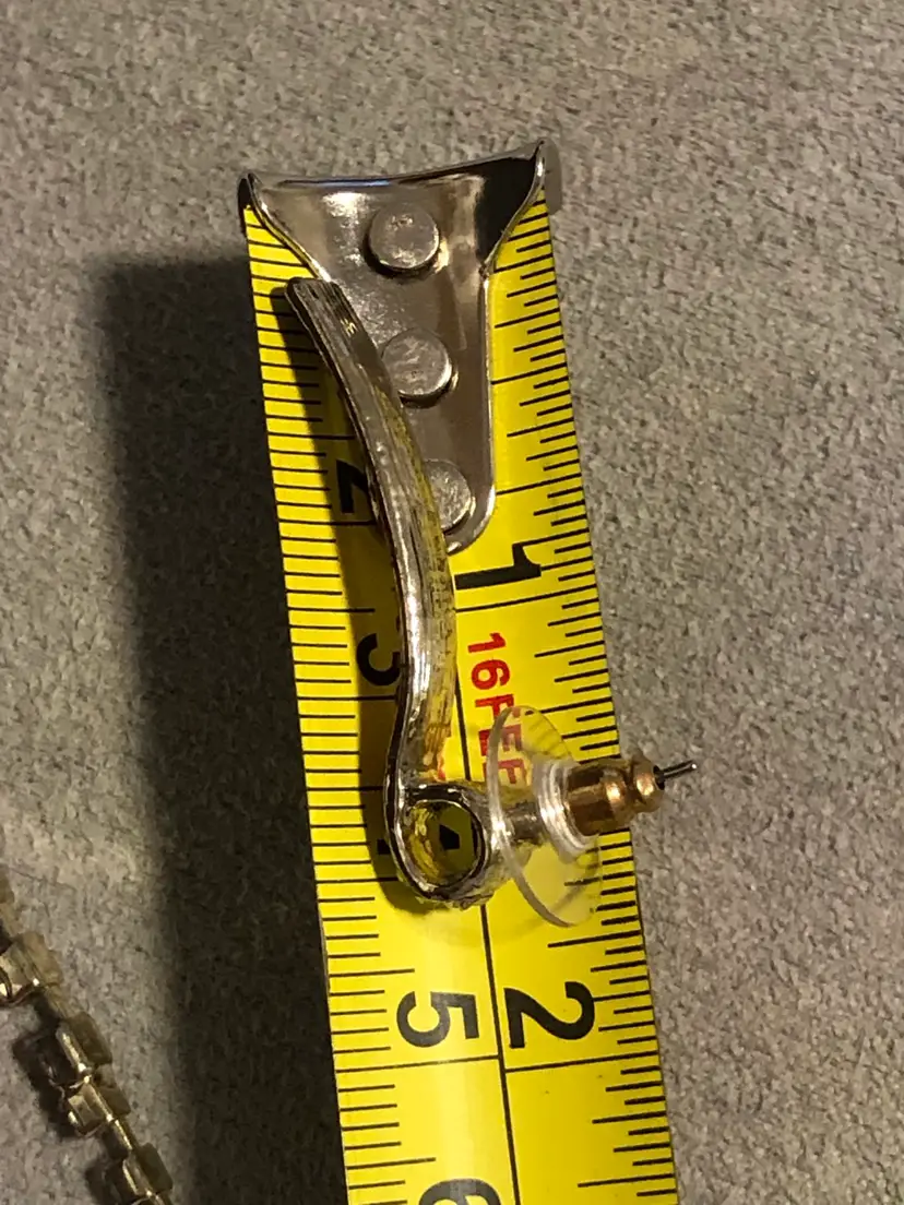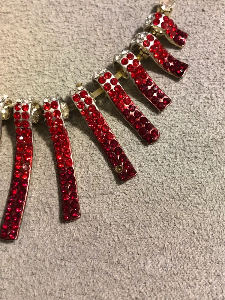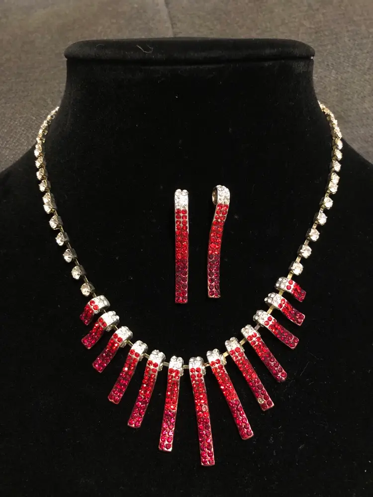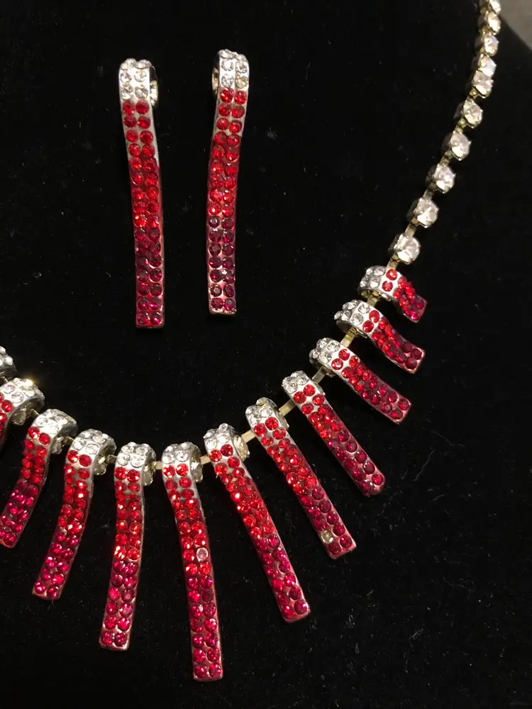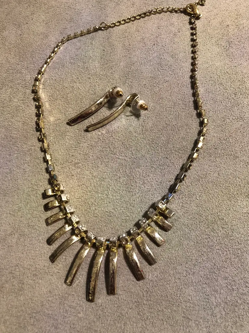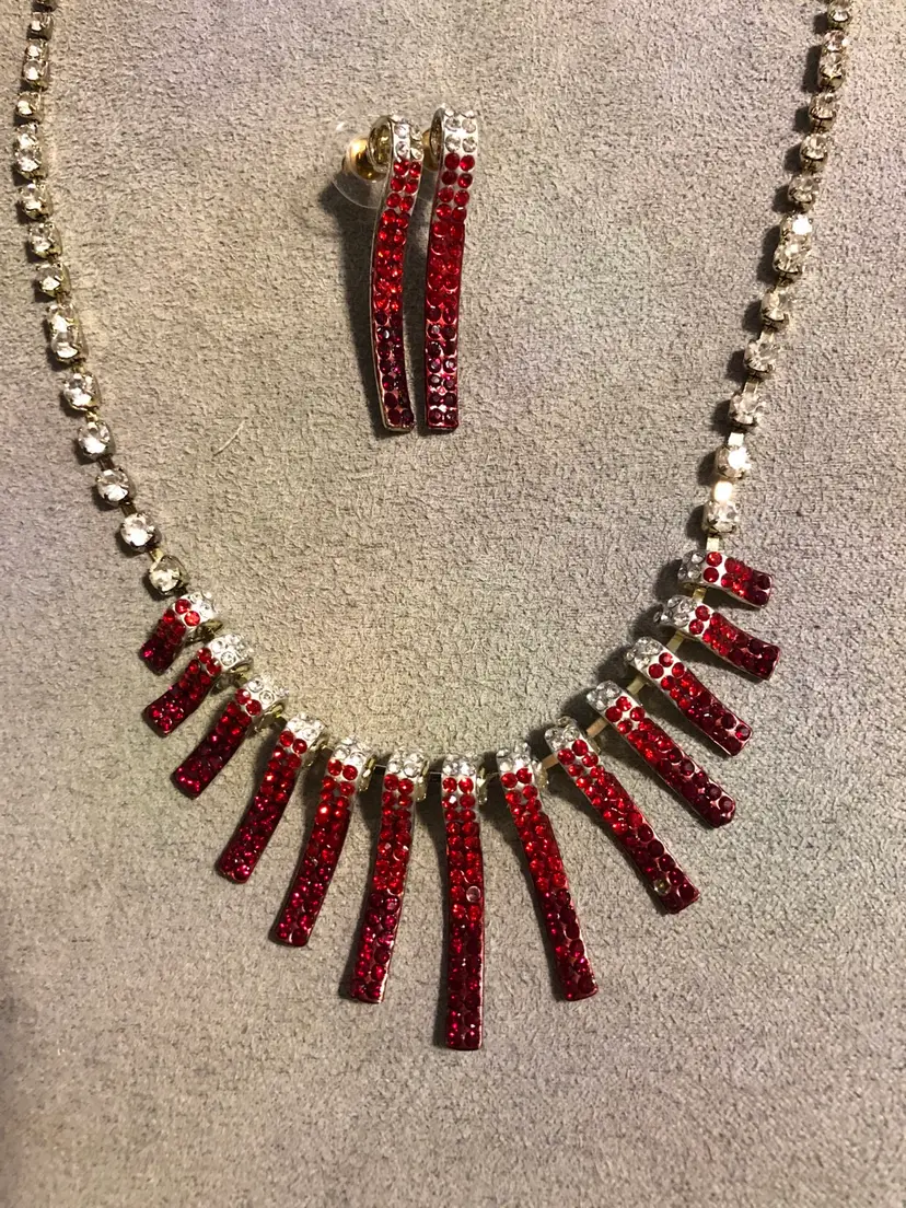 Really beautiful pieces Does not come with the jewelry display The necklace is about 17 inches in length unclasped and the earrings are about 1.5 inches in length A few missing stones