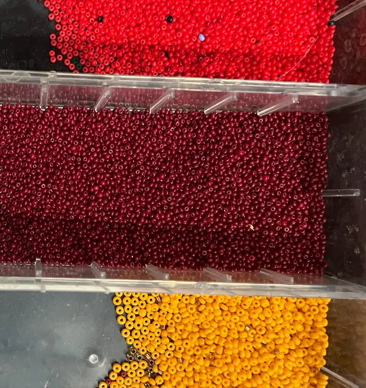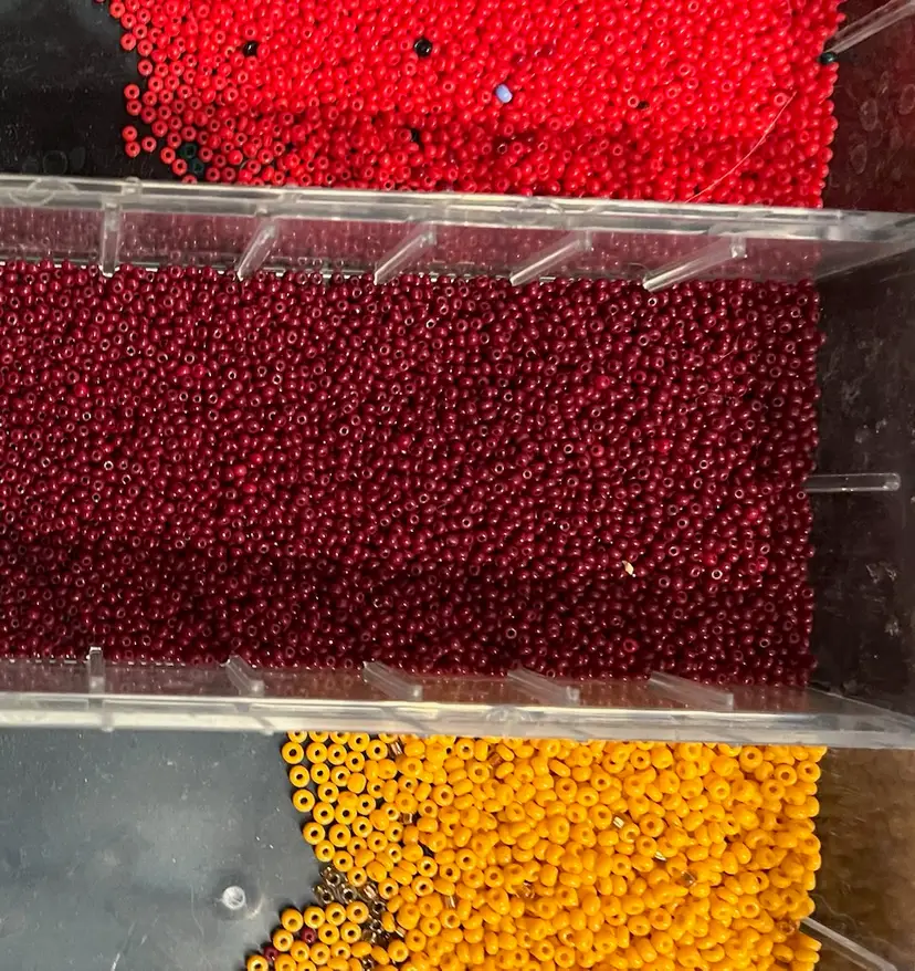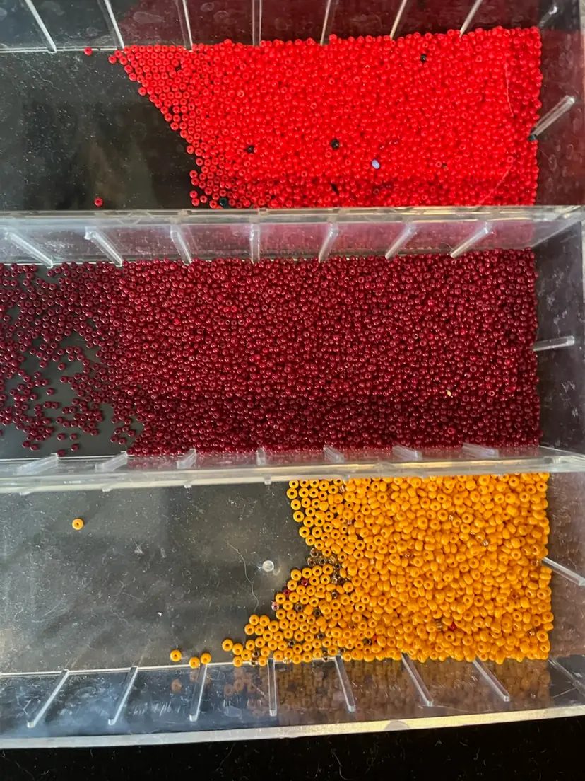 Red, Maroon, Orange Glass Seed Bead Mix. Two different sized in the orange beads.