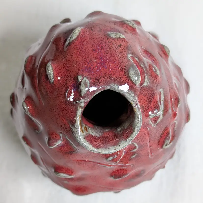Interesting art pottery vase. Cool red glaze and textured in an interesting way, is it a dragon egg, is it a dragon fruit? Signed Vanessa on the bottom. Quite heavy. No chips or cracks.