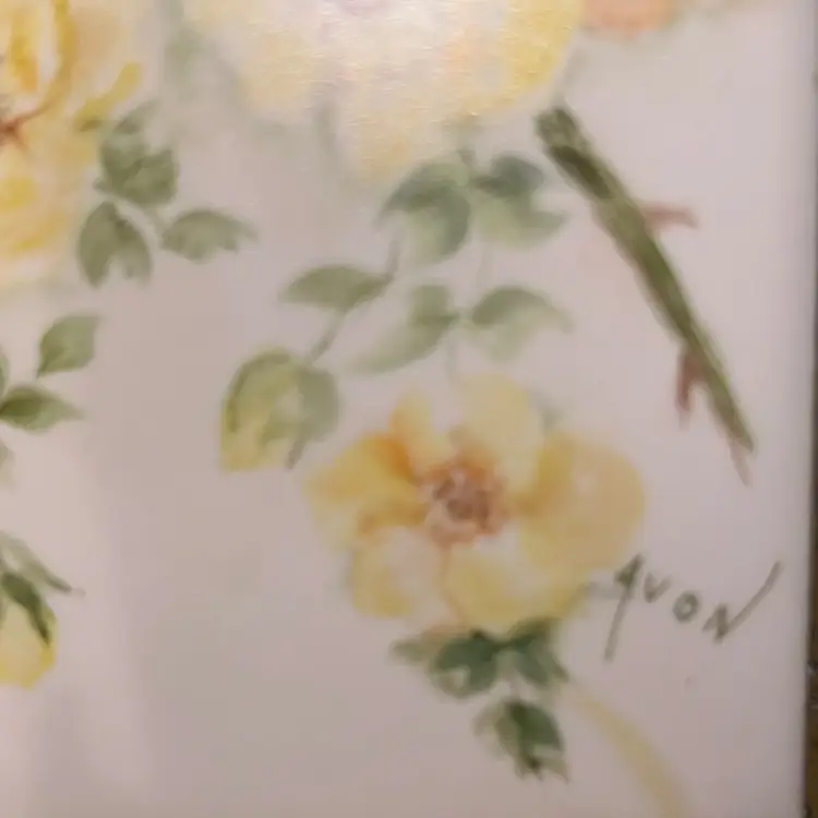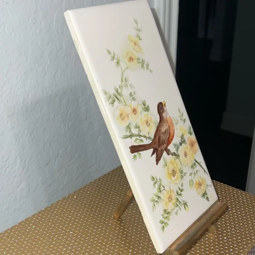 Off white/ivory Vintage Robin on branch with yellow flowers ceramic decor tile. Labeled Avon.