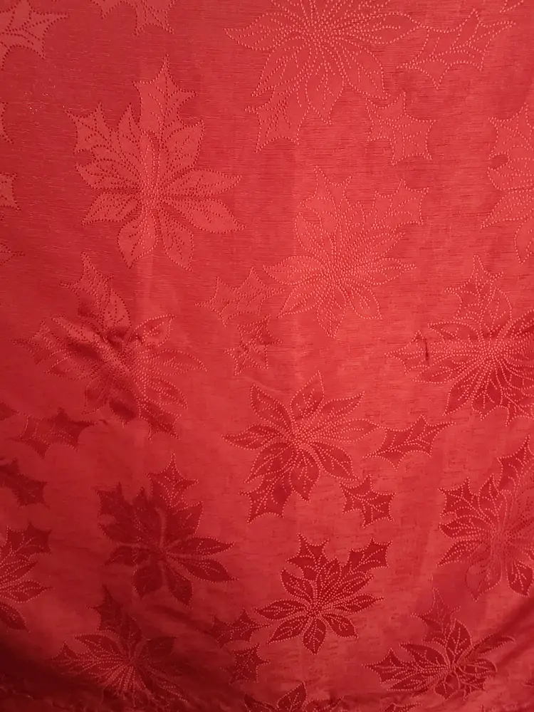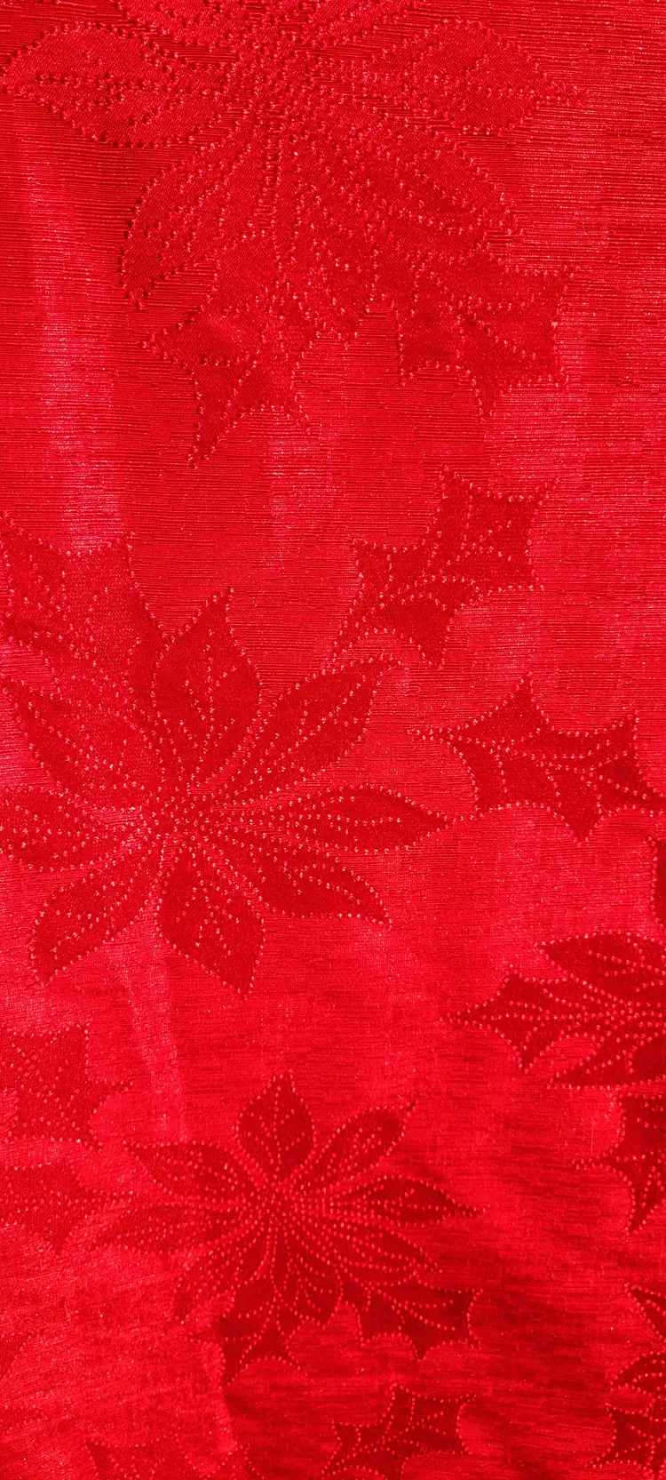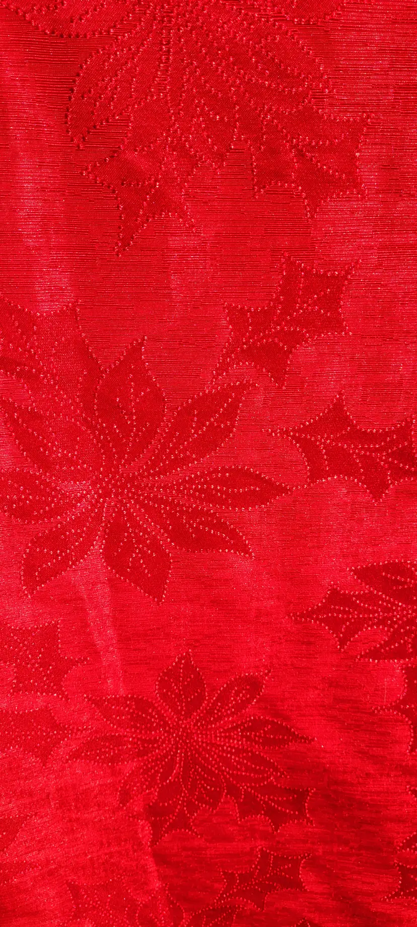 Red satin-like tablecloth with poinsettia pattern design. 100% polyester approximately 5' x 7'