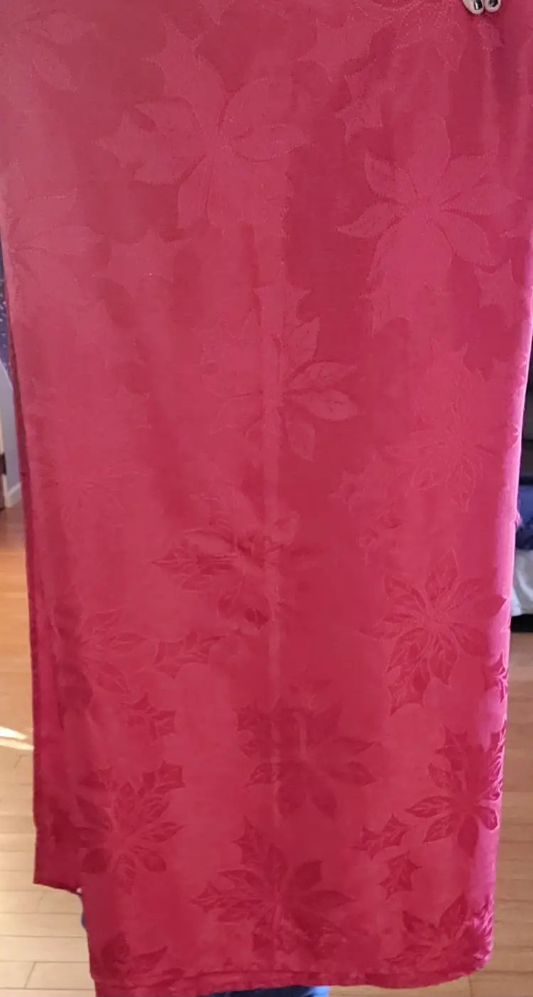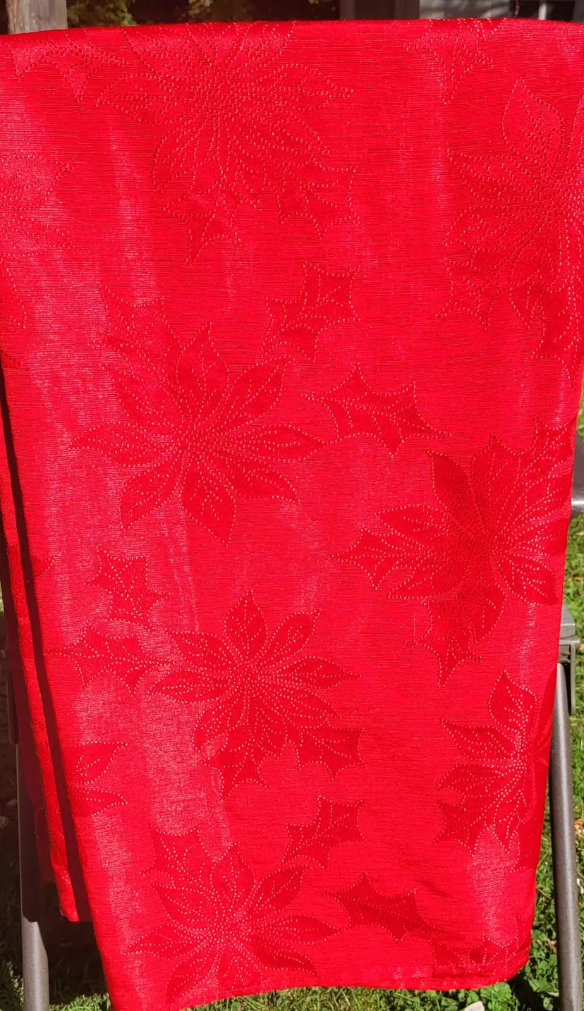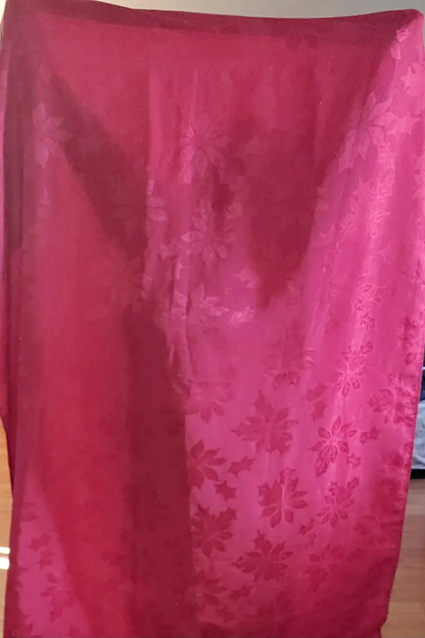 Red satin-like tablecloth with poinsettia pattern design. 100% polyester approximately 5' x 7'