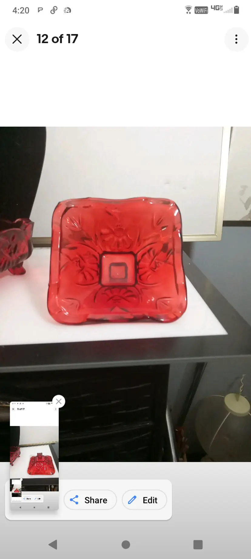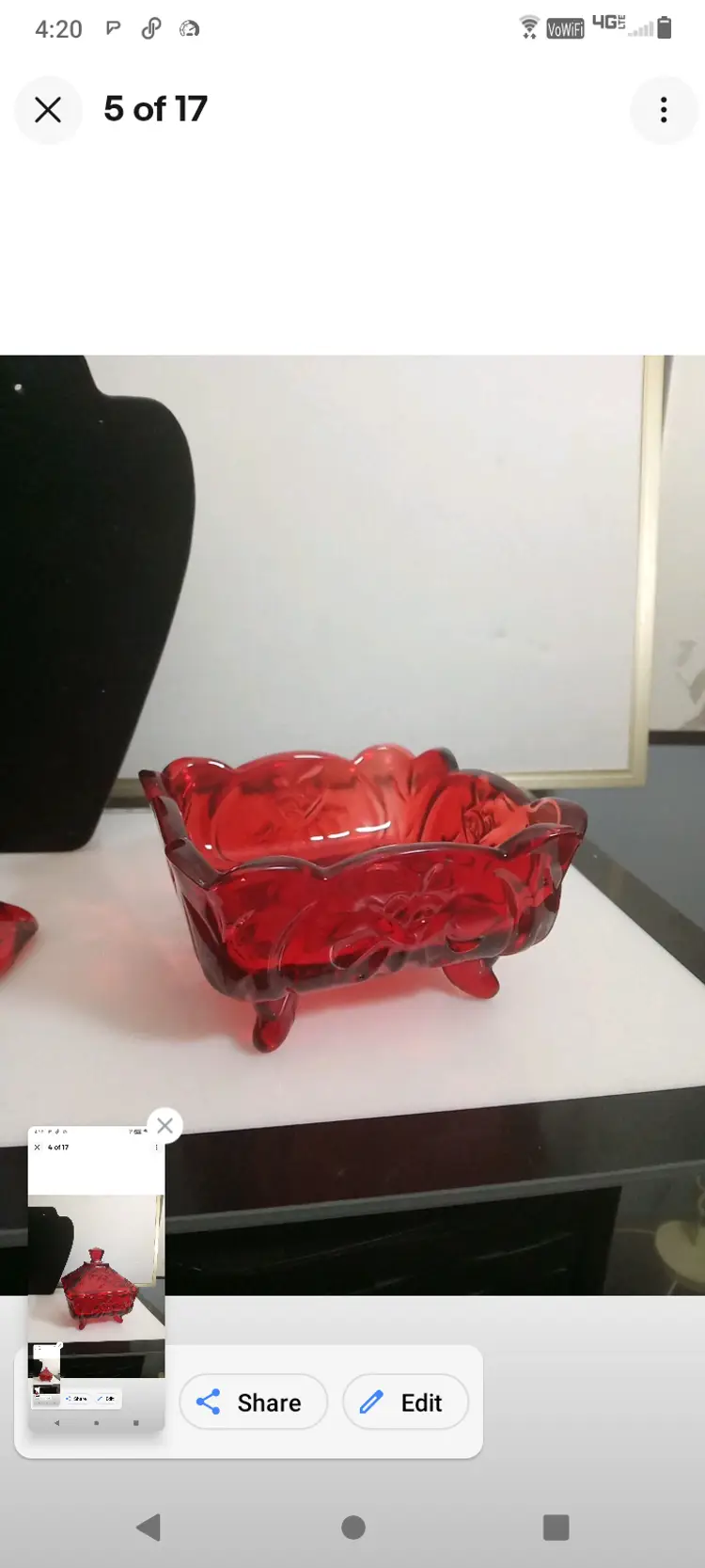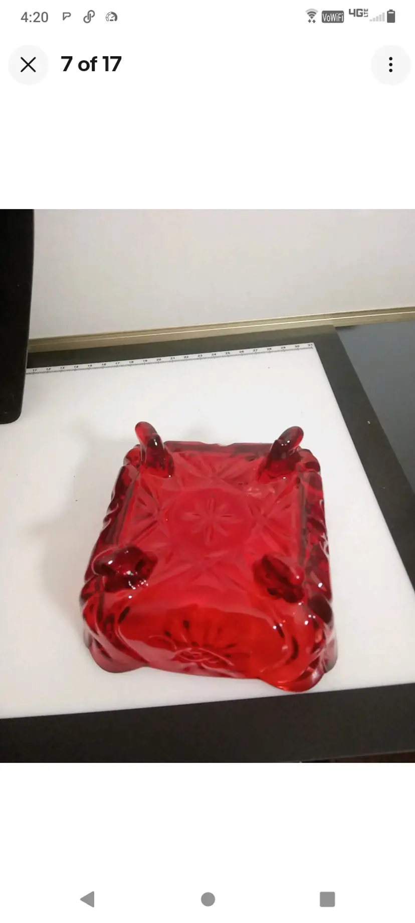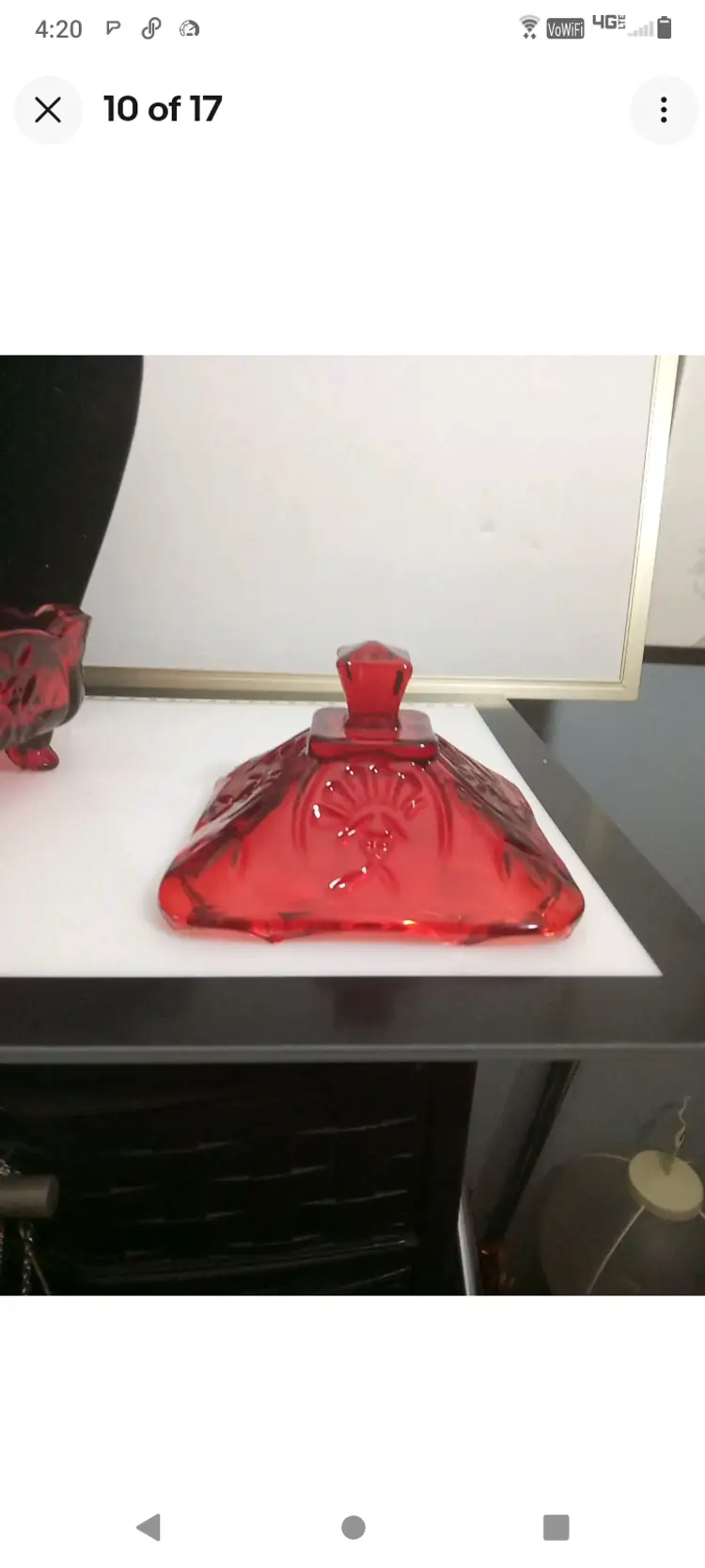 This vintage candy dish is a charming addition to any kitchen or collection. The square cut glass provides a unique and elegant look, while the ruby red color adds a pop of color to any room. The dish comes with pedestal feet and is perfect for storing candies, nuts, or any other small treats.