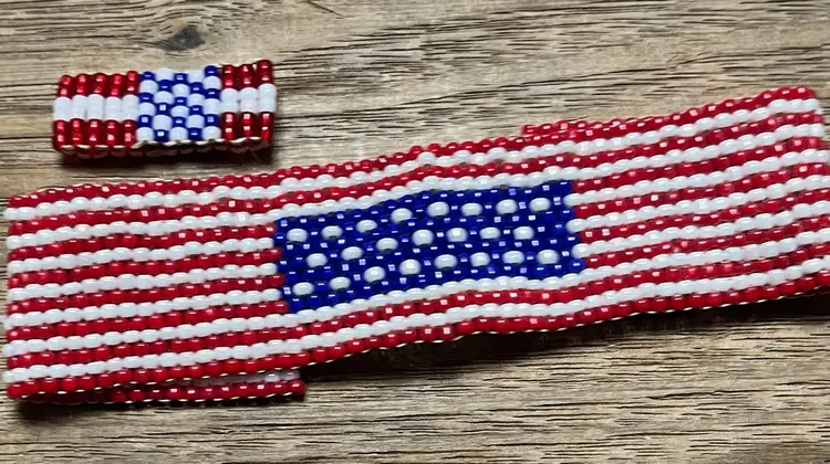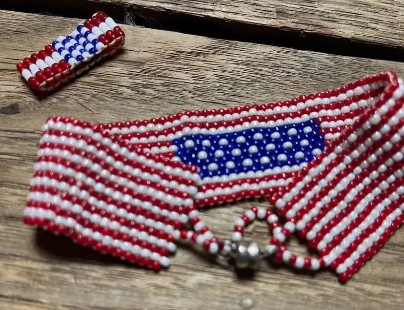 A hand beaded American Flag hand beaded Flag bracelet with matching stretch ring. The bracelet measures approximately 1 inch wide and fits up to a 8 Inch wrist. Magnetic closure and very comfortable on. The ring is small so it would probably work as a pinkie ring on small to medium sized hands. Unfortunately, the pictures don't show this set very well. You won't be disappointed in it!