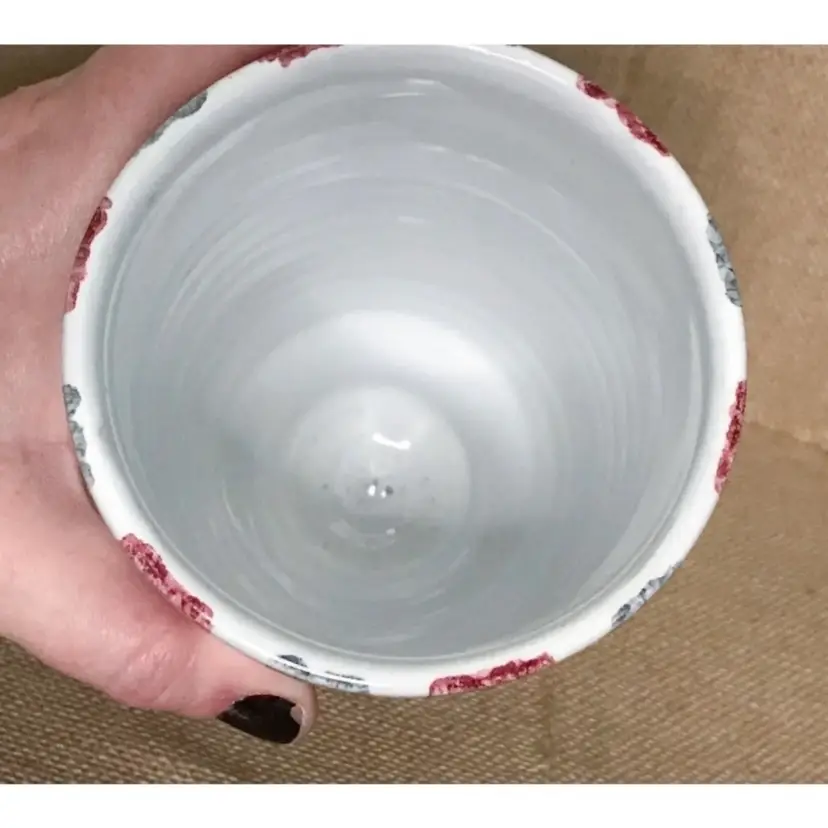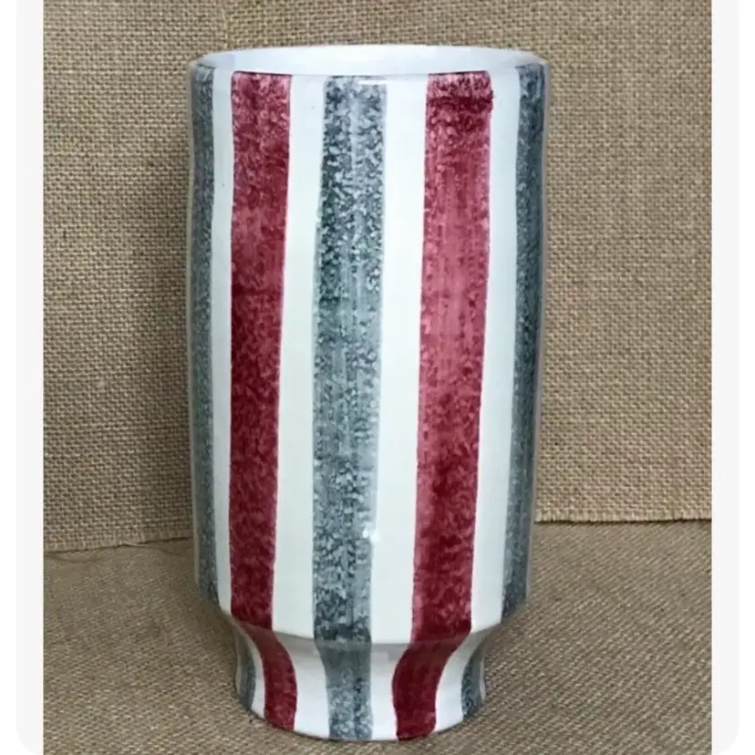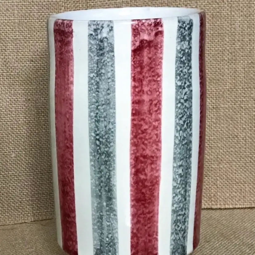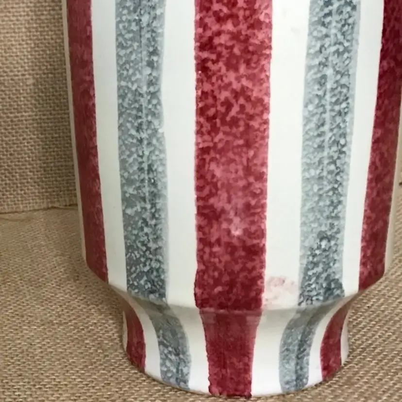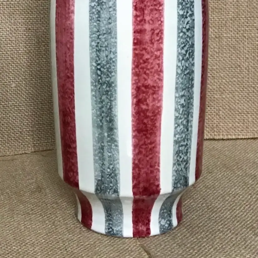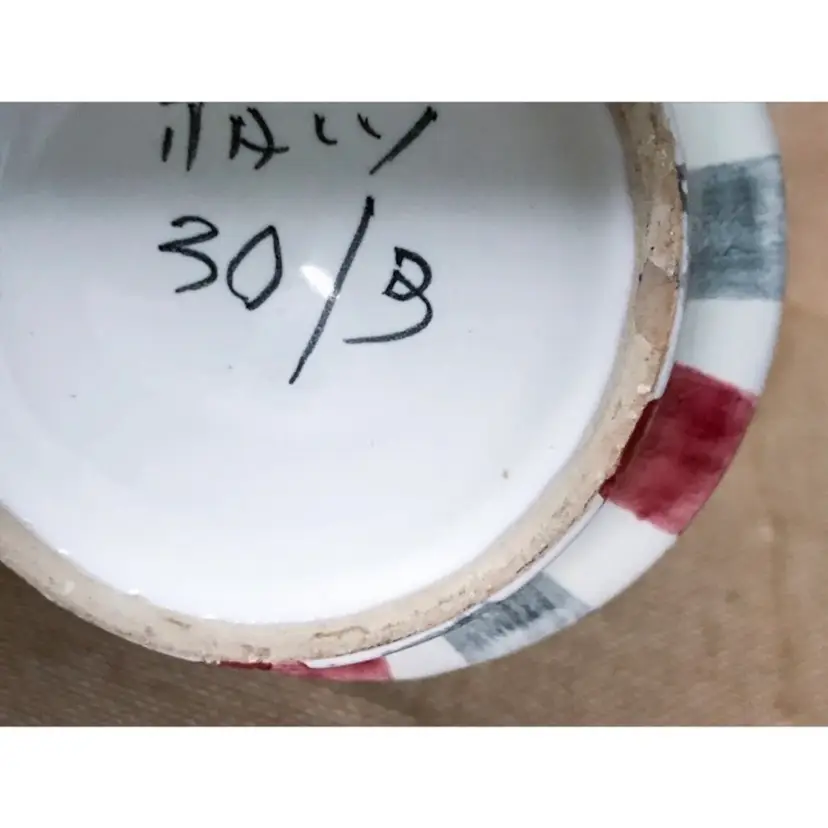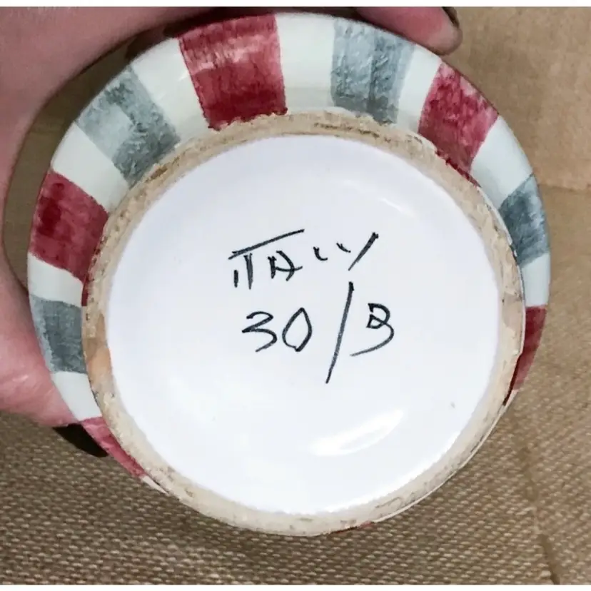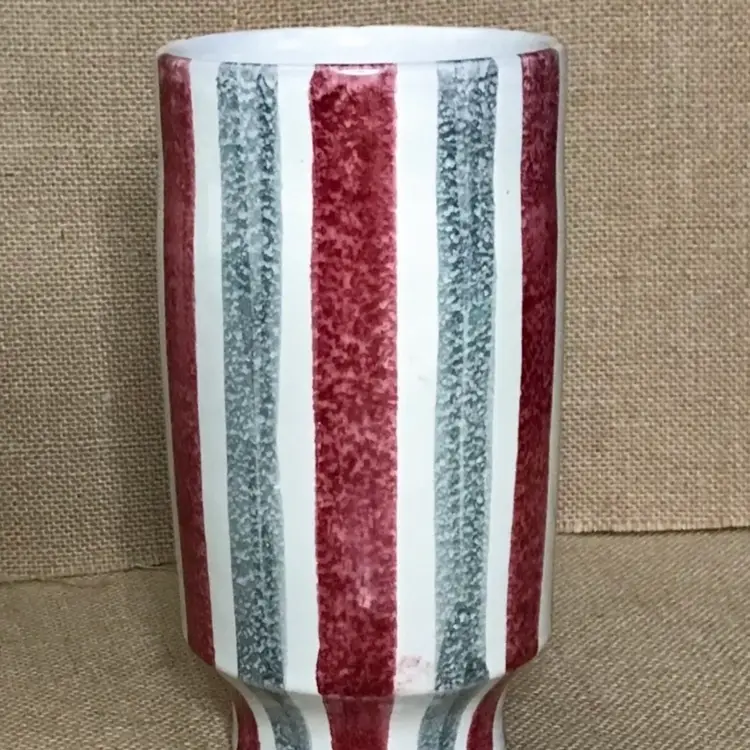 Condition: 2 chips on the bottom of vase. There are also some maker imperfections: A paint error, a few small marks underneath glaze, a tiny bump on the exterior, and some unpainted pottery specks inside the vase on the bottom.