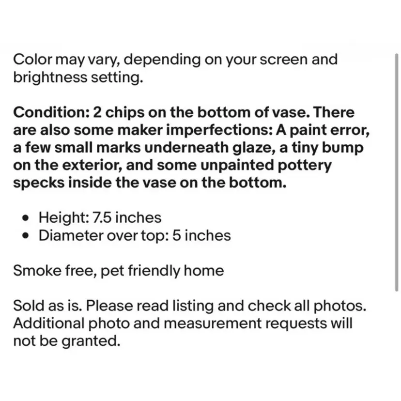 Sold as is. Please read listing and check all photos. Additional photo and measurement requests will not be granted.