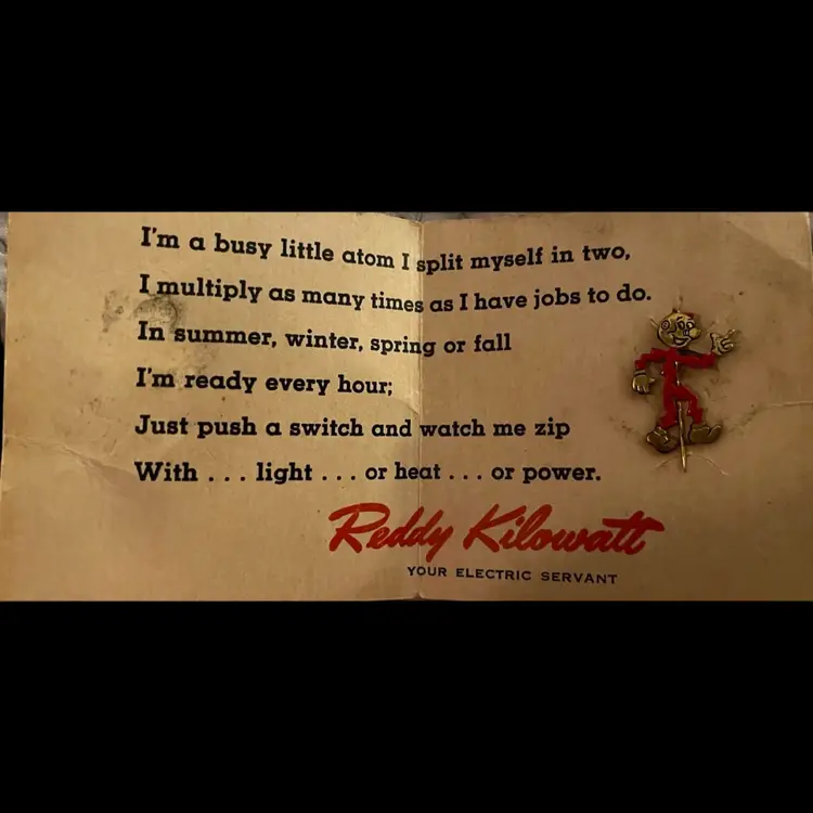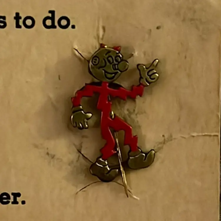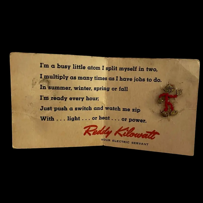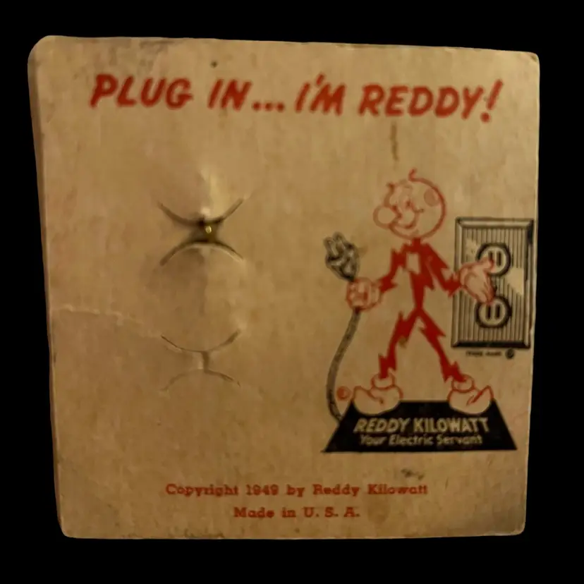 Reddy Kilowatt advertising card with the pin still attached. Marked copyright 1949 on the back. The card shows some character…some wear but intact. See pictures please. Please note the last picture isn’t a rip or hole, it’s the area where the pin is poking through the card.