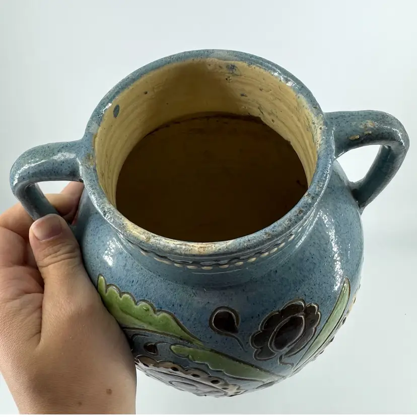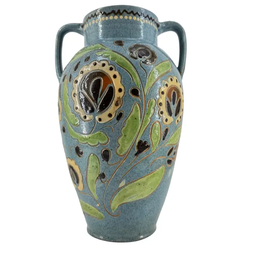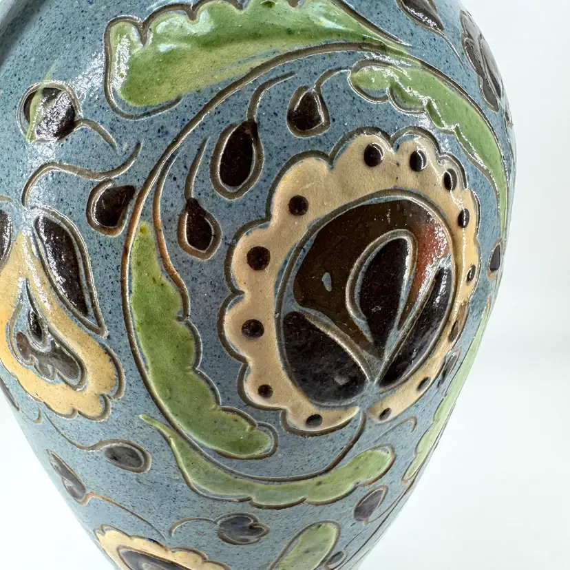 Tall vase made of Redware pottery featuring folk art styled floral design and a speckled baby blue glaze. Vase is not signed or marked.