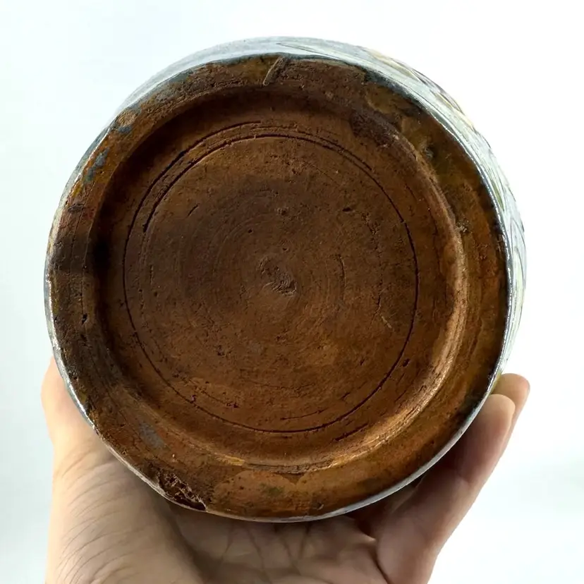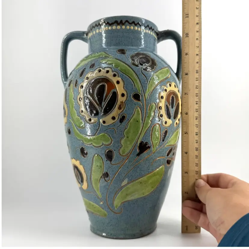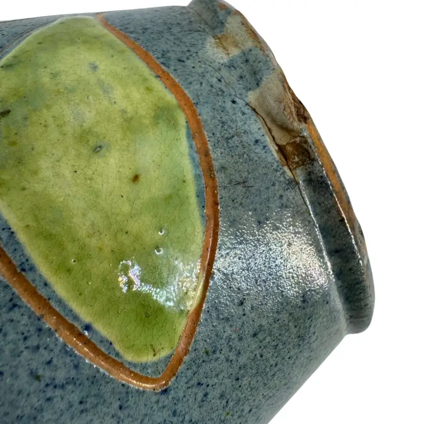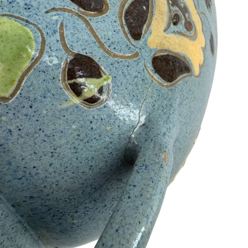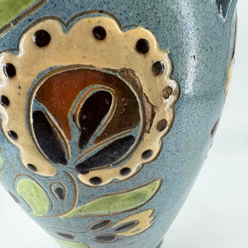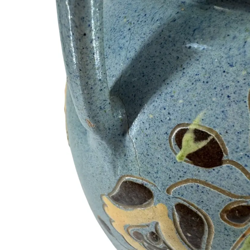 There is some chipping in the glaze, as well as some cracking in the pottery as shown. Vase measures approximately 10 3/4“ tall.