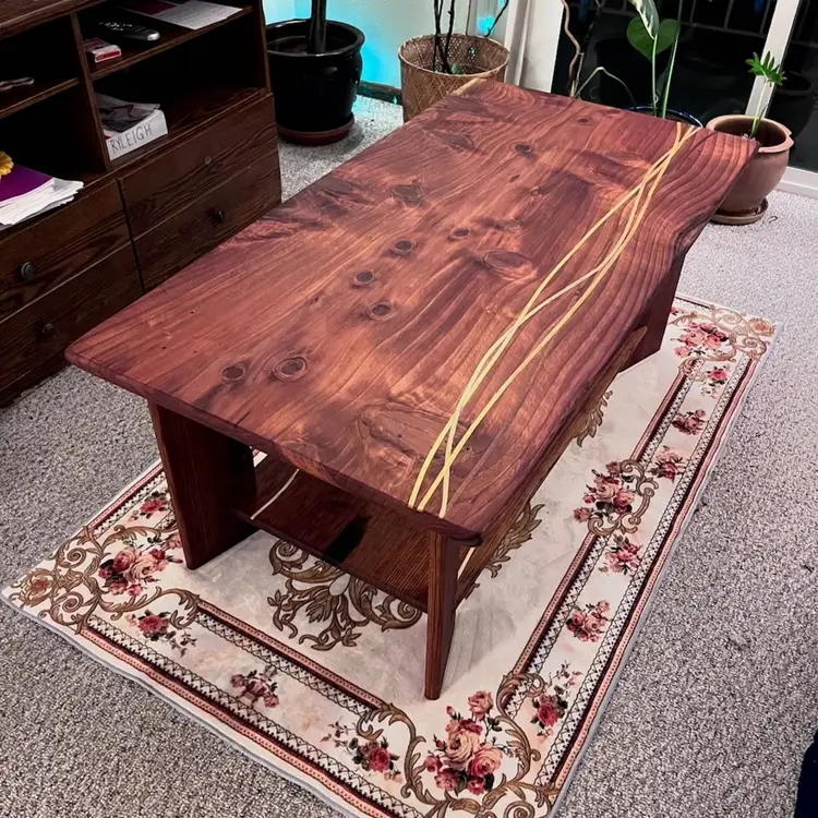 Elevate your living space with this stunning coast redwood coffee table, featuring a unique woven inlay design from yellowheart, walnut and poplar wood. Perfect for adding a touch of elegance and natural beauty to your home.