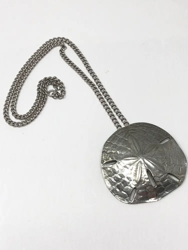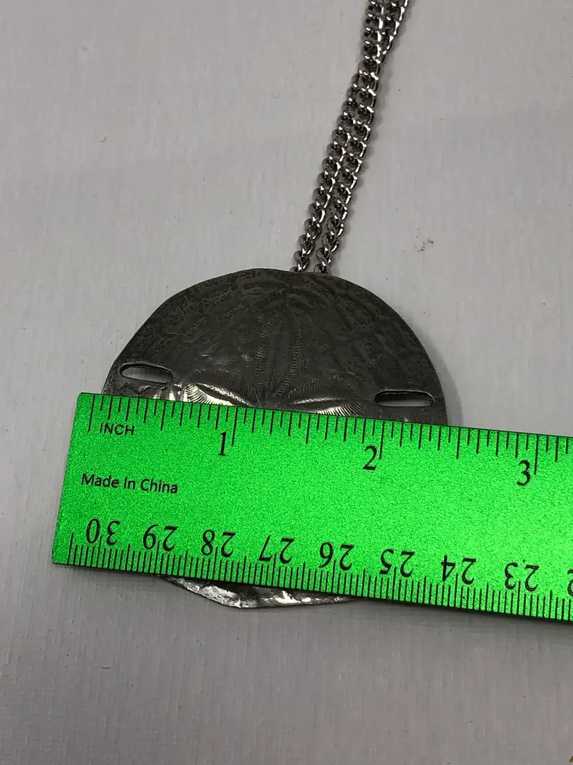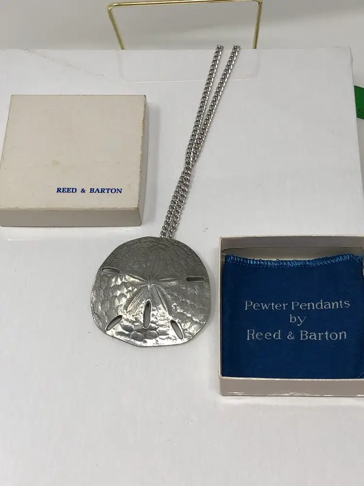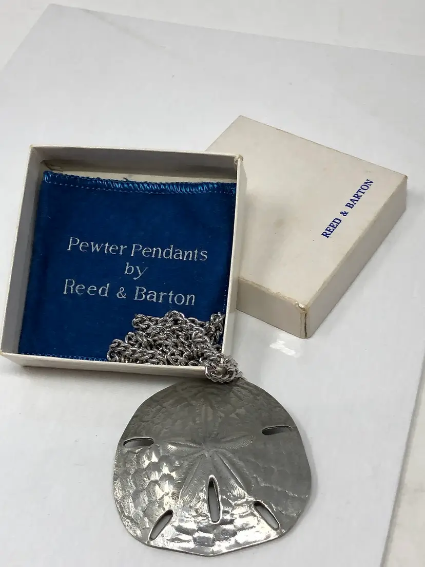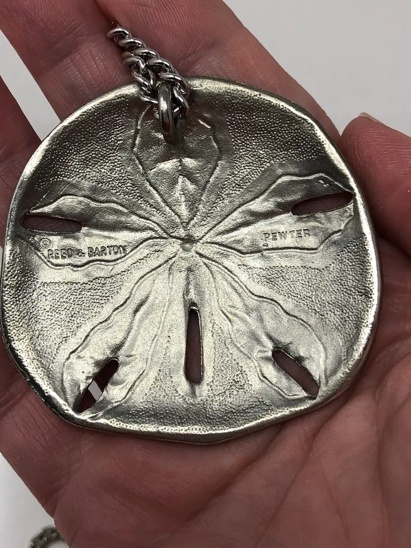 2 1/2" diameter pewter sand dollar pendant by Reed and Barton on a 24" chain. Comes in original box with soft pouch. Excellent condition