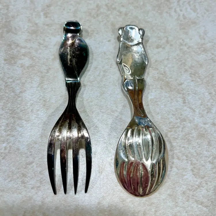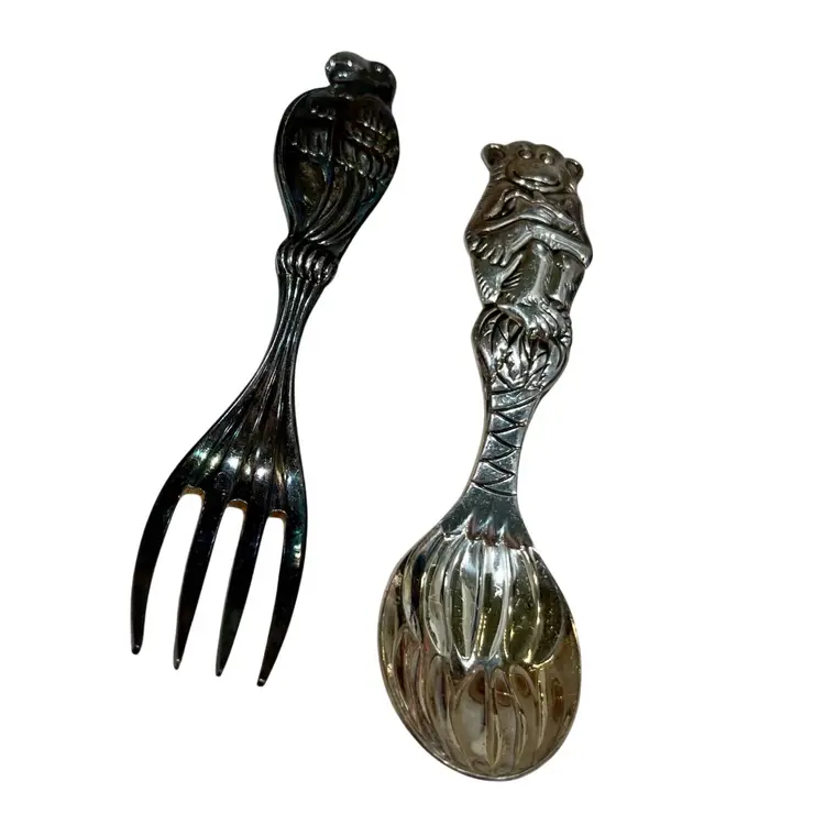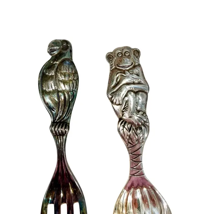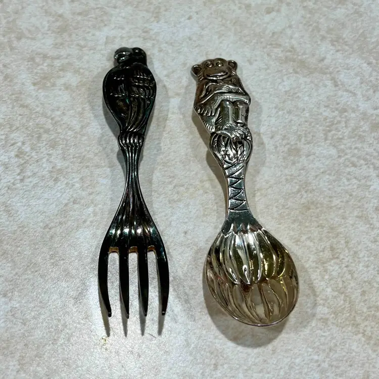 Brand: Reed & Barton Collection: Safari Includes: 1 Monkey Baby Spoon (4.5”), 1 Parrot Baby Fork (4.5”)