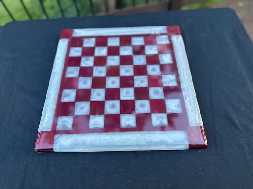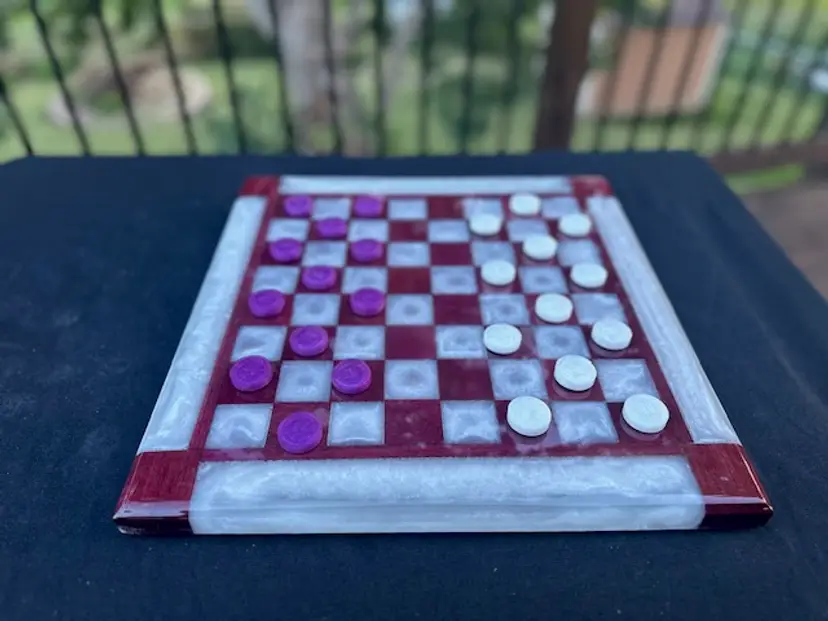 Purple heart and crystal epoxy gives this chess and checkers set a regal look and is beautiful in the sunlight. Pieces made with same epoxy as in the board. Coated in tabletop epoxy for durability and protection.