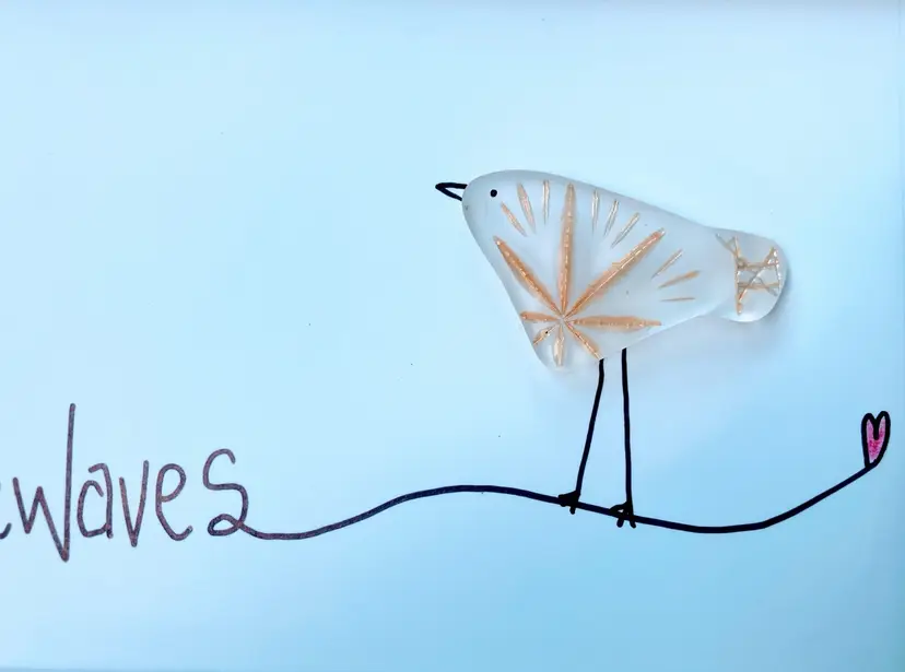Bird is crafted from a broken and discarded Vintage glass bowl which had a pressed pattern and gold accents. Glass has been tumbled to get ride of sharp edges and give a frosted beach glass look.
