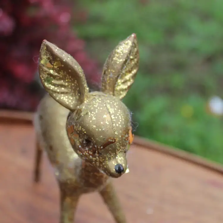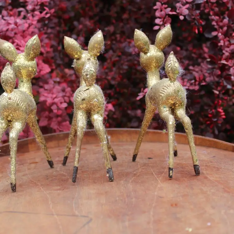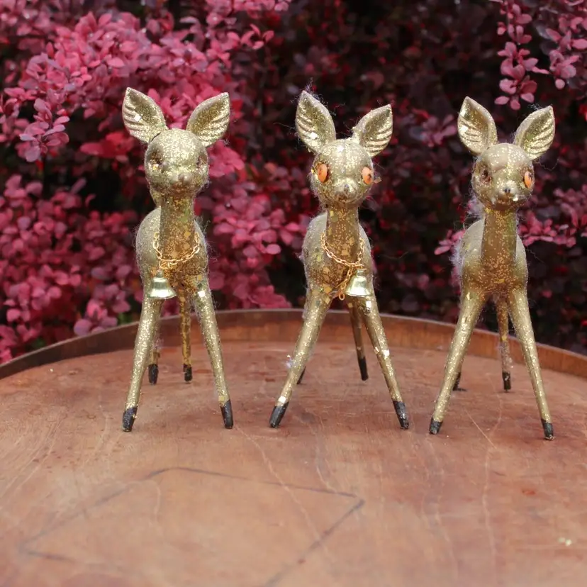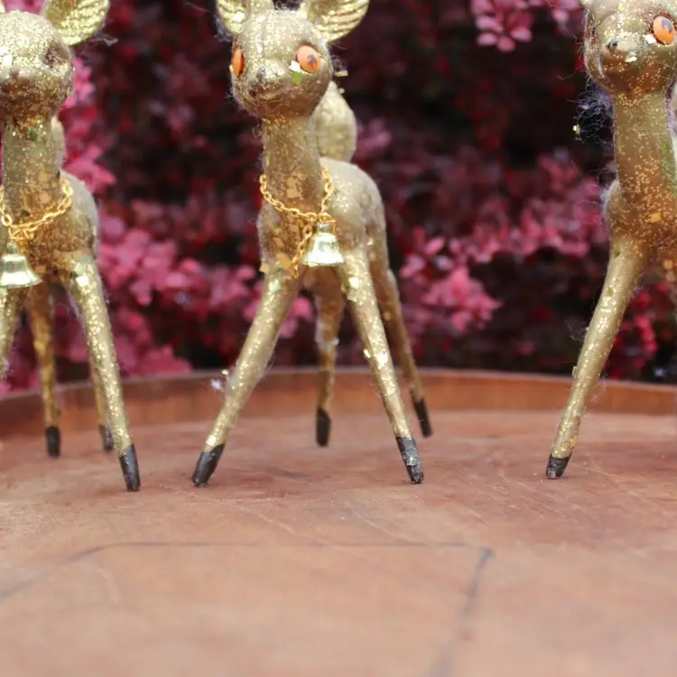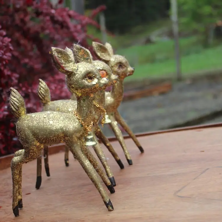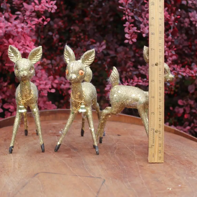 Vintage 50s Mid Century Modern Deer Statues Gold Plastic Christmas Holiday Anthropomorphic Statue A whimsical trio of deer statues in the most excellent vintage condition they are 70+ years old. These belonged to my grandmother Great to add to your or a loved ones MCM holiday collection. They have been used every christmas since 1952, so they do have vintage ware and flaws. They need some cleaning, love and repair. Please see photos.