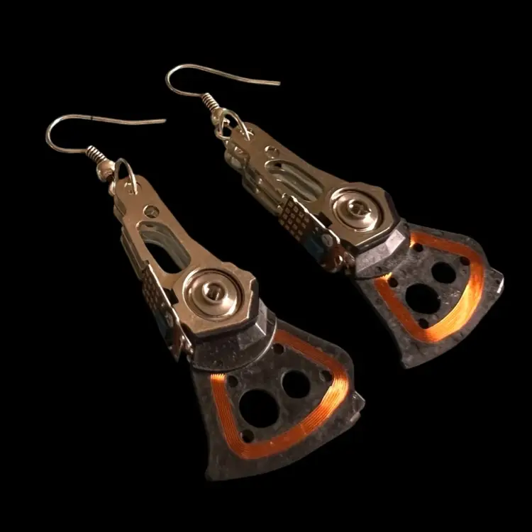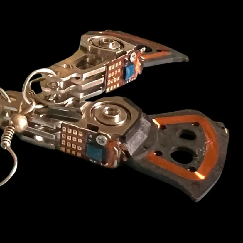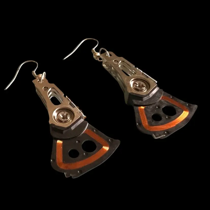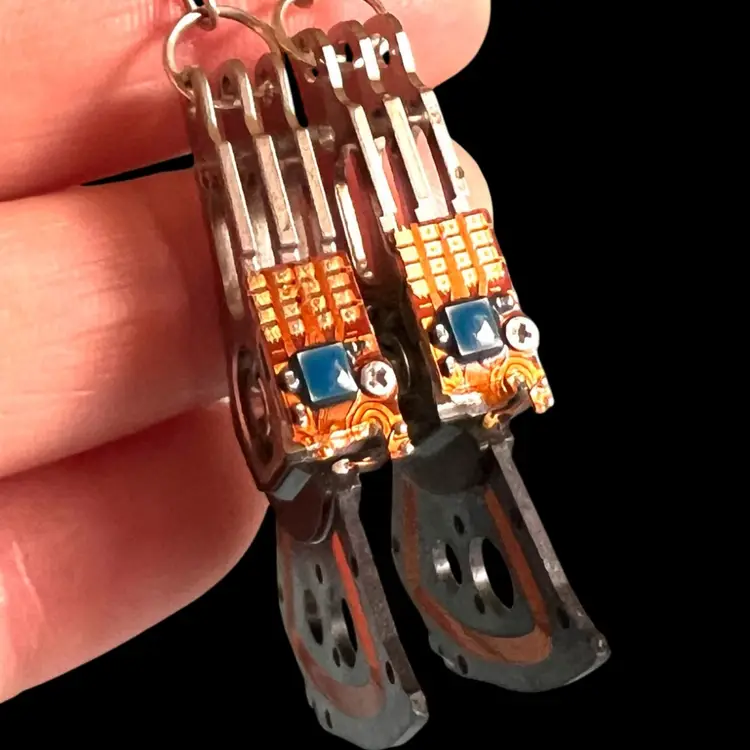 Handmade by Me 🫶 Quirky, One-of-a-Kind Earrings. Reinvented Computer Part. Recycled e-Waste from hard drive with copper wire & circuits. Silver-tone metal. 2-3/8” total drop length