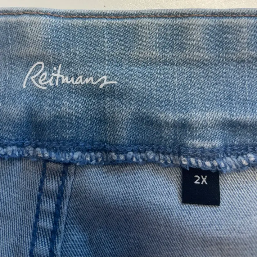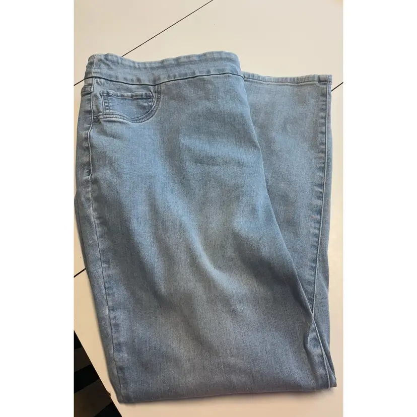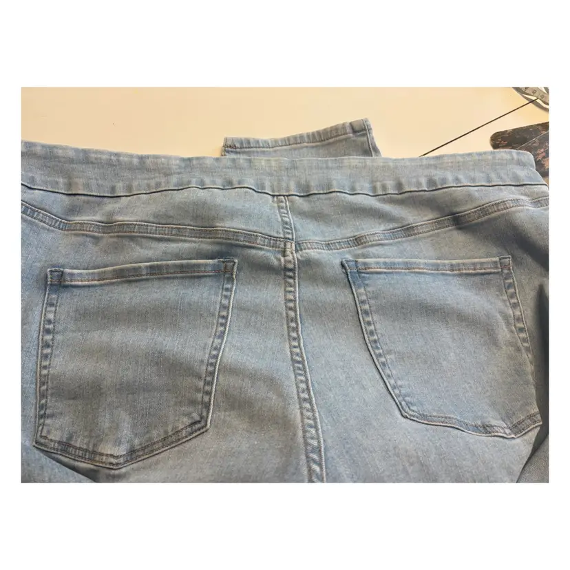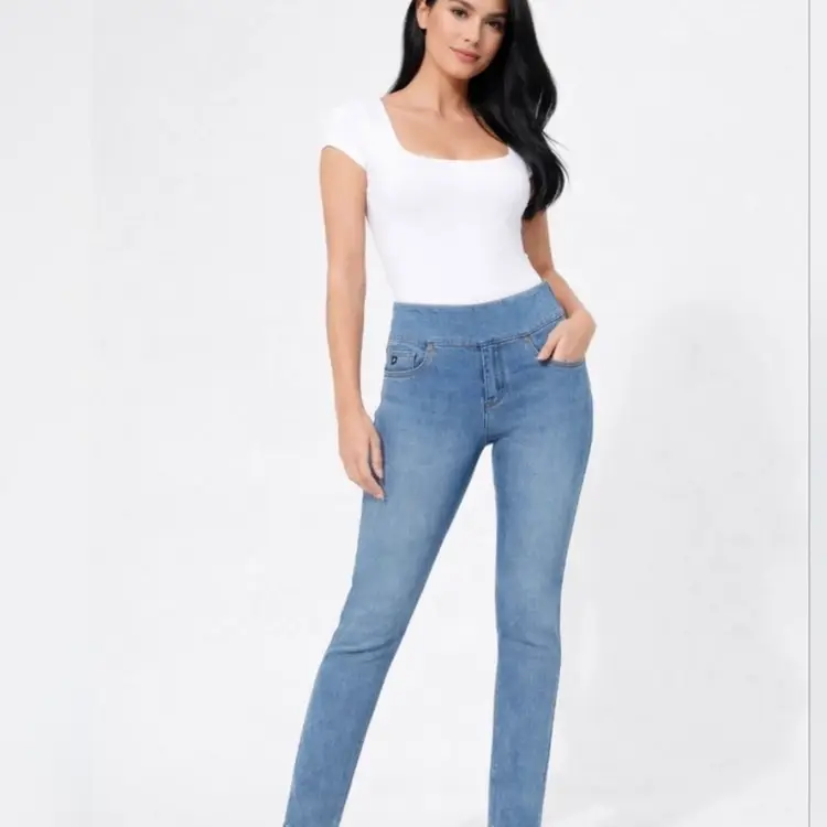 Slim high-rise jeans in a light blue wash. Stretch denim offers comfortable, form-fitting wear. Classic five-pocket look with a smooth waistband. Sleek, versatile style for everyday outfits. 20.5” - 23.5” waist, 12” rise, 25” inseam, 35.5” length.