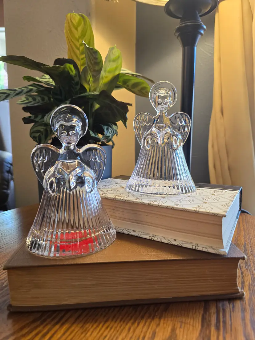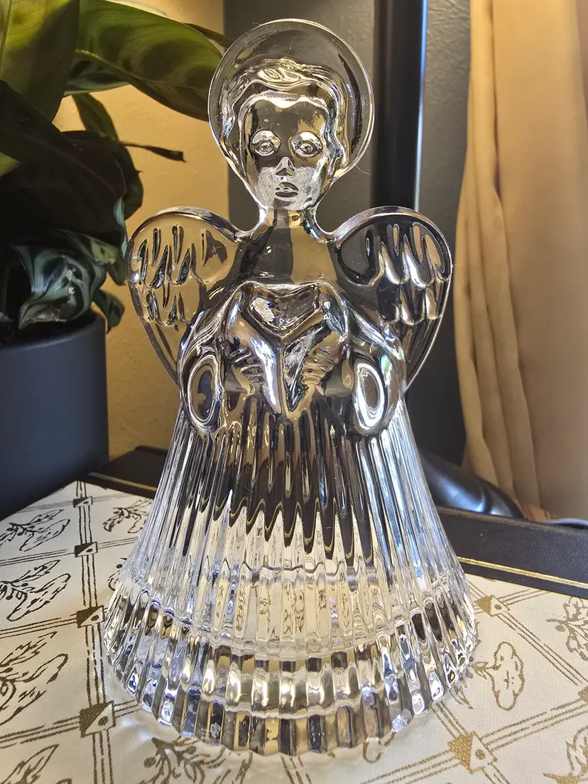 Set of 2 - The Rejoice Crystal Angel Votive/Tea Light Holder by Mikasa is a small, clear crystal candle holder in the shape of an angel. It is suitable for tealight candles and is adorned with a glossy finish. This traditional-style piece is perfect for Christmas celebrations and religious-themed occasions, adding a touch of elegance to any room. Made in China, this original Mikasa collectible is a beautiful and charming addition to your holiday decor.