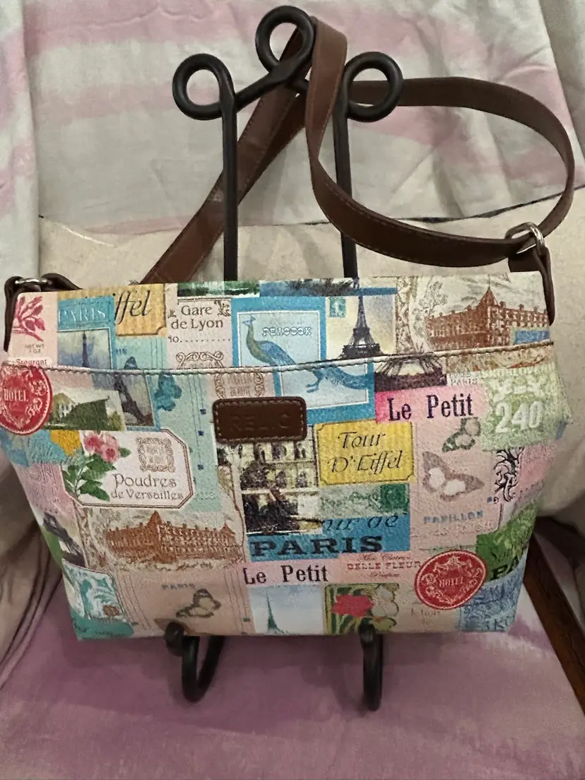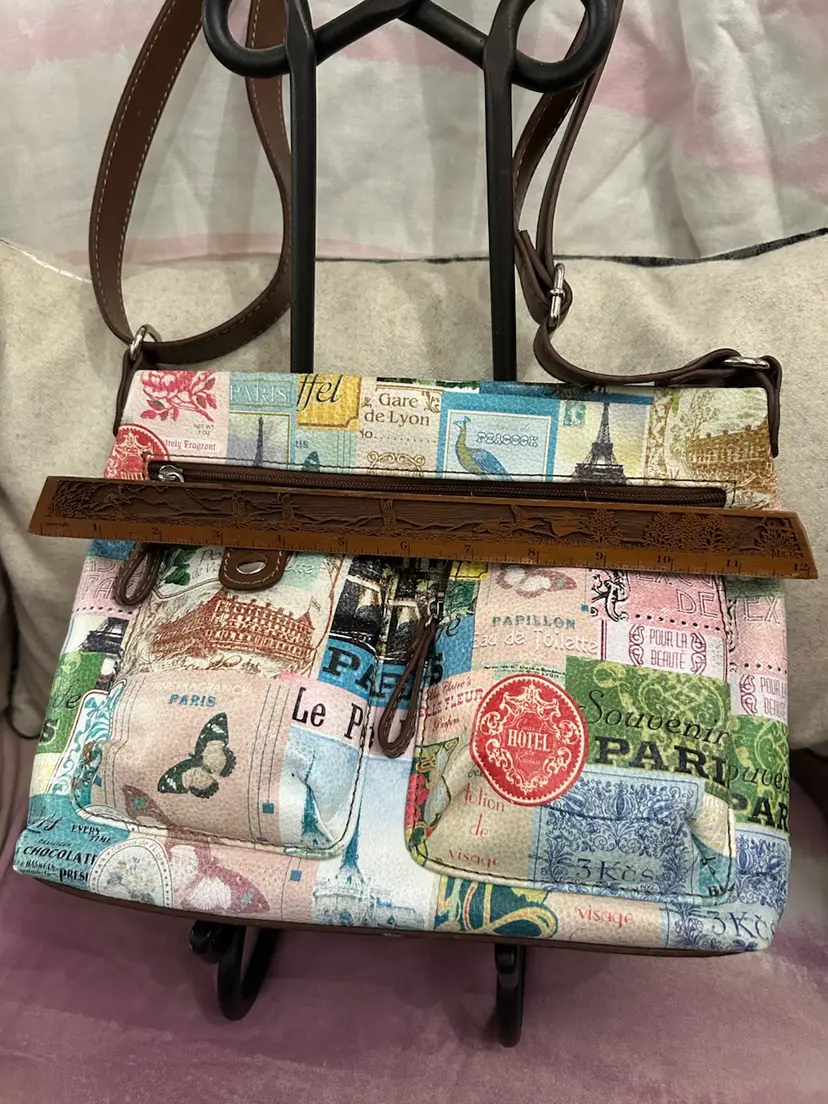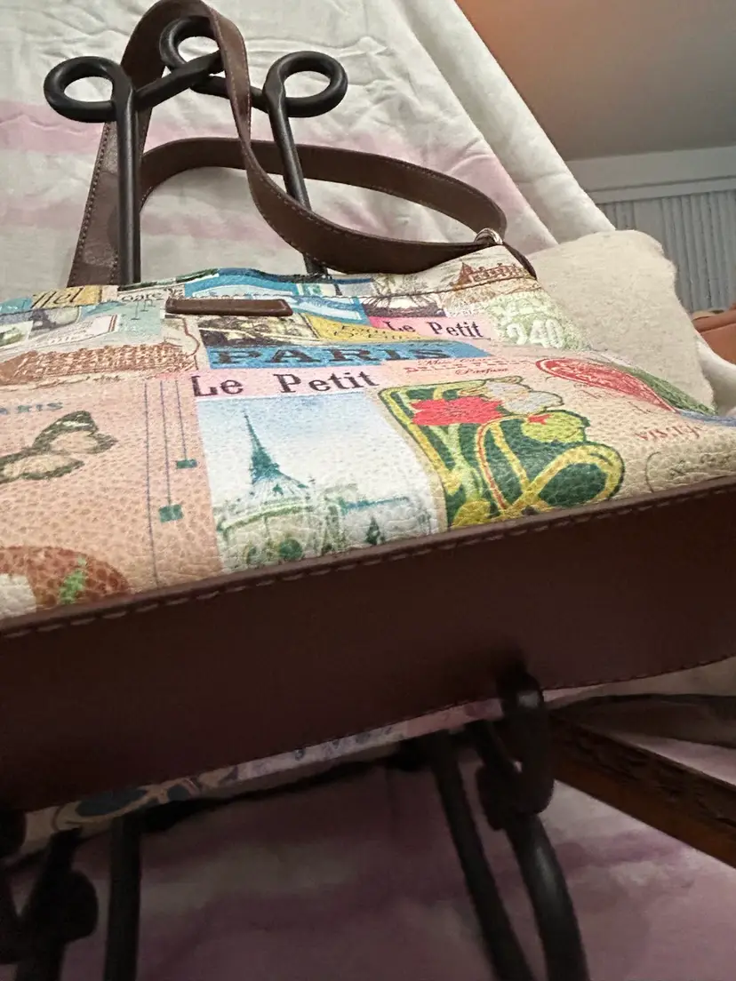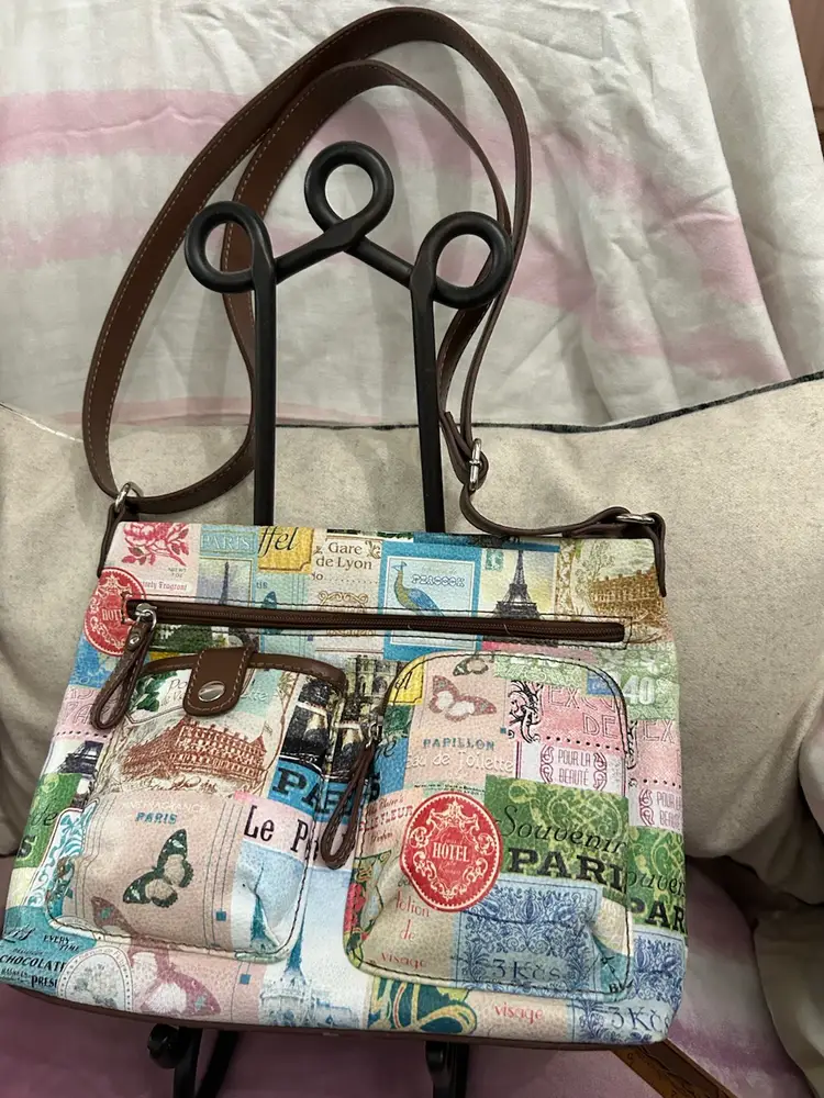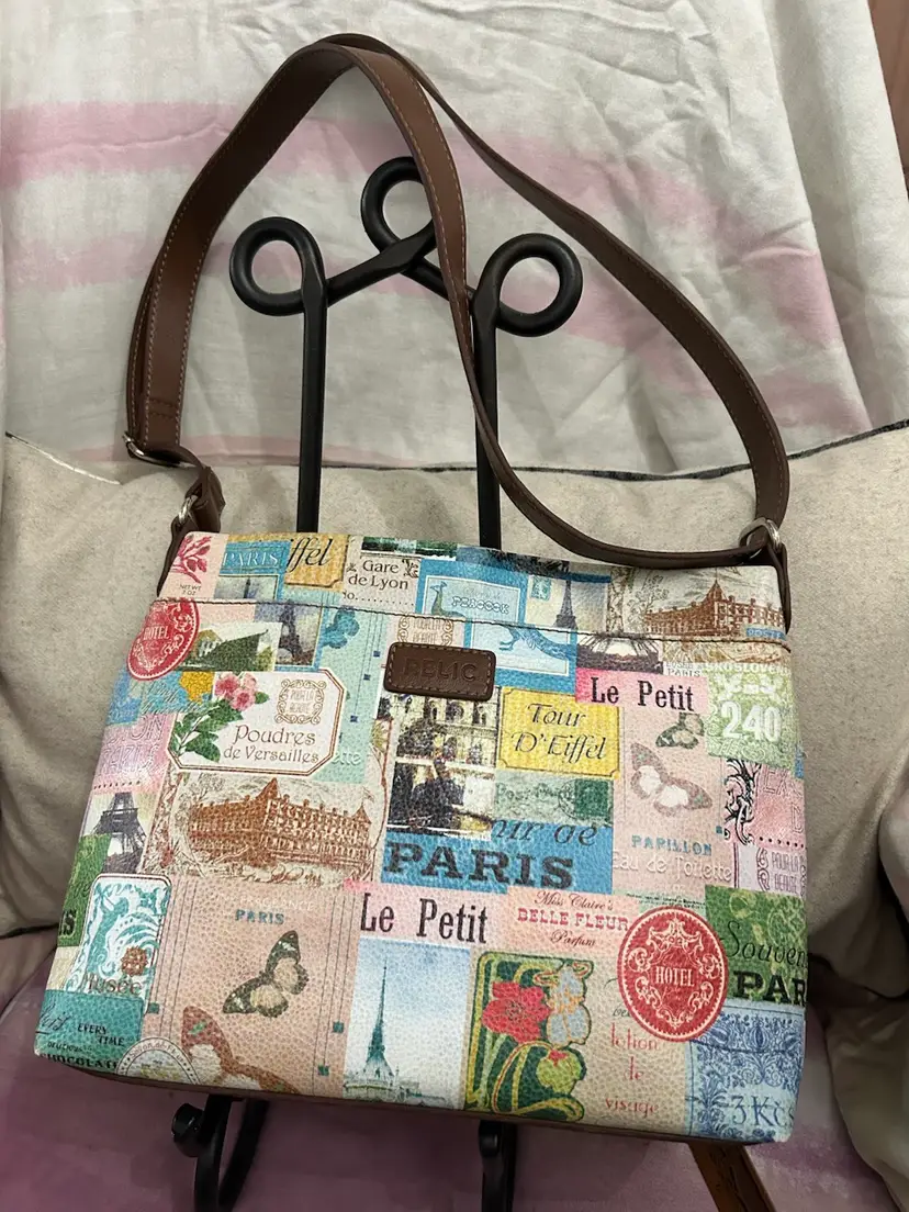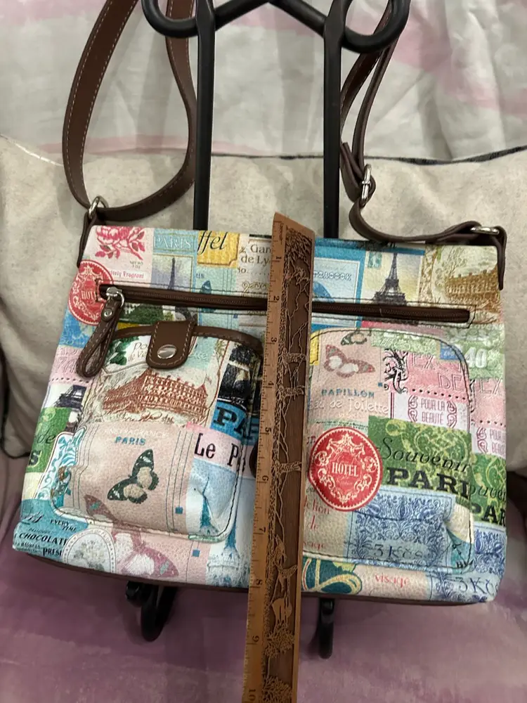Paris inspired bag Faux brown leather trim with multicolored print for the main body. Zipper on front with one zipper pouch and one with snap closure. So many storage options with this one. The young and young at heart will love this bag. New condition…no wear anywhere Measures approximately 12” x 8”