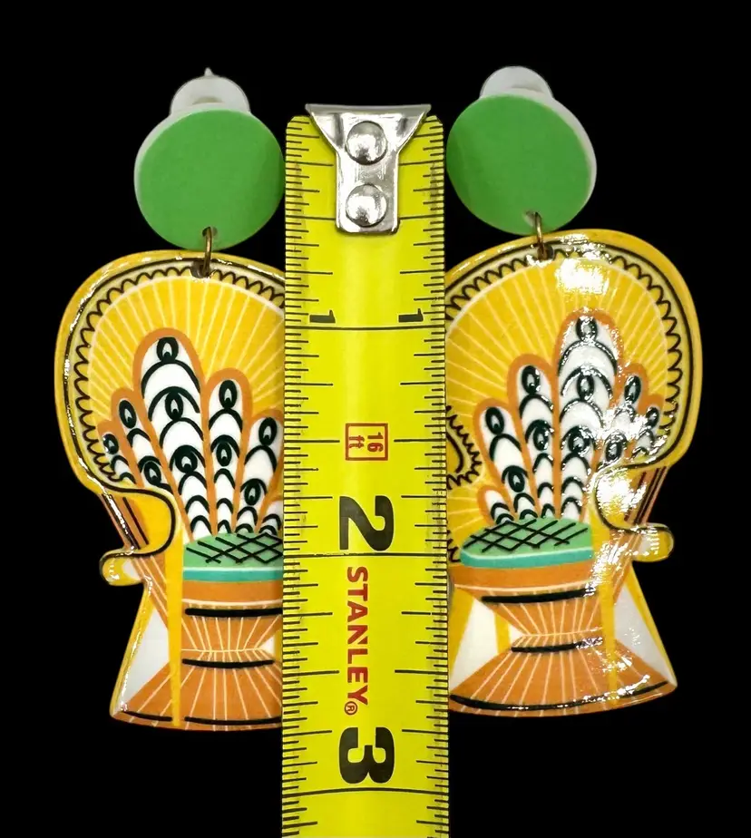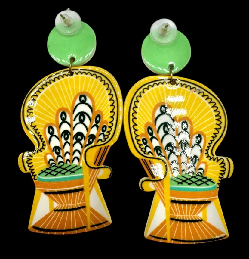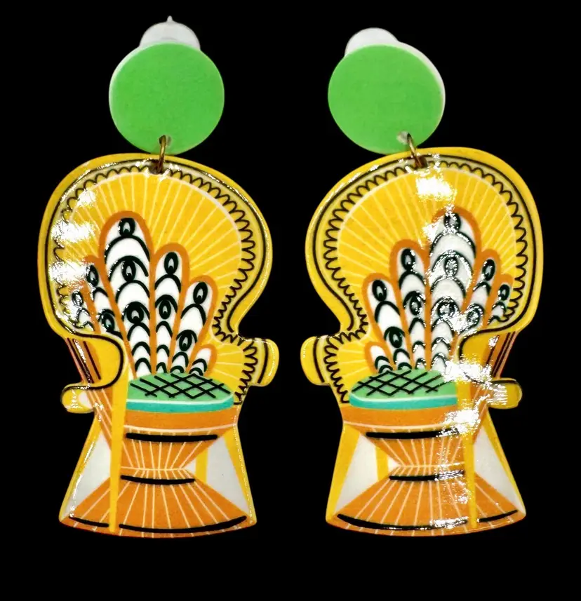 Acrylic earrings shaped like wicker peacock chairs. They have a post back.