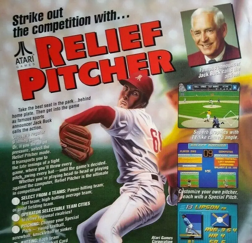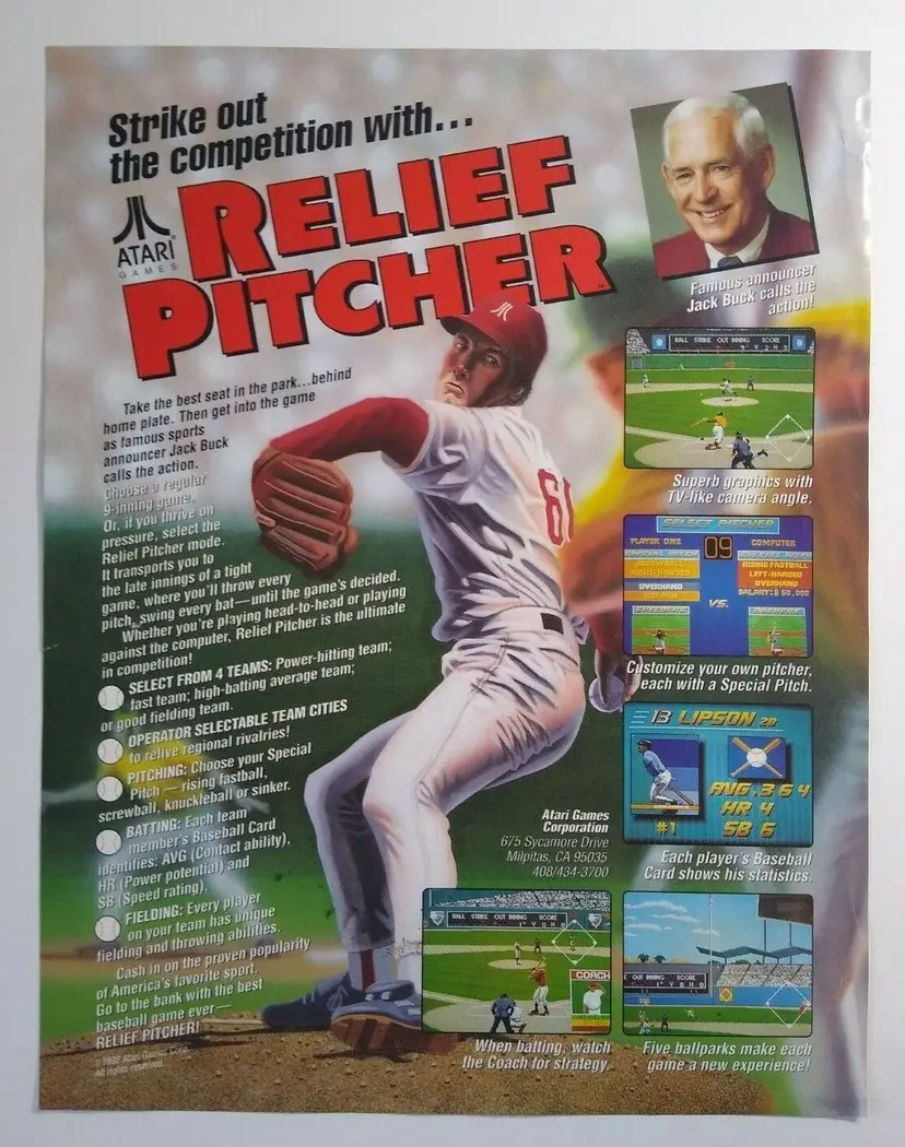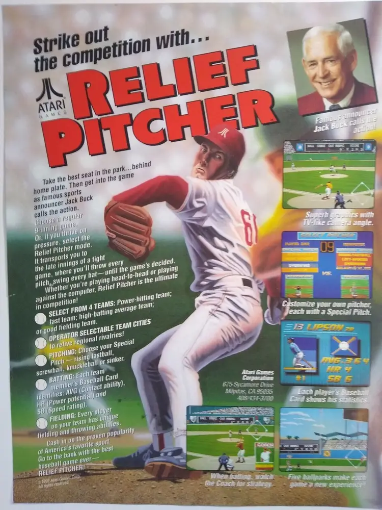 Arcade: Flyer Theme: Retro Gaming Modified Item: No Country/Region of Manufacture: United States Original/Reproduction: Original Year: 1992 Game Title: Relief Pitcher Brand: Atari