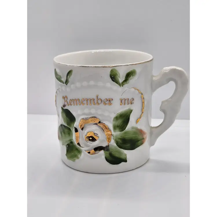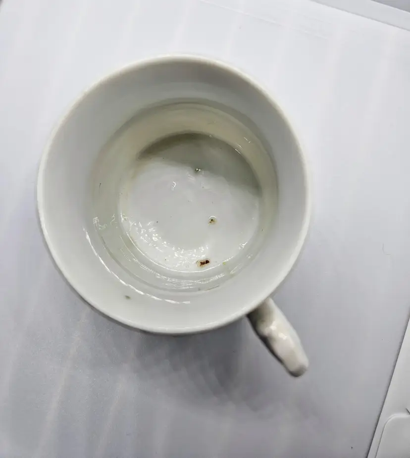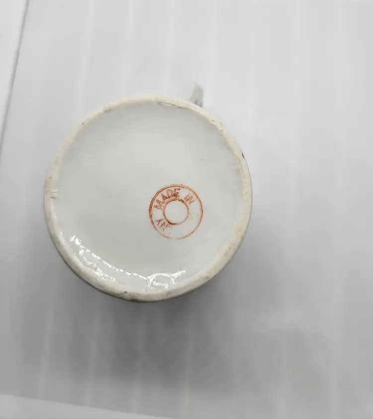 This is a small 2 1/2 inch high cup made in Germany. The inside has a brown spot that seems to be where the paint has chipped off.