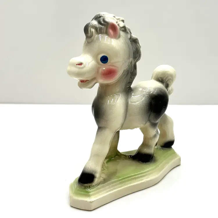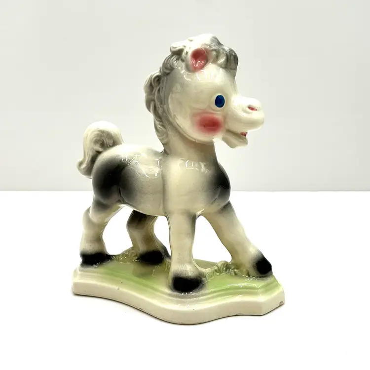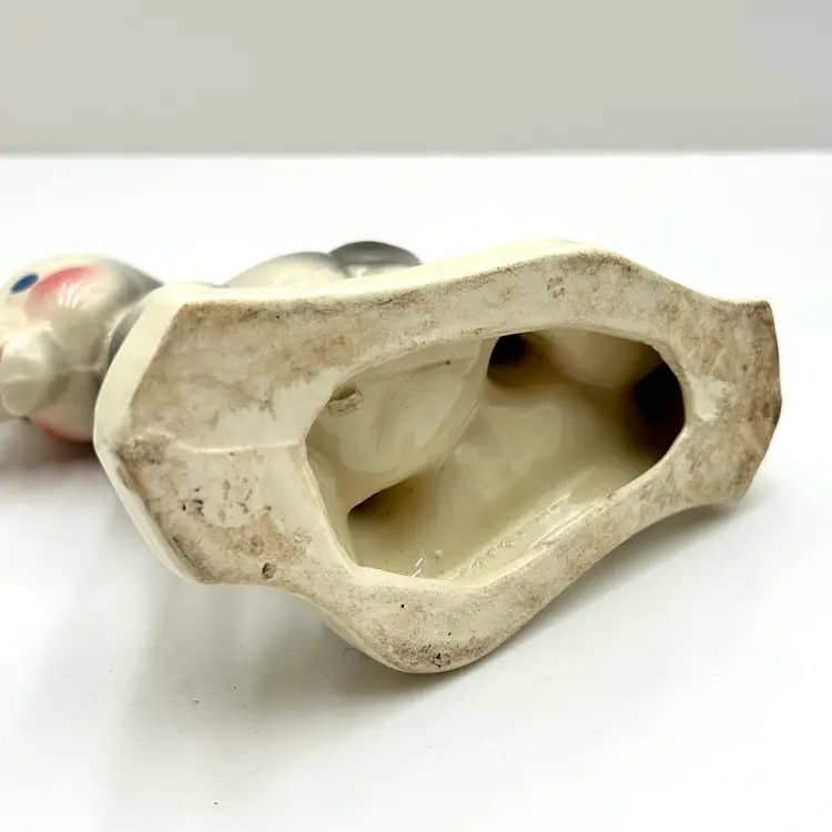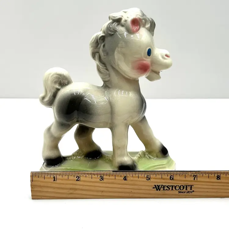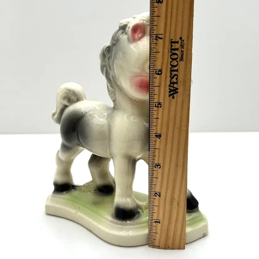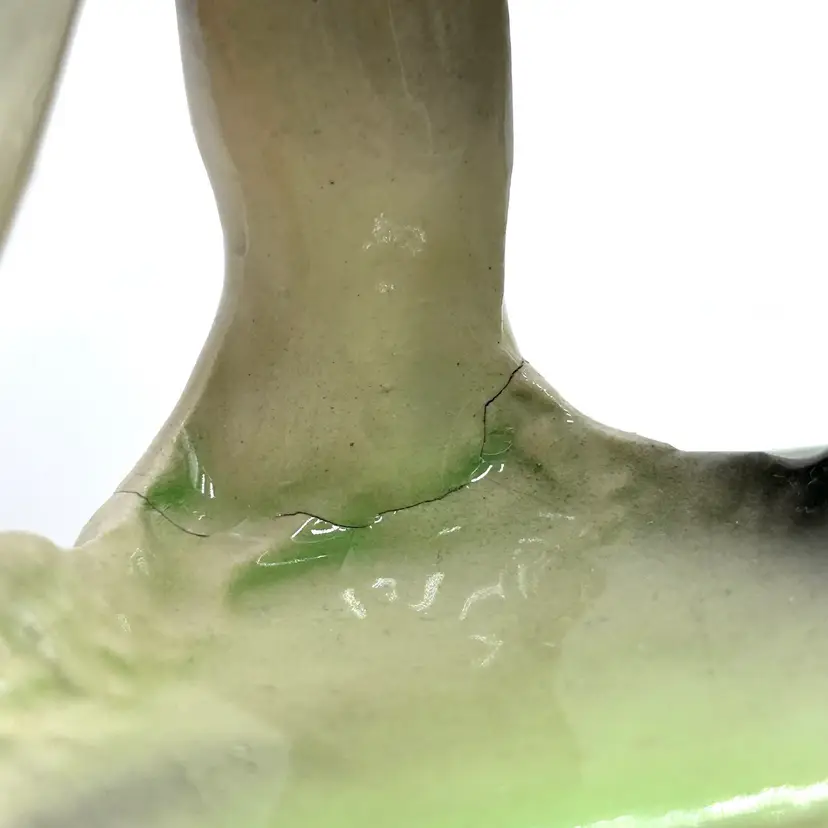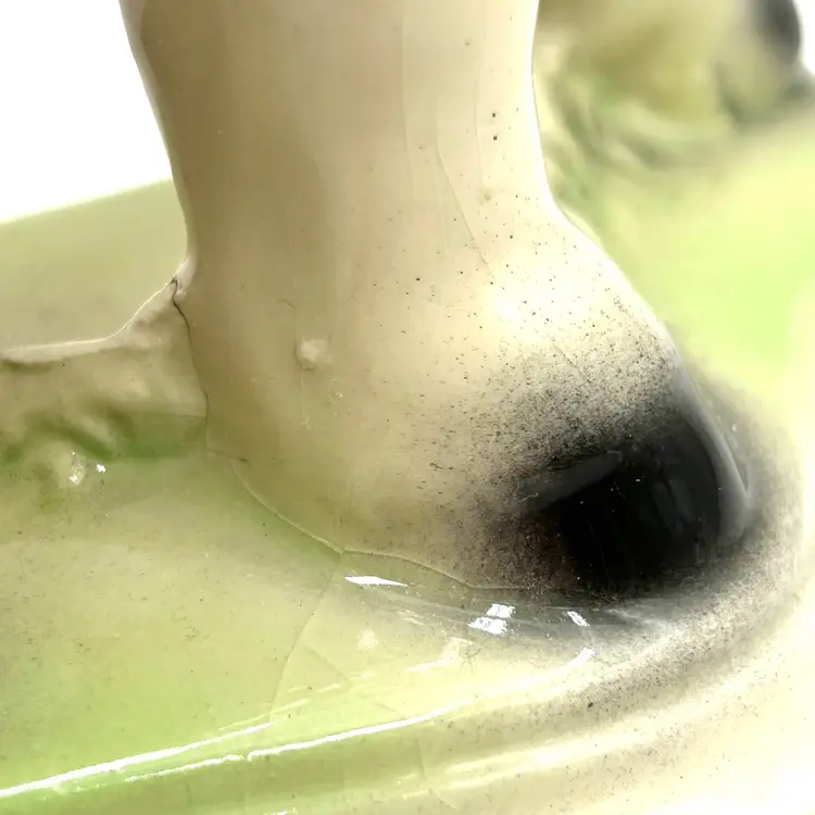 As shown 7.5 inches tall and 6 inches long Crack on inside of leg does not go all the way around. No chips. Some crazing.