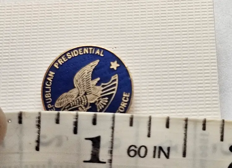 The Republican Presidential Task Force Pin in Gold Tone is a collectible item that commemorates the Republican National Convention. Made of metal, this pin features the emblem of the Republican Party and is a symbol of political affiliation. This historical memorabilia piece from the United States is a unique addition to any political memorabilia collection, showcasing support for the Republican Party during a significant event.