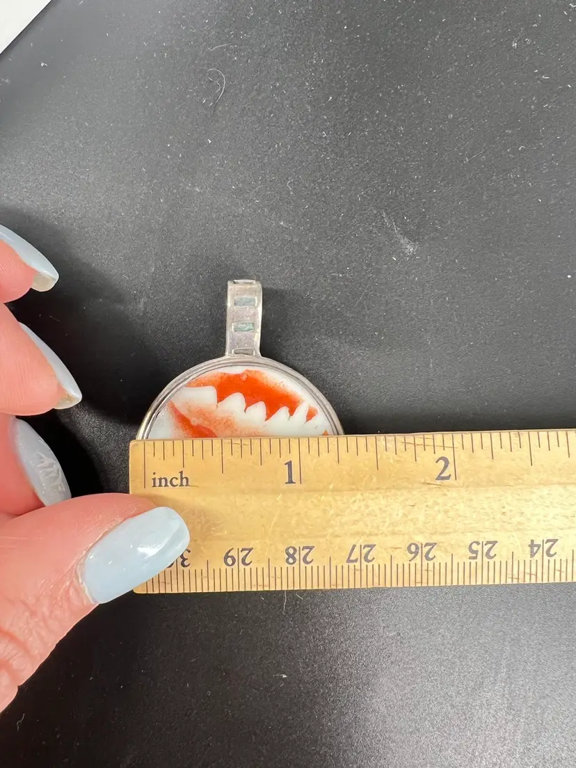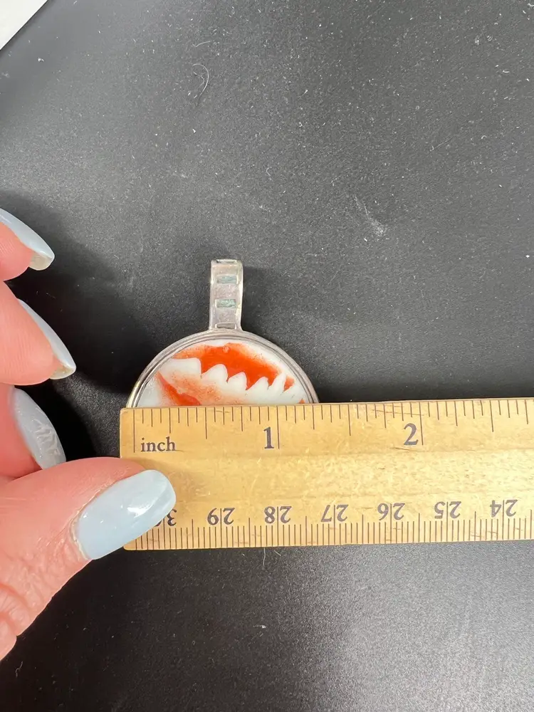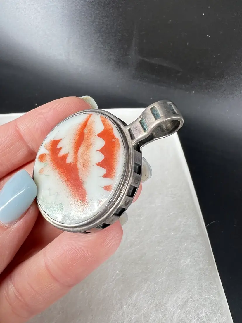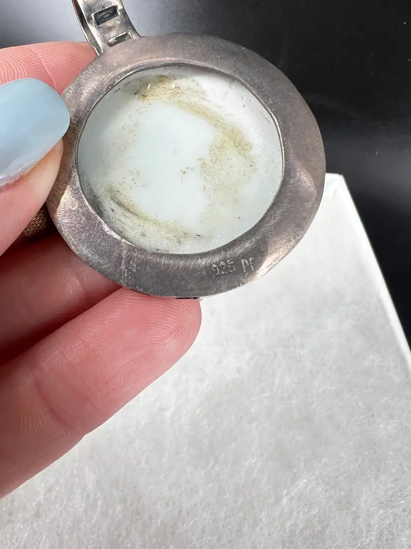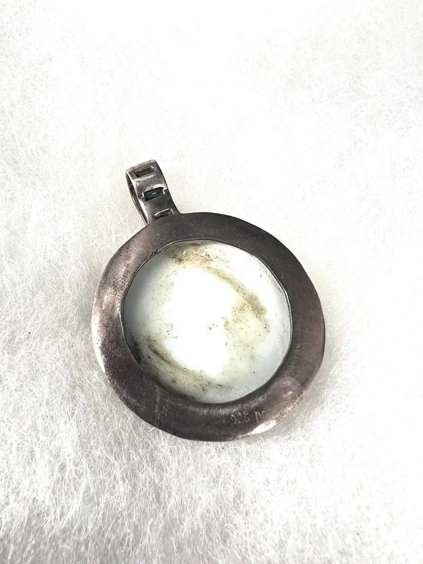This pendant is made from ceramic—presumably a plate or vessel that was repurposed. It is set in sterling. It measures 1.25” wide.
