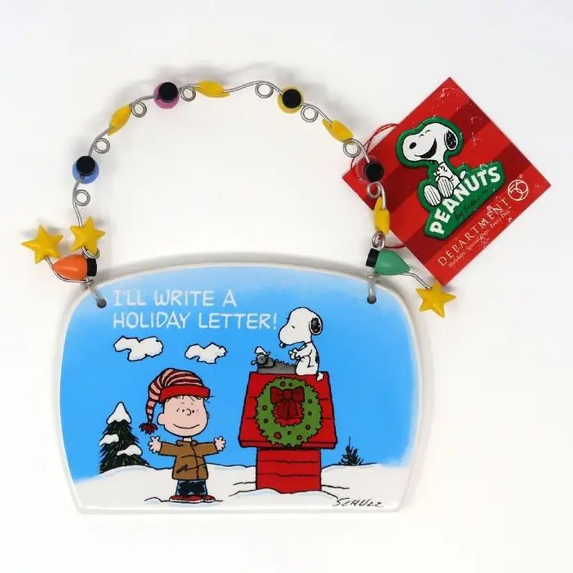 Celebrate the holidays with this charming Rerun & Snoopy ornament or wall decor. Featuring Rerun promising to write a holiday letter and Snoopy atop his iconic doghouse, this piece is perfect for any Peanuts fan. It adds a festive touch to your collection. Comes with a colorful beaded hanger and original tag.