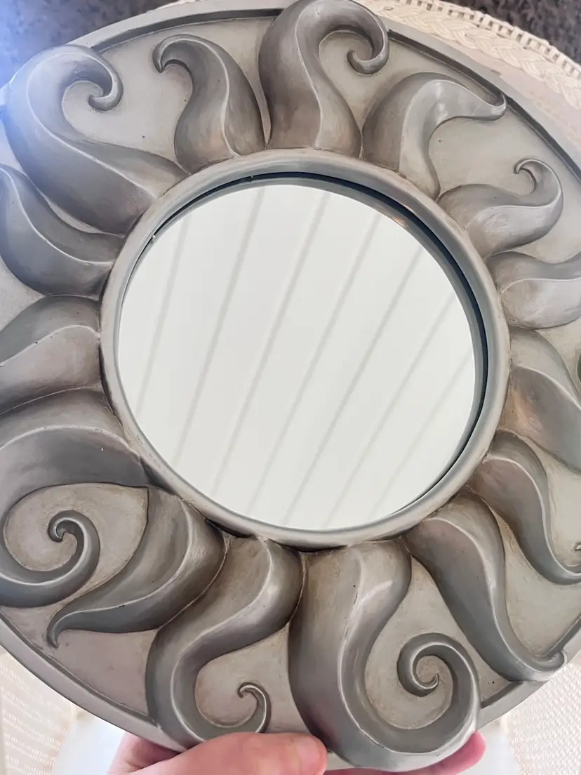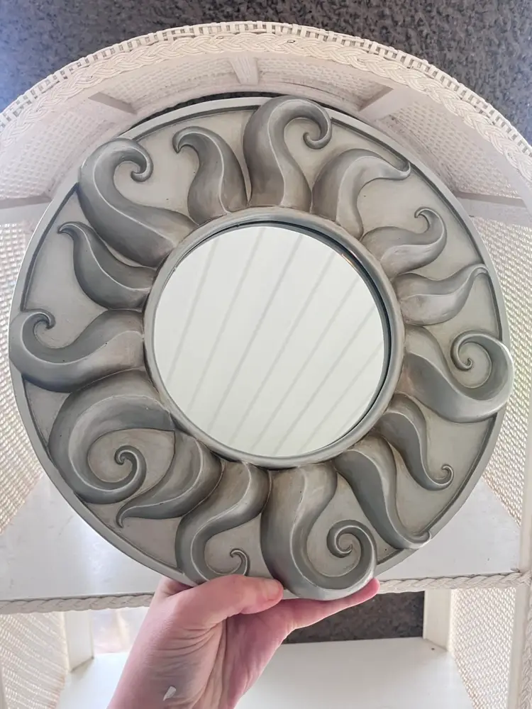 Beautiful vintage resin silver tone 3D Sun mirror wall hanging some minor discoloration around inner corners of the sun 12”